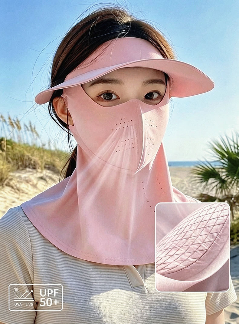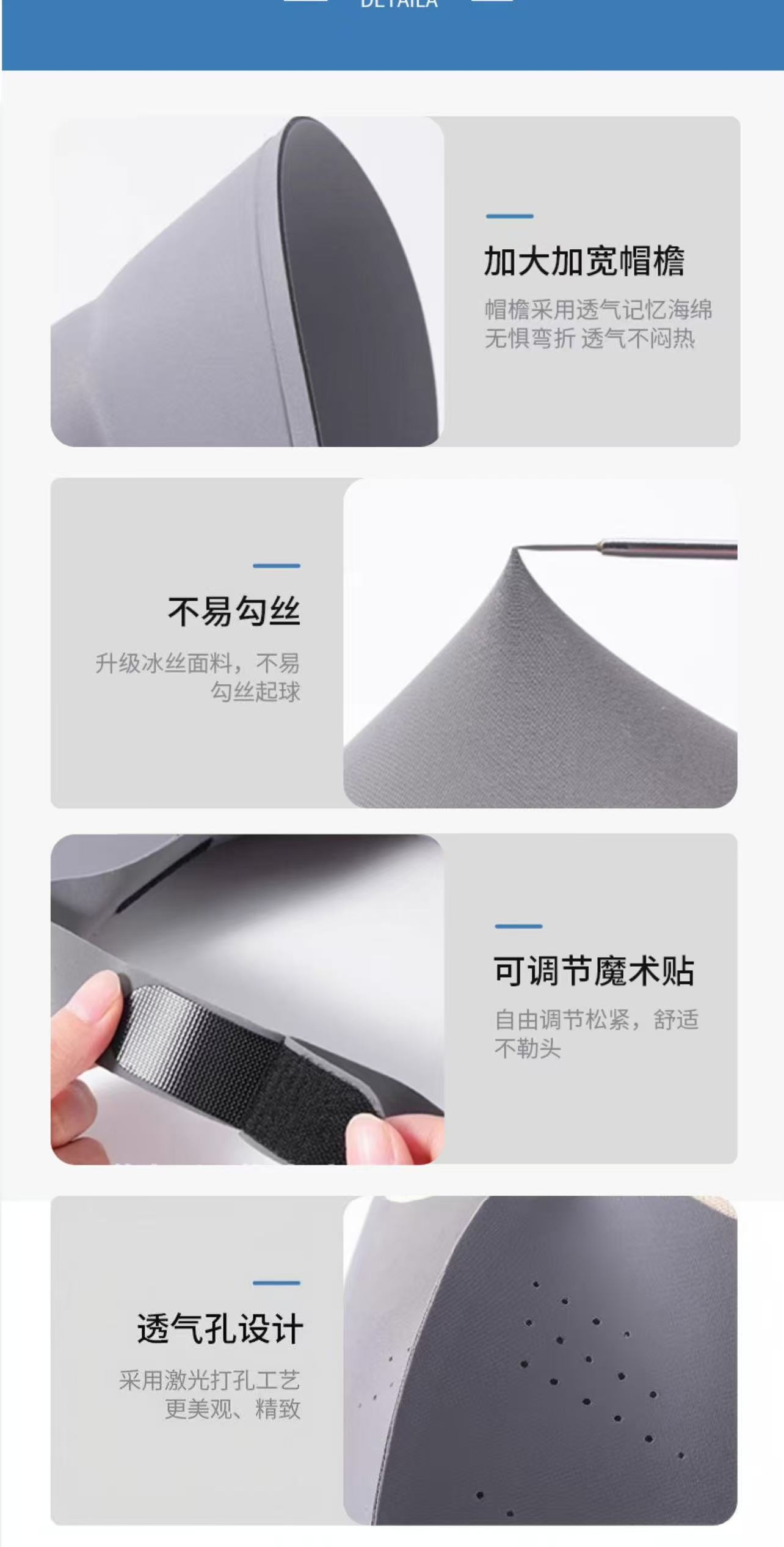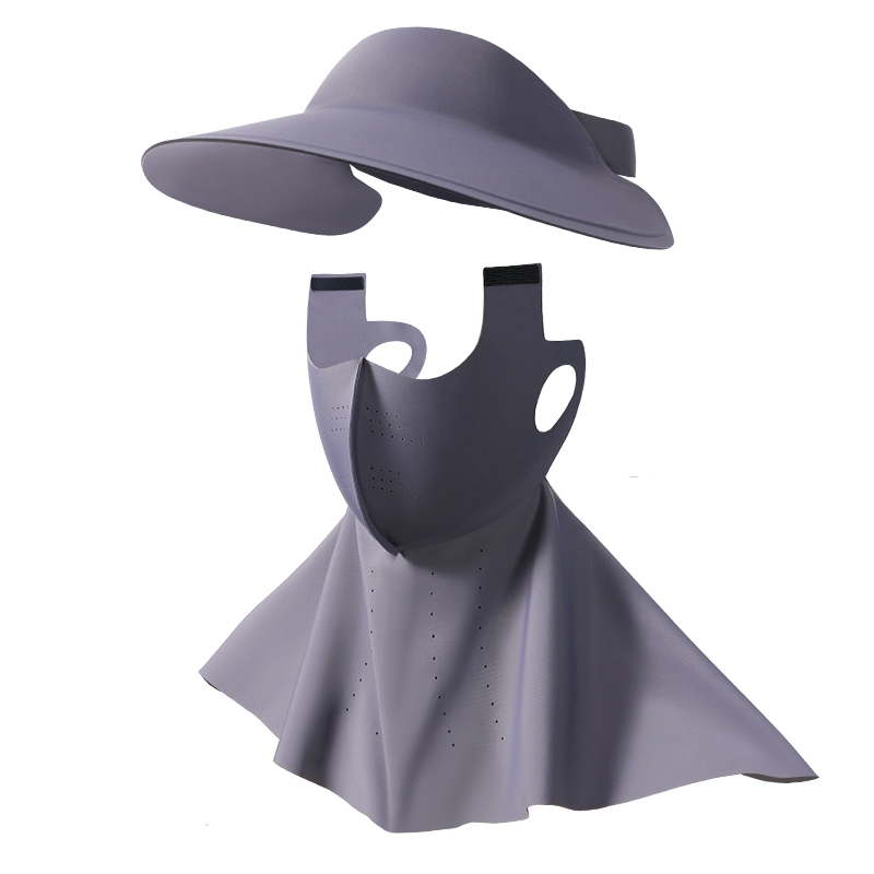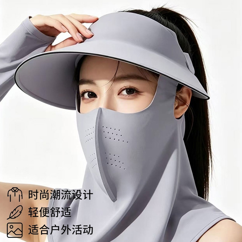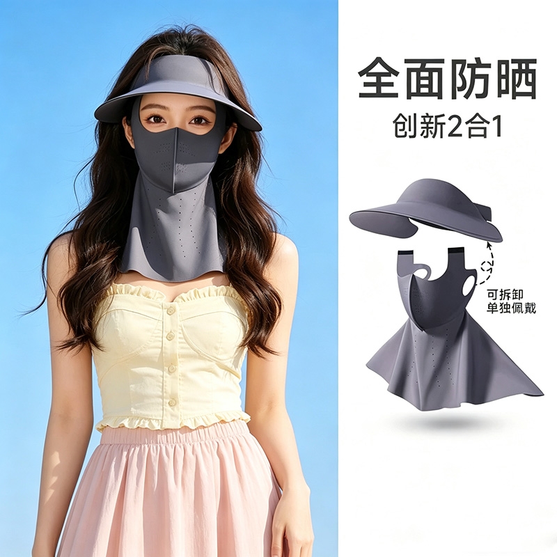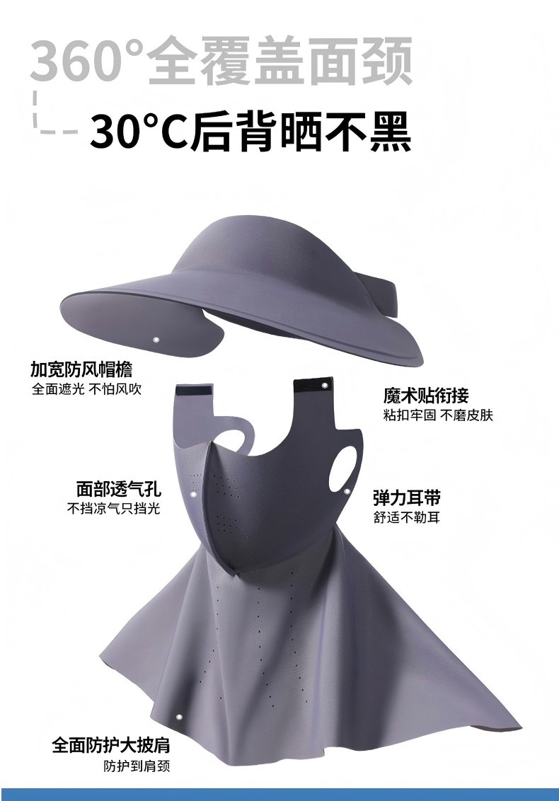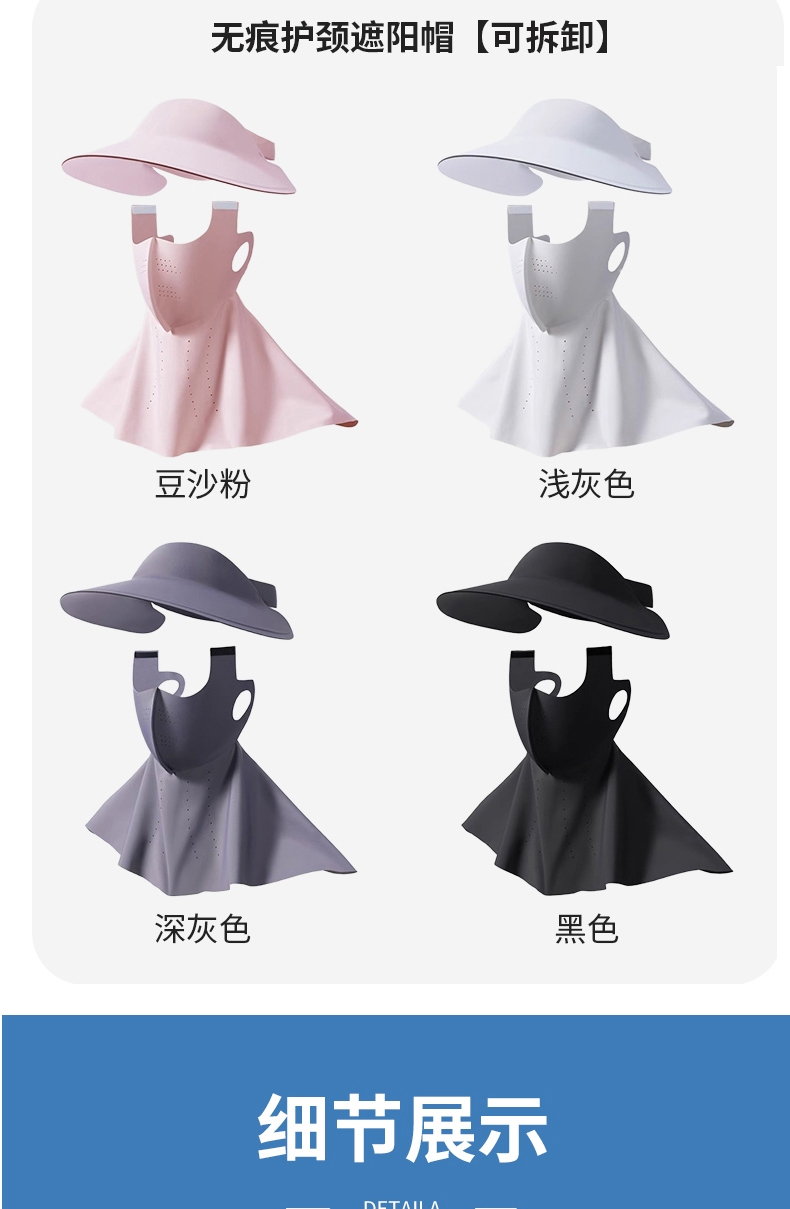 可拆卸加长护颈防晒面罩套装,防晒更全面;采用锦纶科技凉感面料制作,凉感透气性更好;无痕裁剪,佩戴服帖,柔软亲肤 遮阳帽可调节魔术贴设