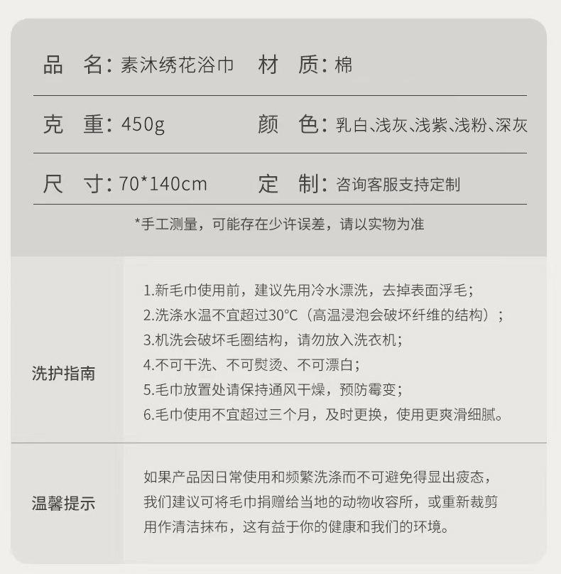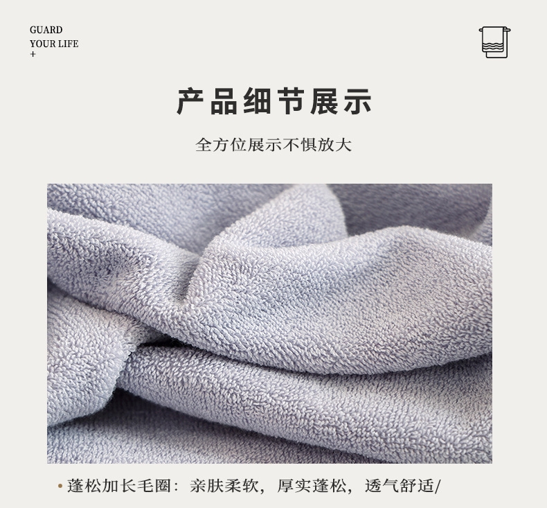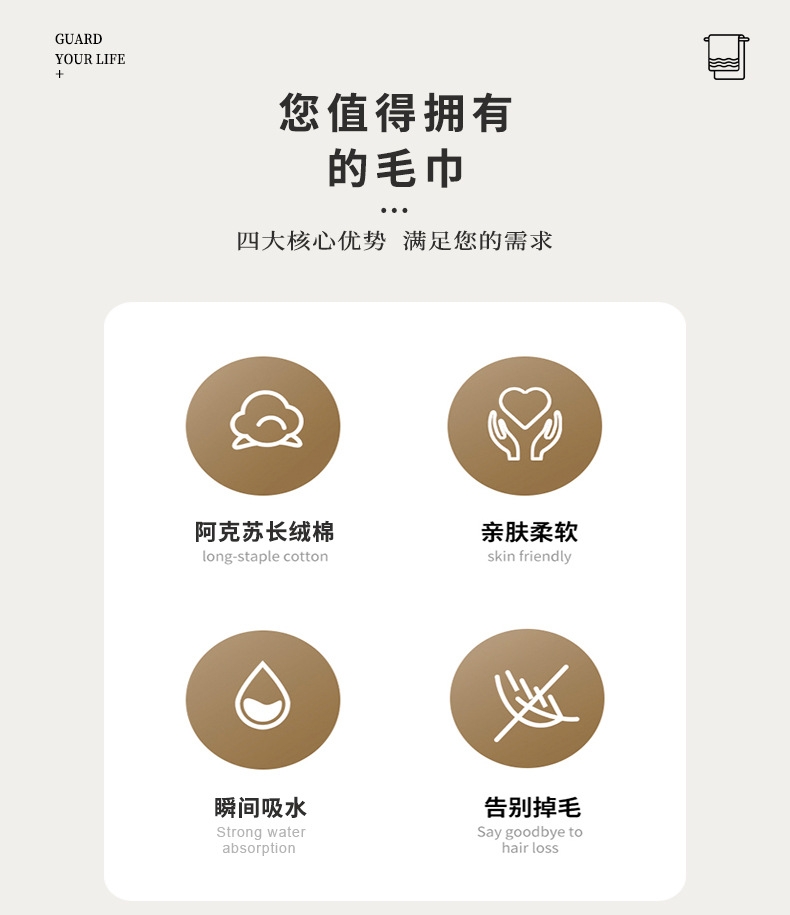 细腻柔软,亲肤不糙;吸水透气,干爽舒适;紧实耐用,不易掉毛