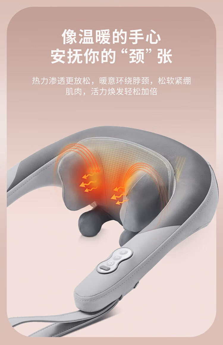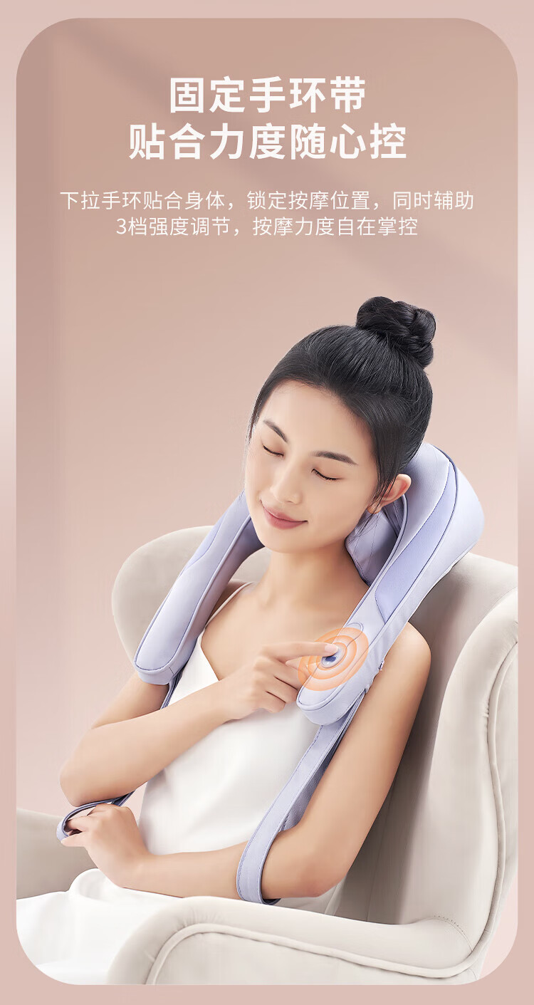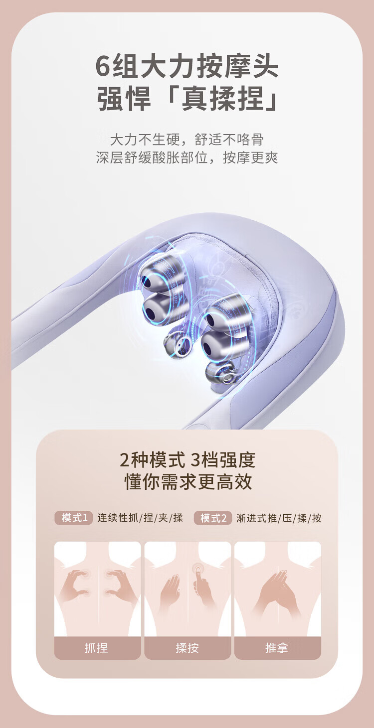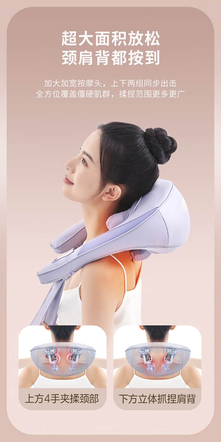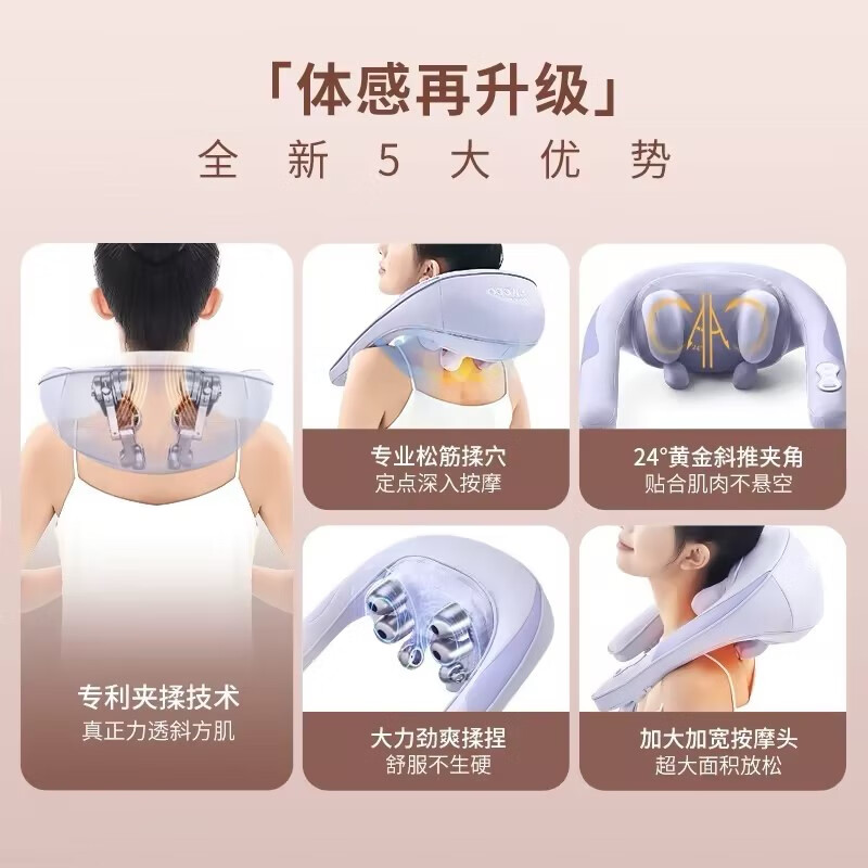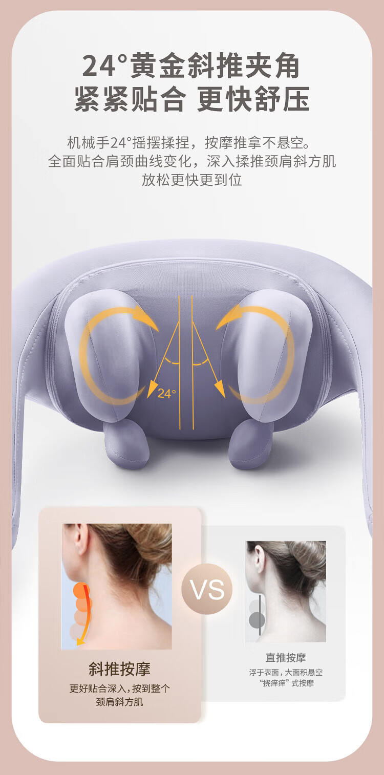 八字夹揉技术;24°黄金斜推夹角,紧紧贴合,更快舒压;超大面积放松,颈肩背都按到