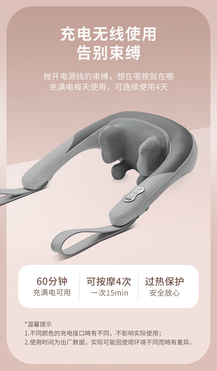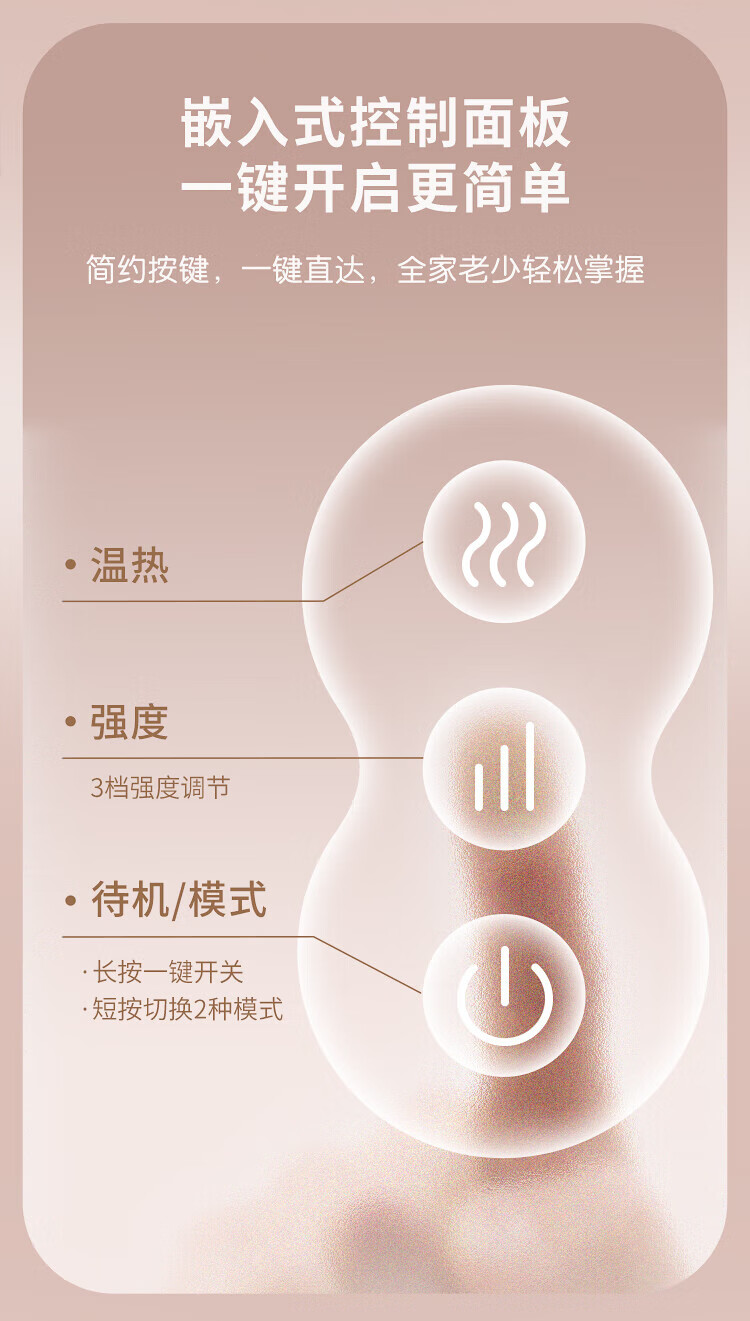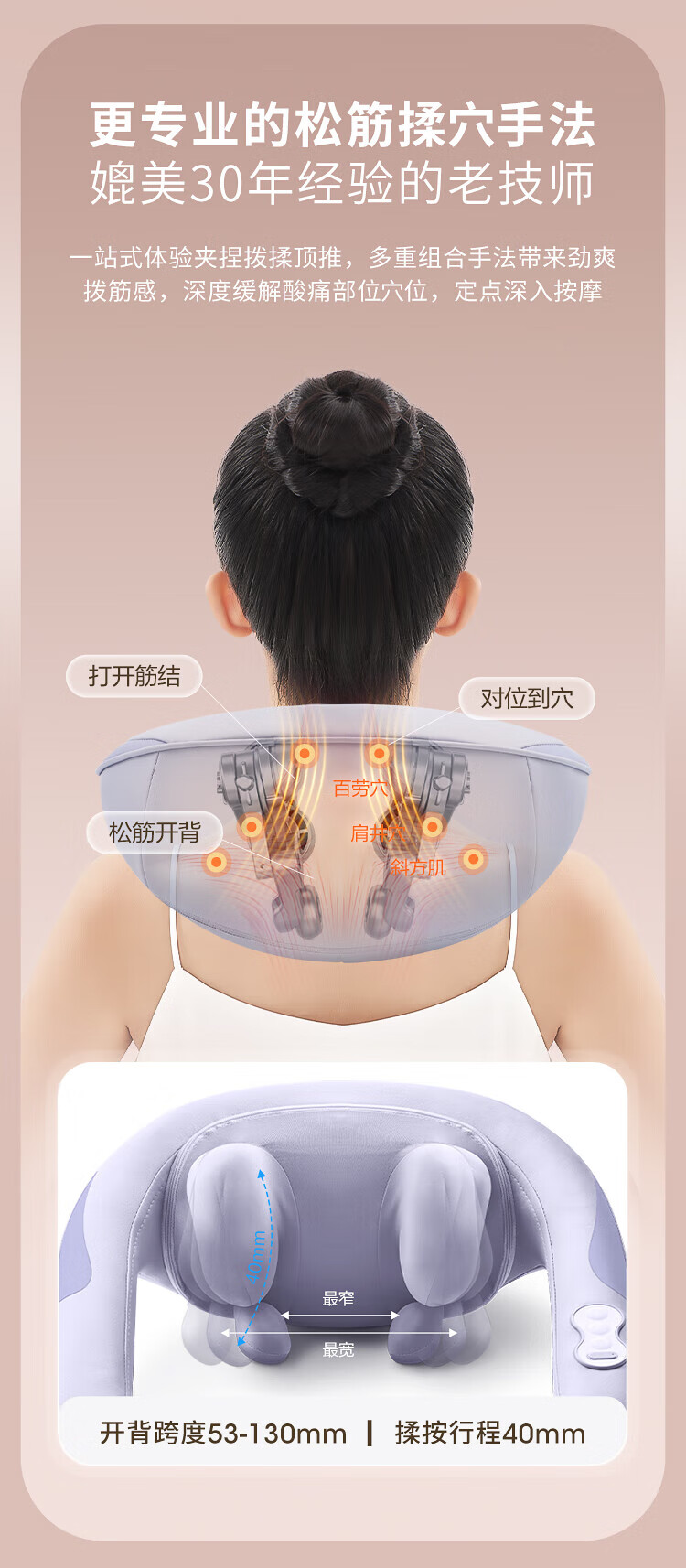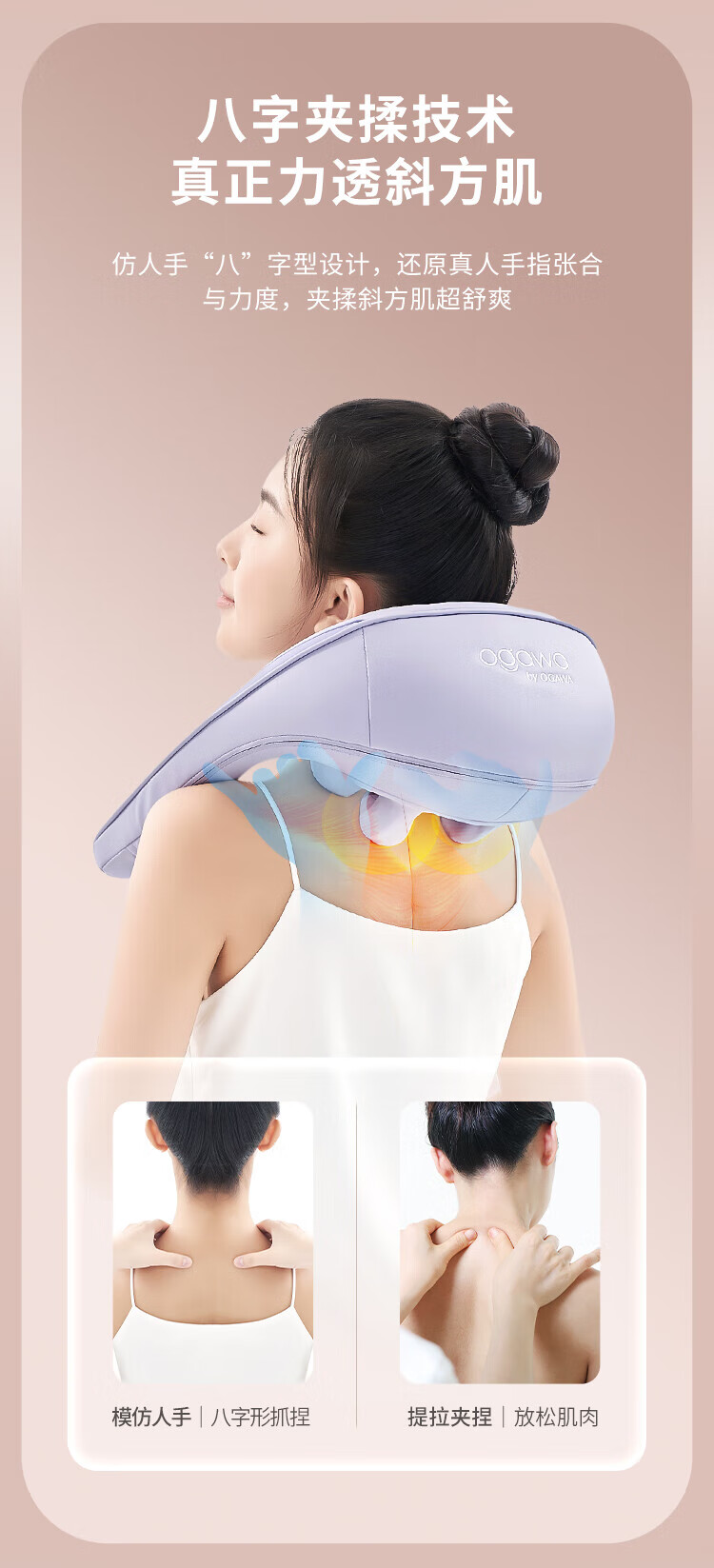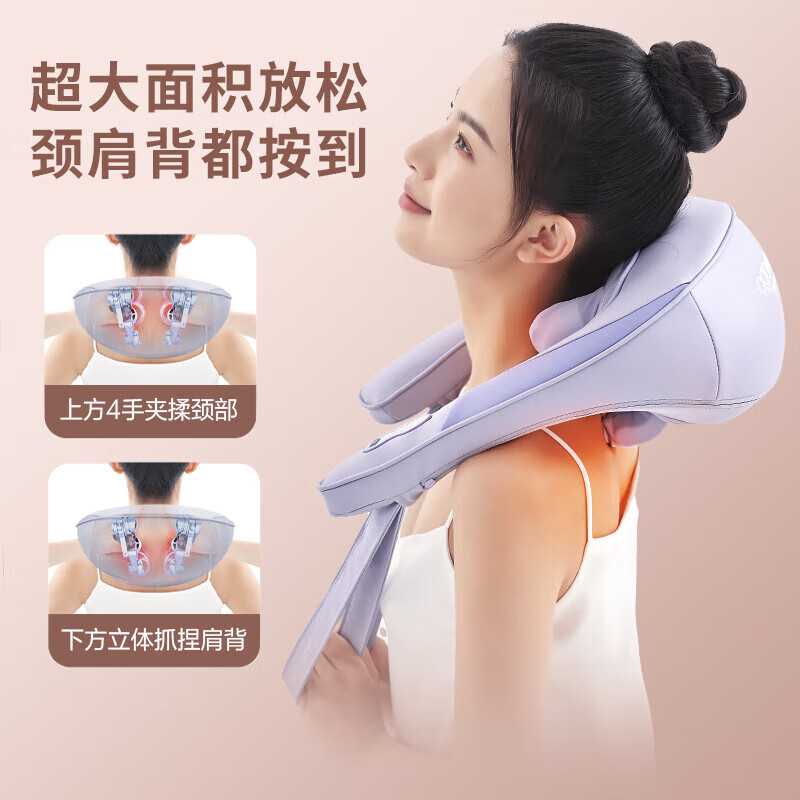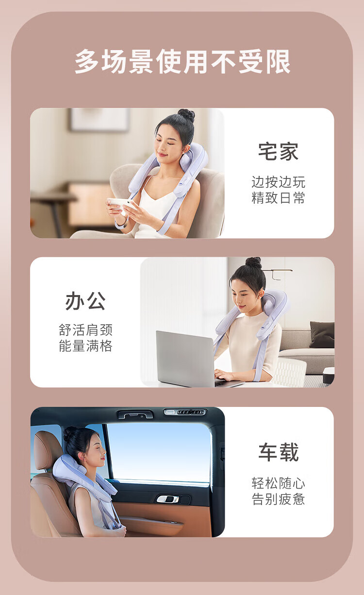 八字夹揉技术;24°黄金斜推夹角,紧紧贴合,更快舒压;超大面积放松,颈肩背都按到