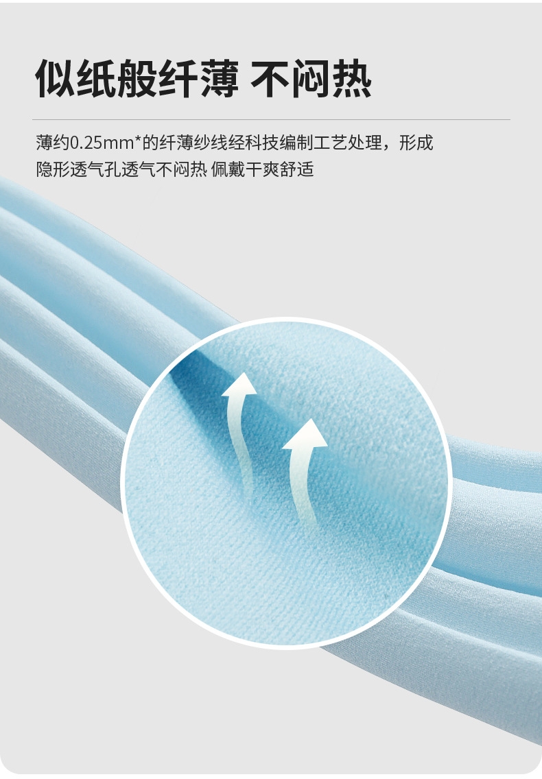 .采用锦纶功能性纱线制作,凉感透气吸汗性更好,不易;产品自带接触性凉感,(不添加冷感助剂);360度无缝编织技术,弹性大,无勒感,久用不易变形