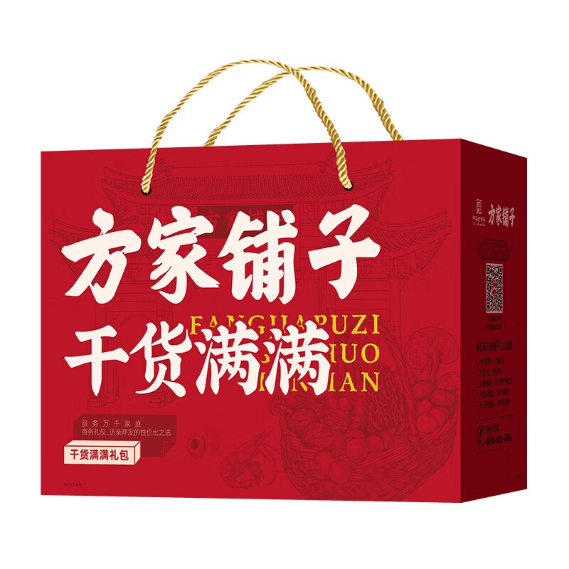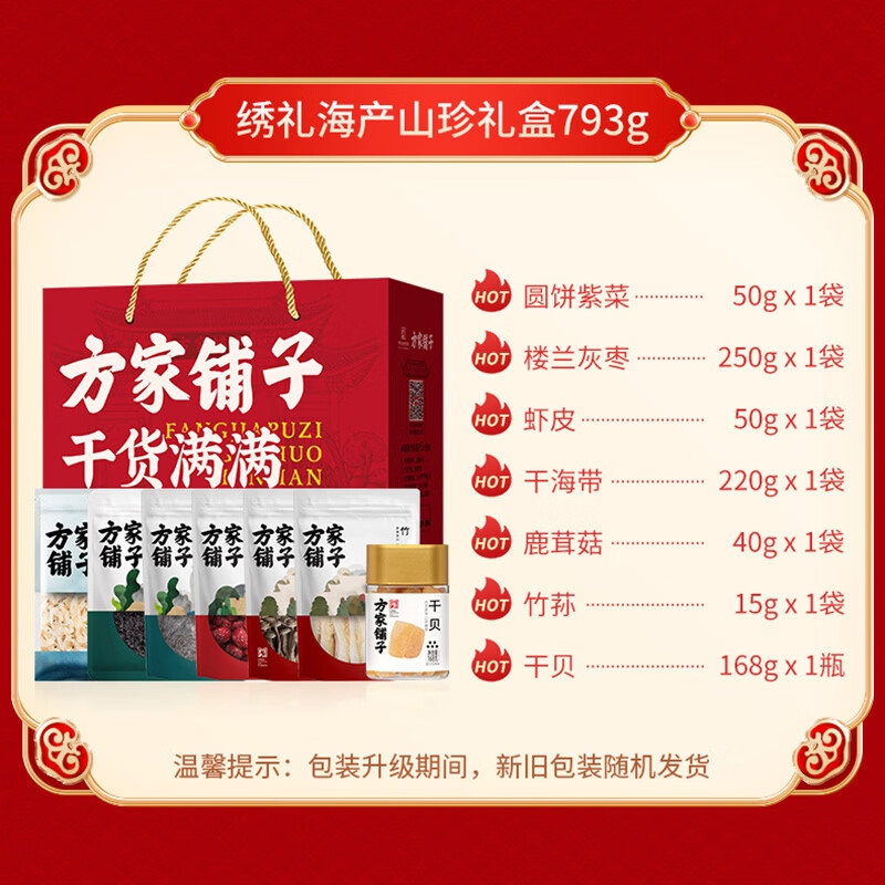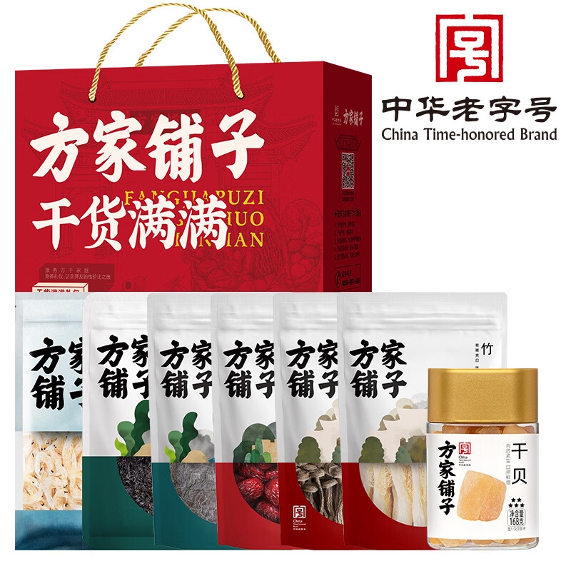 - 配置:【方家铺子】鹿茸菇40g/袋装 【方家铺子】圆饼紫菜50g/袋装 【方家铺子】虾皮50g/袋装 【方家铺子】干海带220g/袋装 【方家铺子】竹荪15g/袋装 【方家铺子】四星楼兰灰枣250g/袋装 【方家铺子】干贝168g/瓶装
