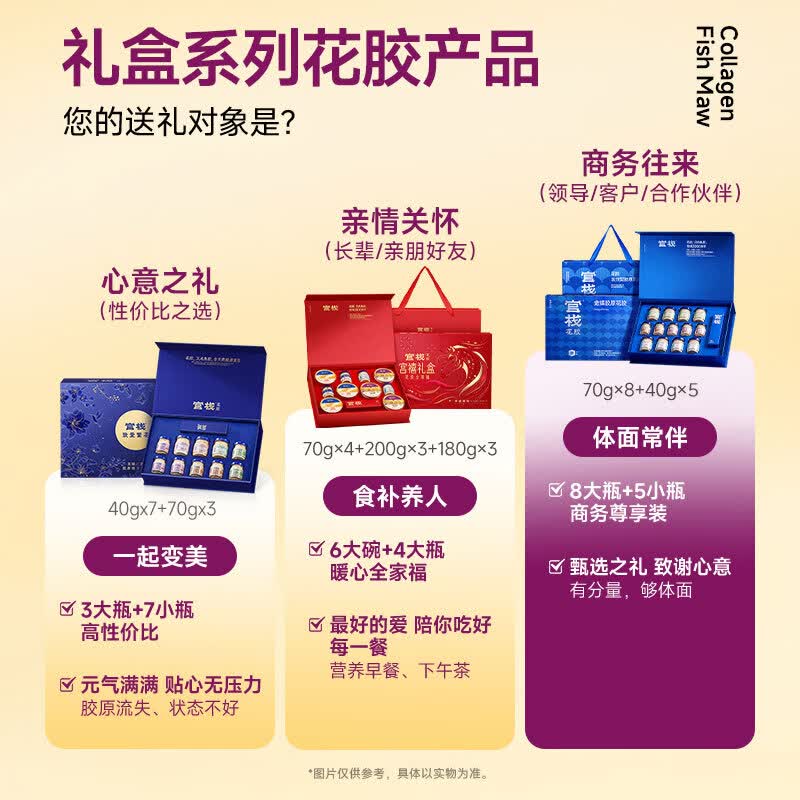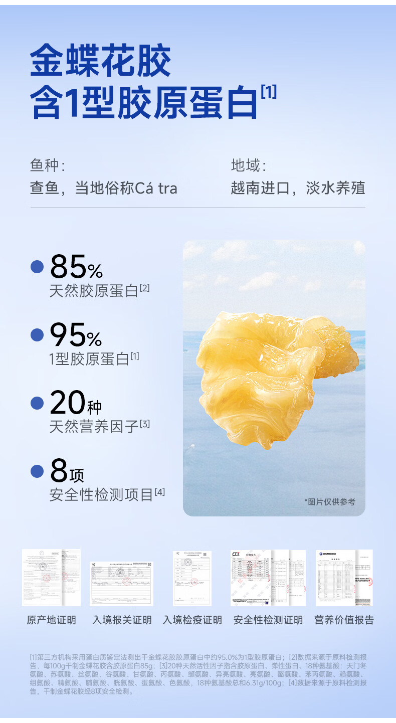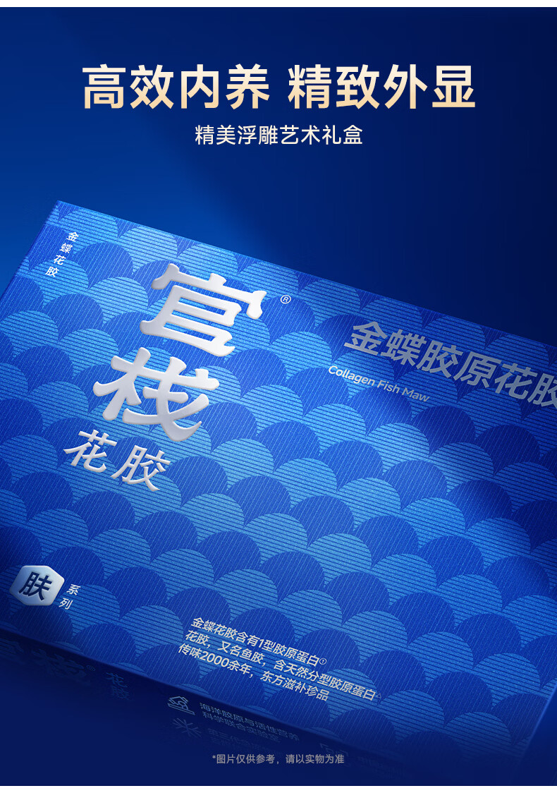 营养美味;高效内养 ,精致外显 ,精美浮雕艺术礼盒;金蝶花胶,含1型胶原蛋白
