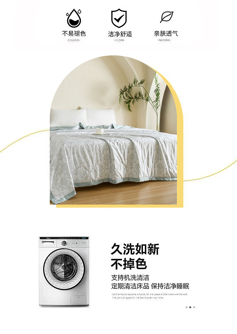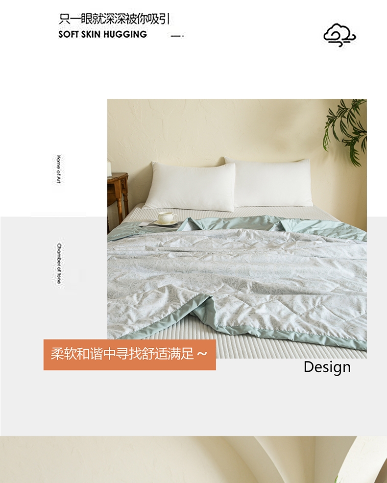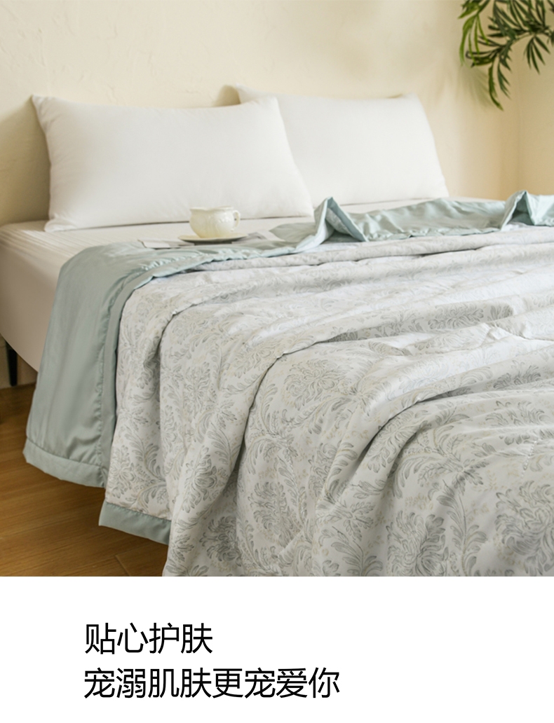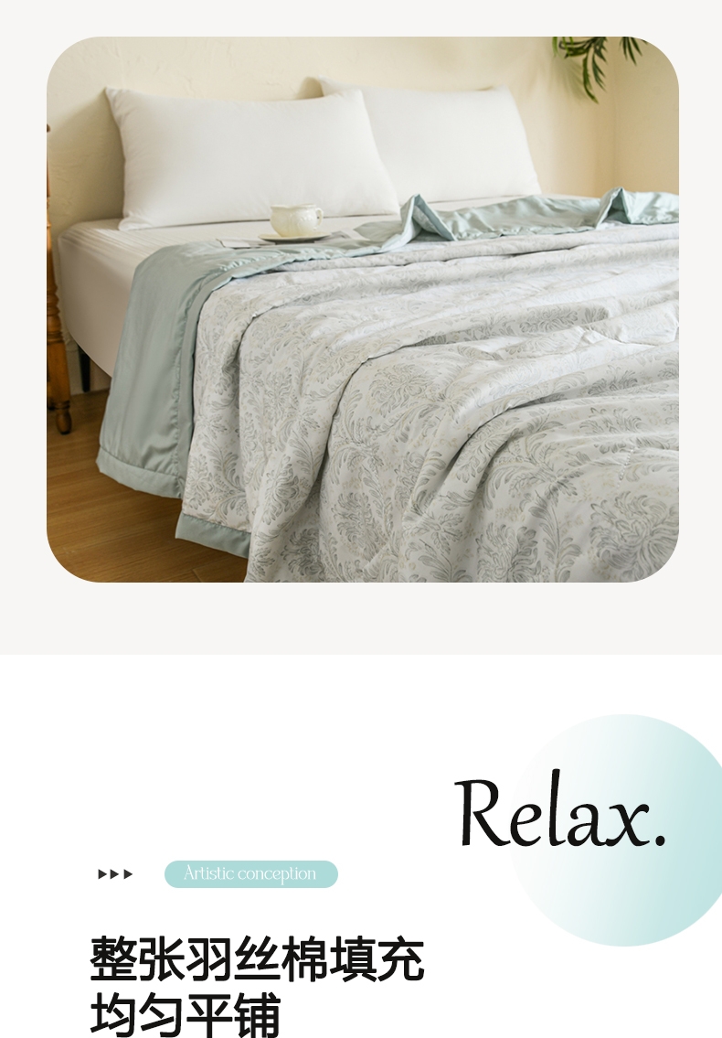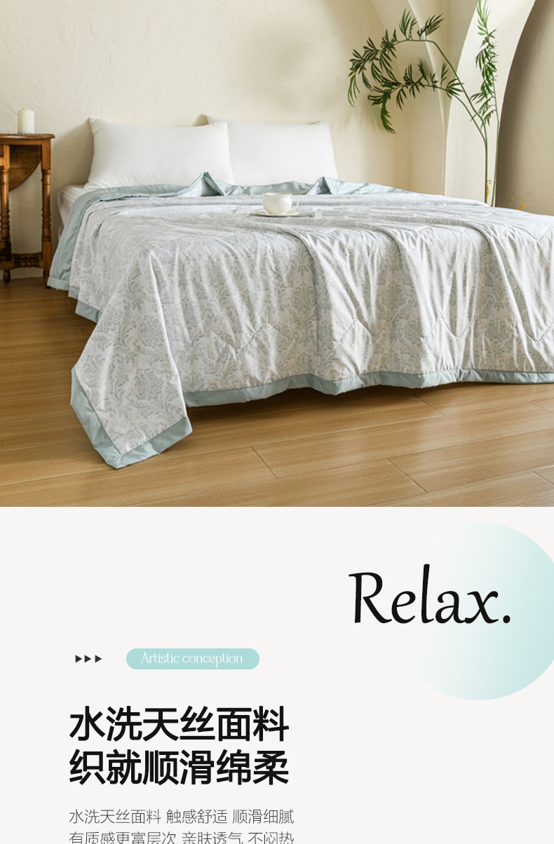 选用水洗天丝面料;触感细腻亲肤,轻薄透气不闷热;整张羽丝棉填充,精致的绗缝工艺