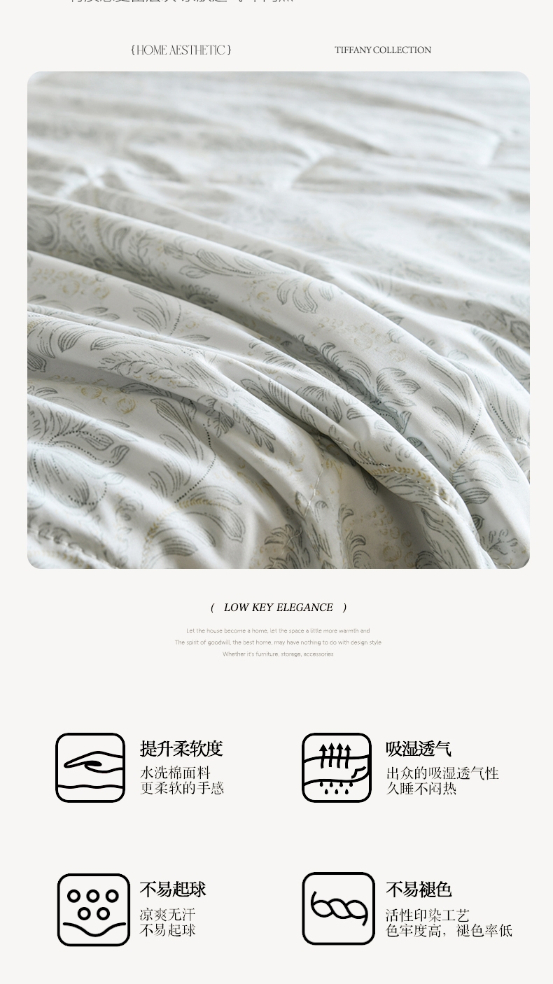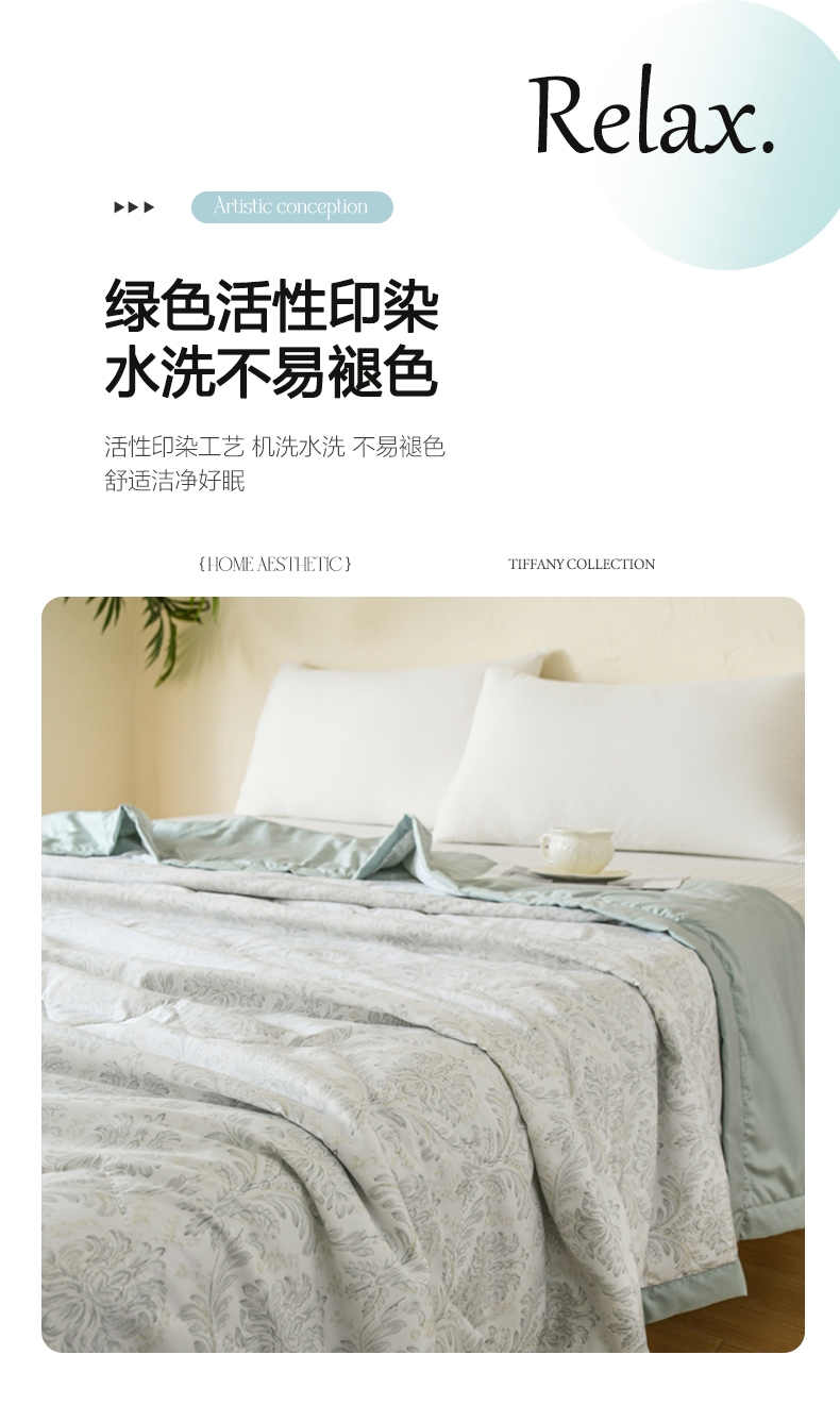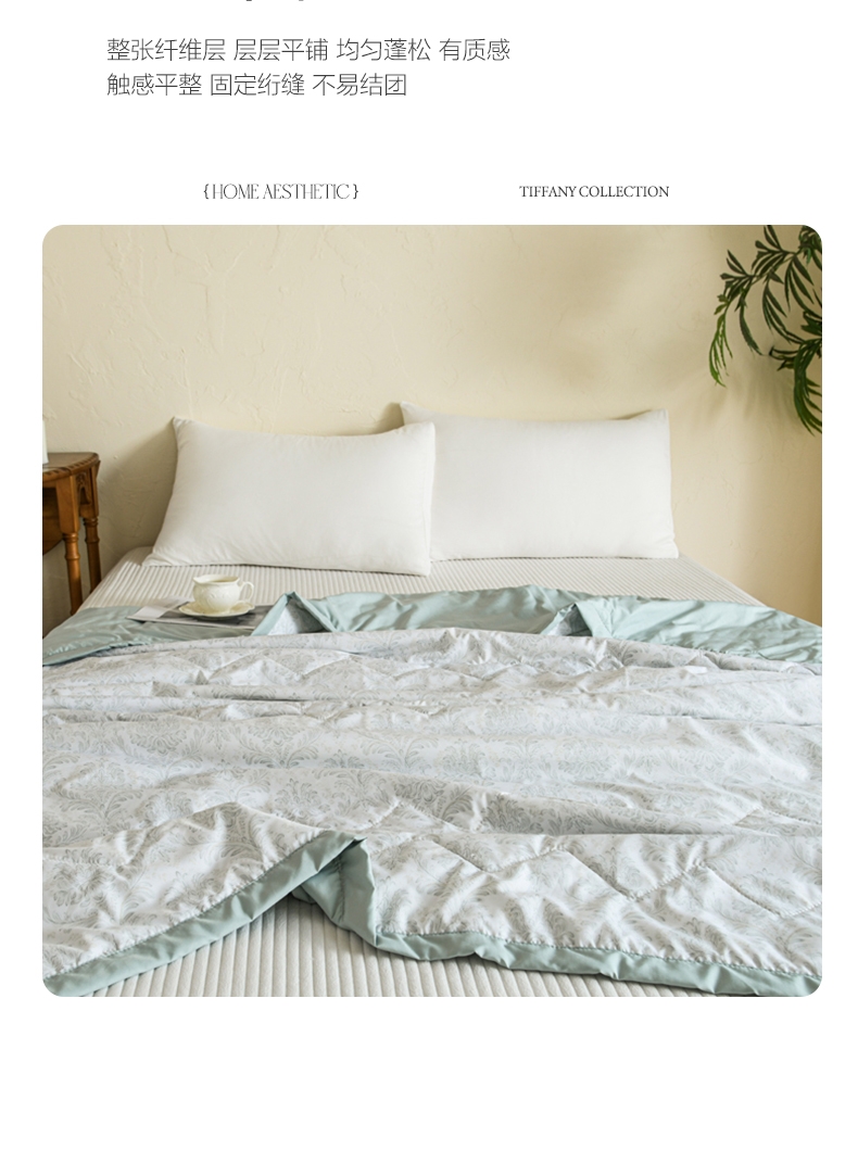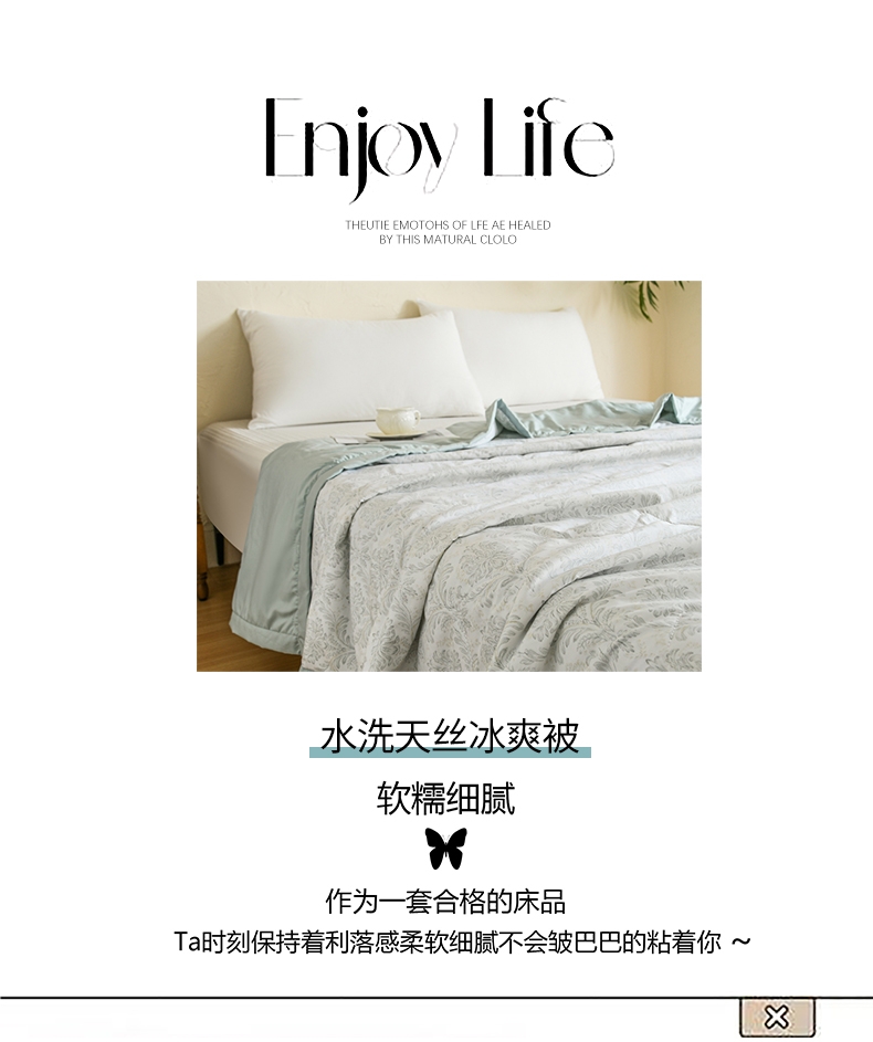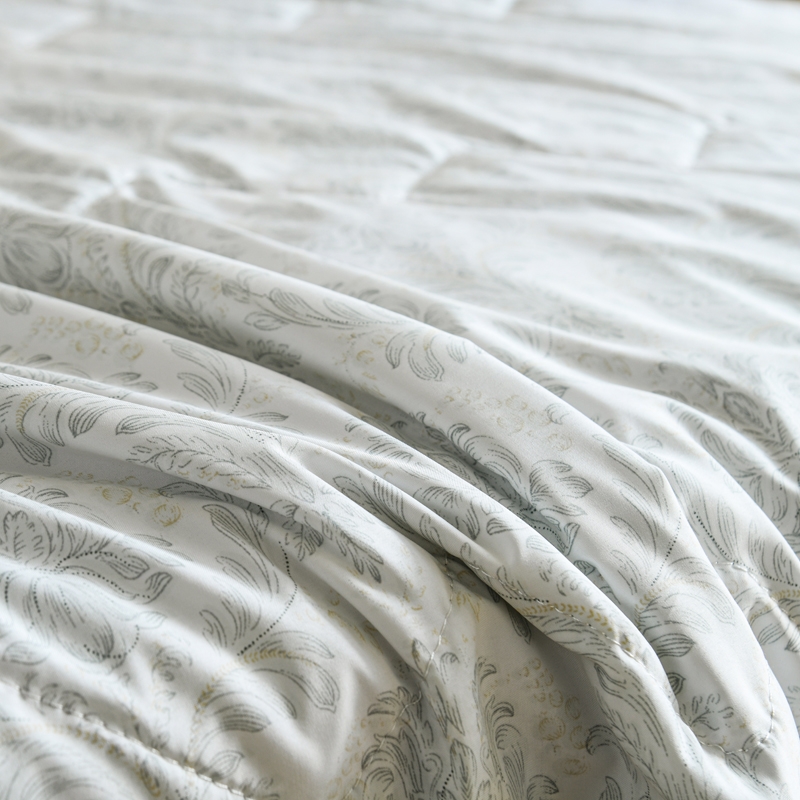 选用水洗天丝面料;触感细腻亲肤,轻薄透气不闷热;整张羽丝棉填充,精致的绗缝工艺