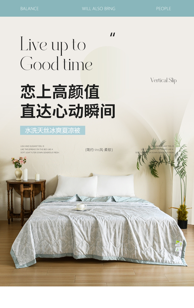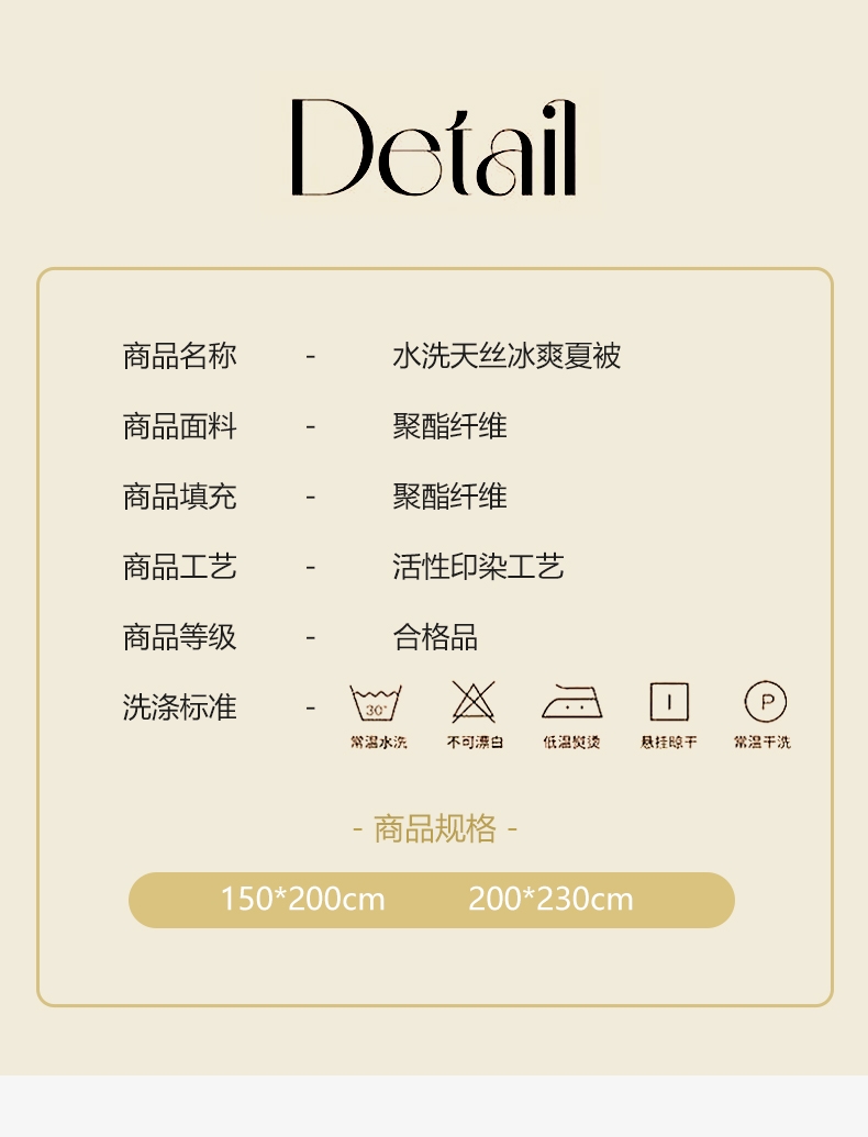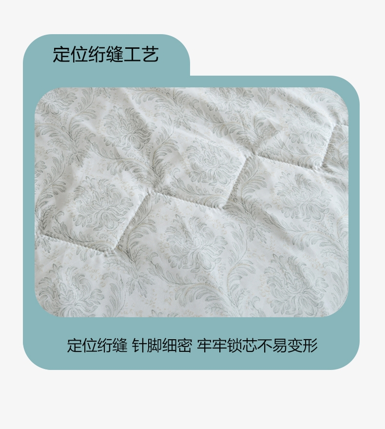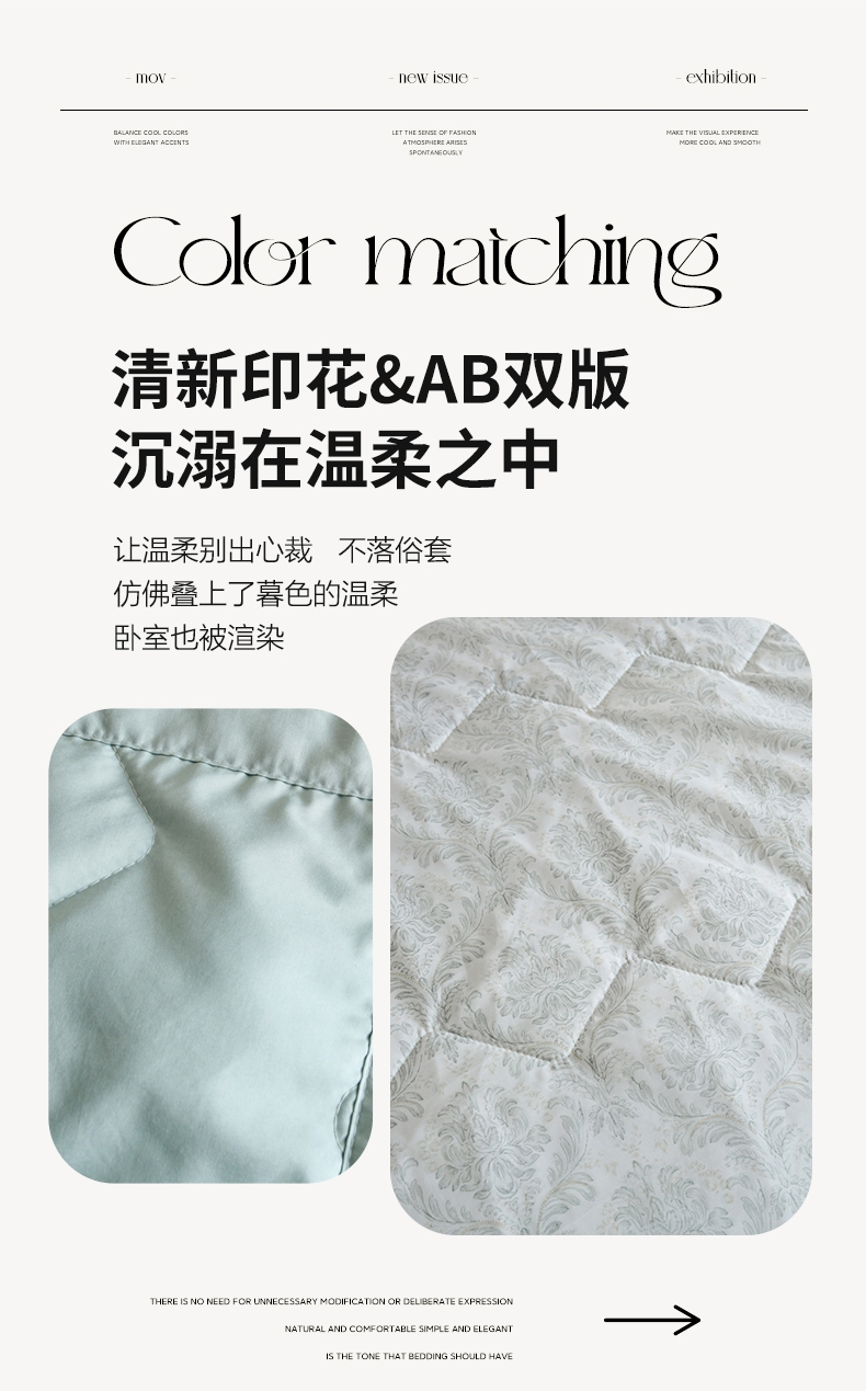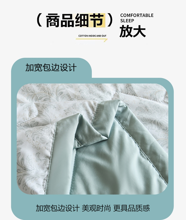 选用水洗天丝面料;触感细腻亲肤,轻薄透气不闷热;整张羽丝棉填充,精致的绗缝工艺
