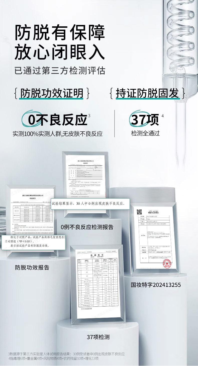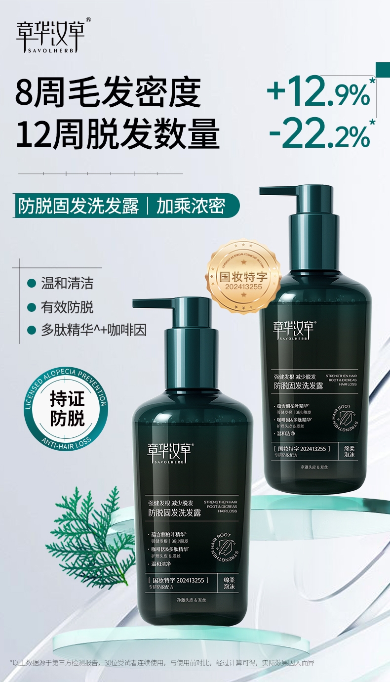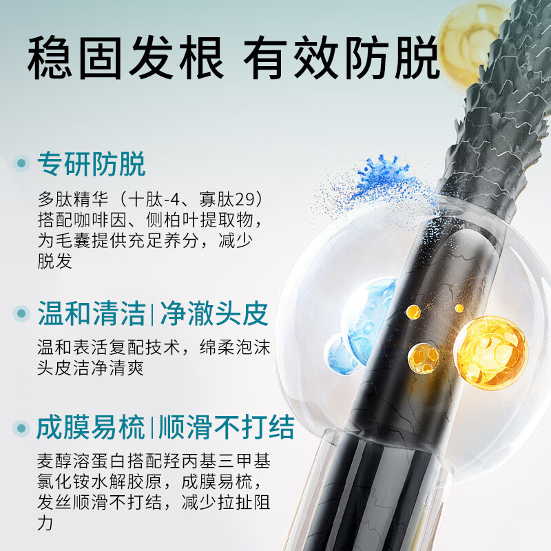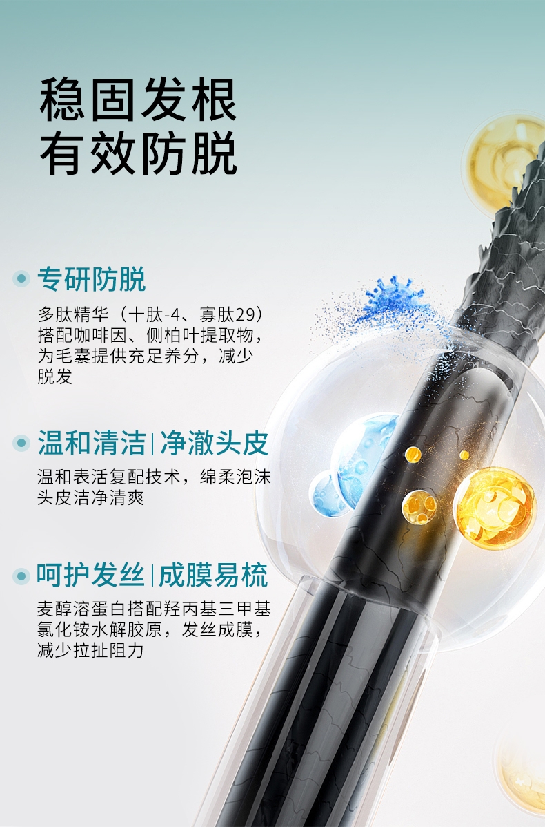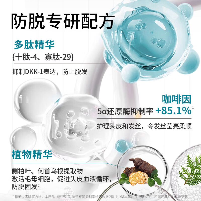 国妆特字认证具备权威防脱功效认证真人实测;4周可明显减少掉发12周脱发数量减少22.2%;温和配方兼顾防脱加修护敏感头皮友好发根蓬松不贴头皮