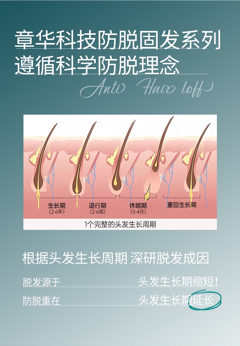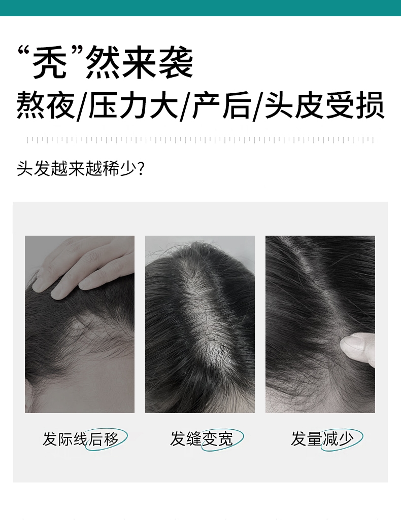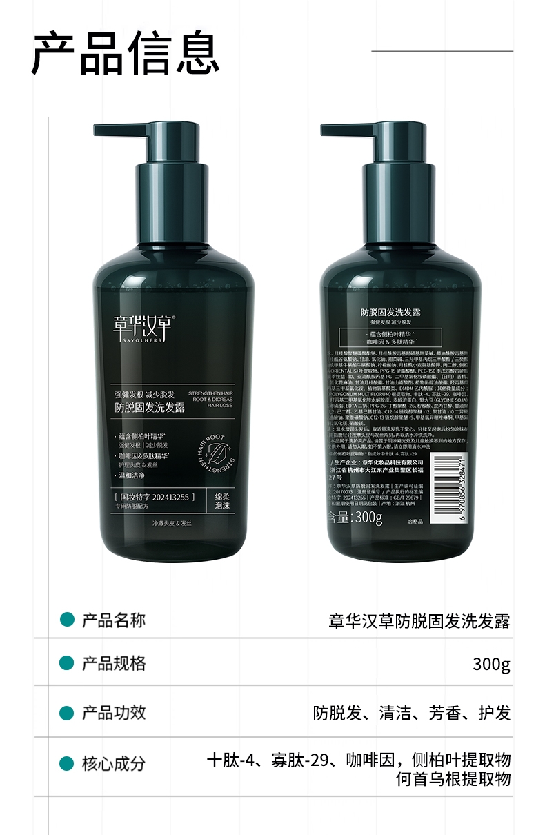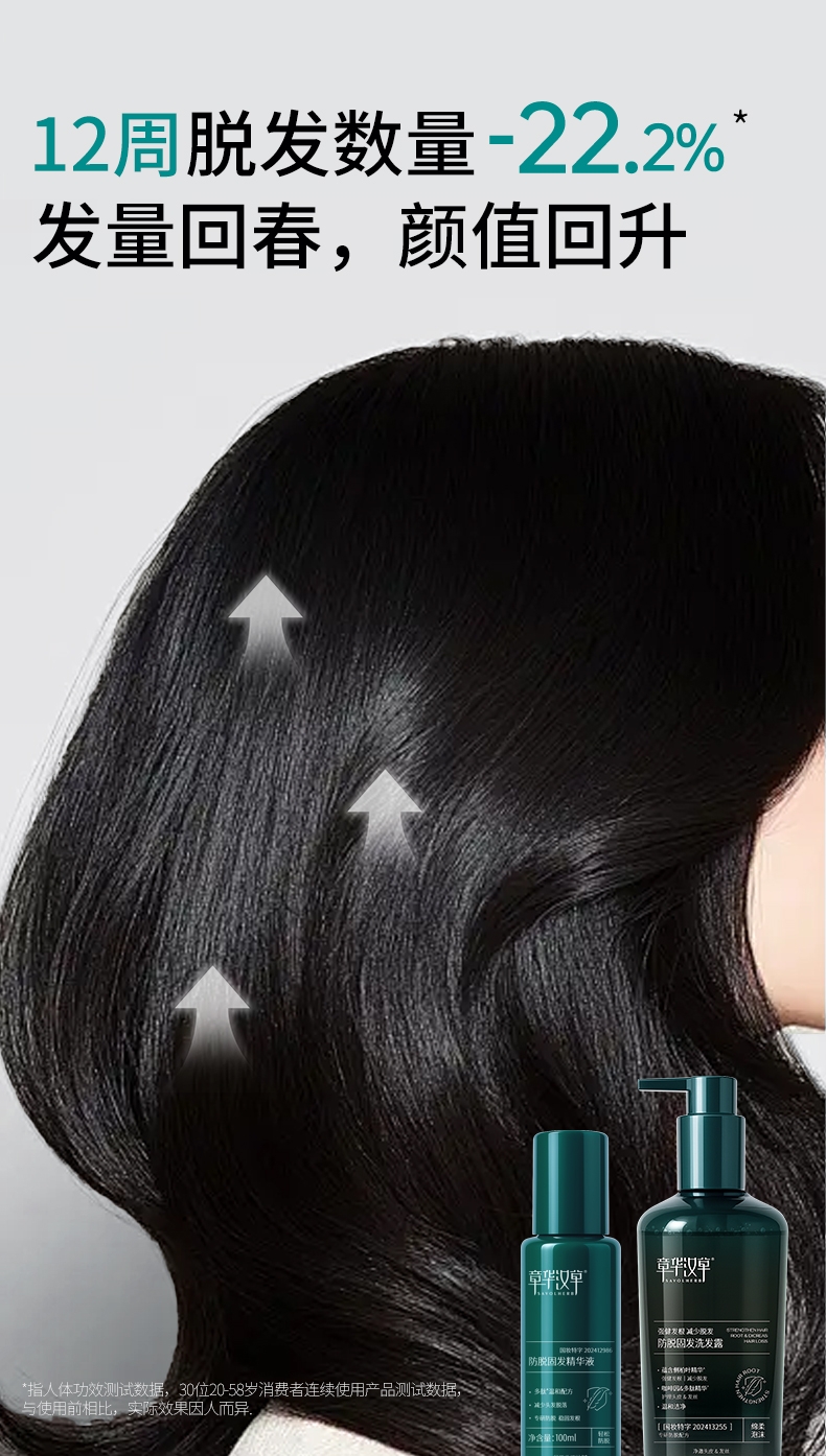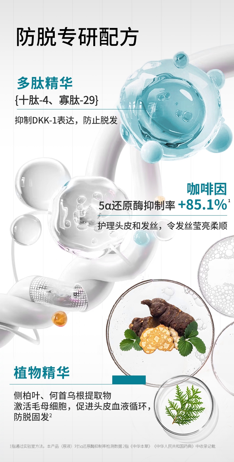 国妆特字认证具备权威防脱功效认证真人实测;4周可明显减少掉发12周脱发数量减少22.2%;温和配方兼顾防脱加修护敏感头皮友好发根蓬松不贴头皮