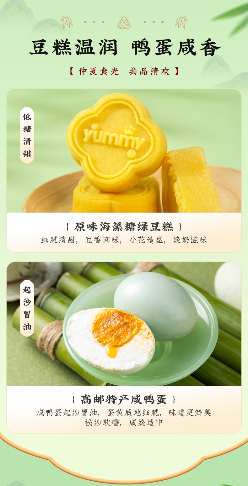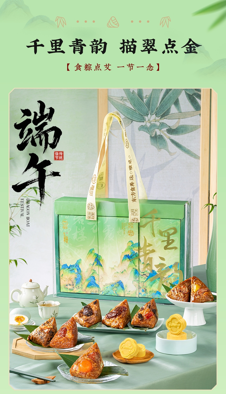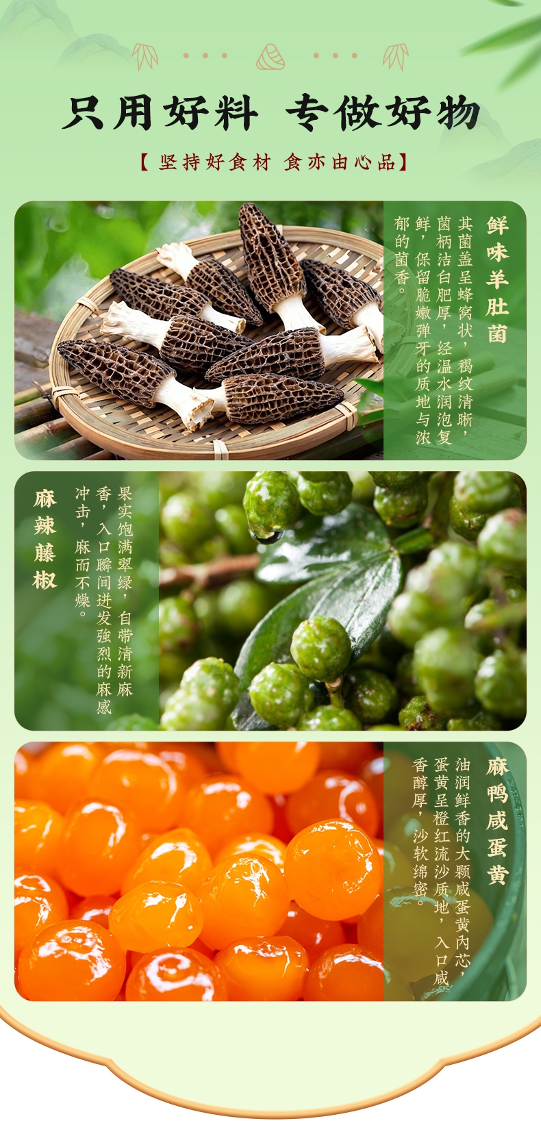 配置清单:精典鲜肉粽110g*2 招牌蛋黄肉粽110g*2 双鲜梅干菜猪肉粽110g*2 栗子鲜肉粽110g*1 沙茶菌菇牛肉粽110g*1 火腿羊肚菌上汤粽110g*1 秋耳藤椒牛肉粽110g*1 高邮特产咸鸭蛋55g*2 原味海藻糖绿豆糕30g*4