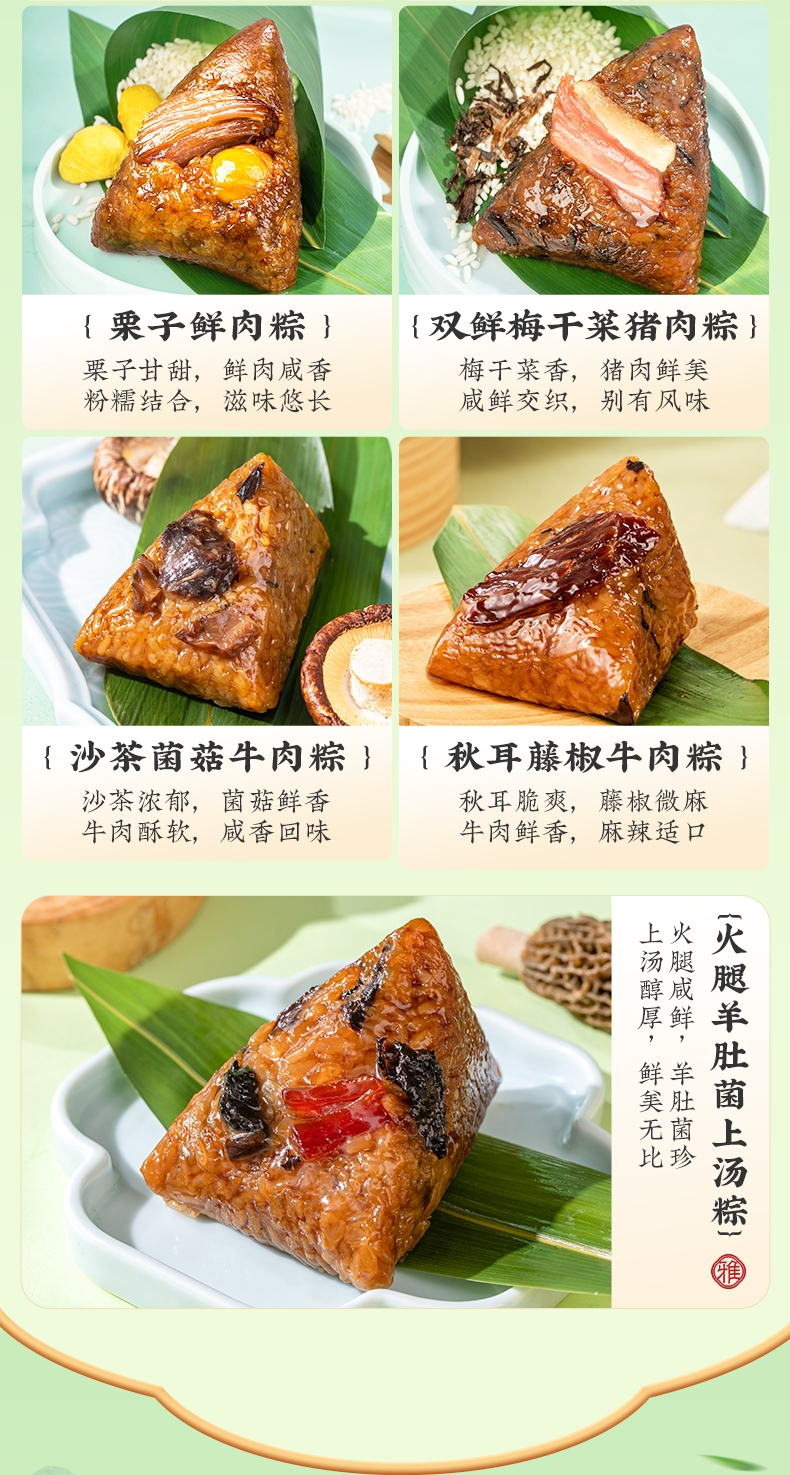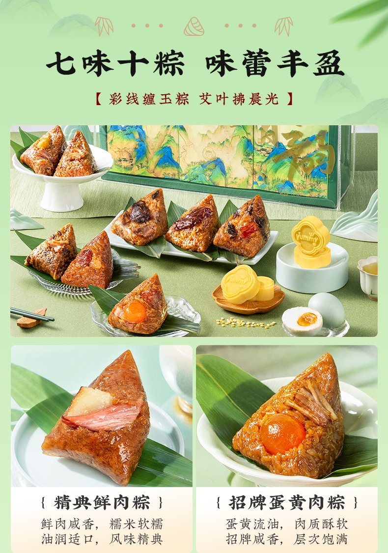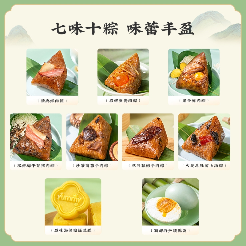 7味10粽,全肉粽豪华组合,咸香浓郁、风味独特;经典鲜肉粽醇香多汁,招牌藏珍蛋黄肉粽沙糯流油;手工包制,文火慢蒸入味,不做多余添加