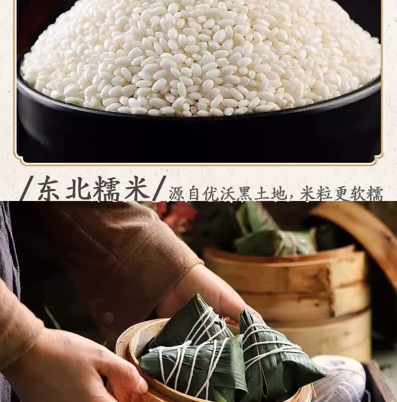 精选天然优质的高山箬叶;参味回甘 味道鲜美;源自优沃黑土地,米粒更软糯