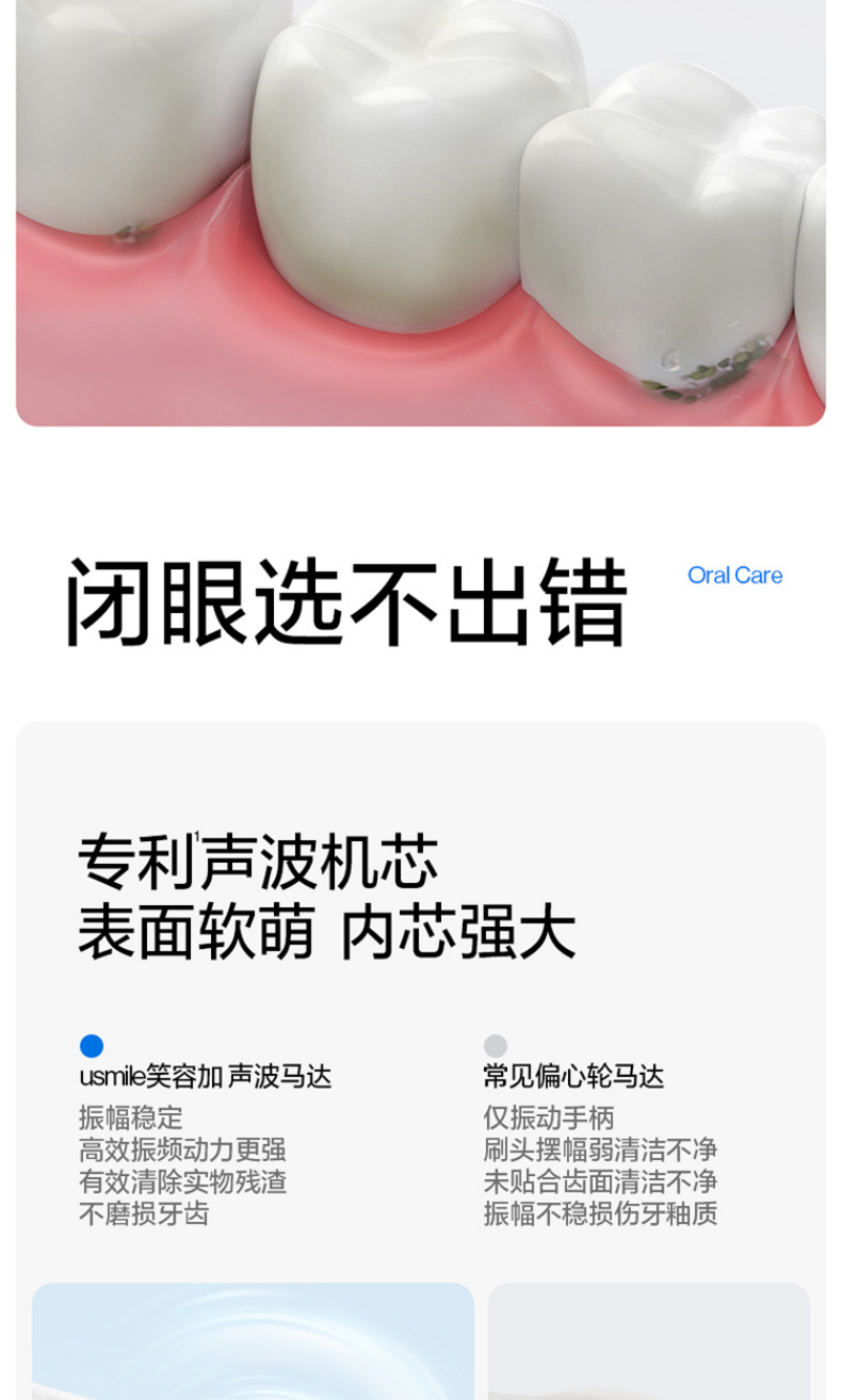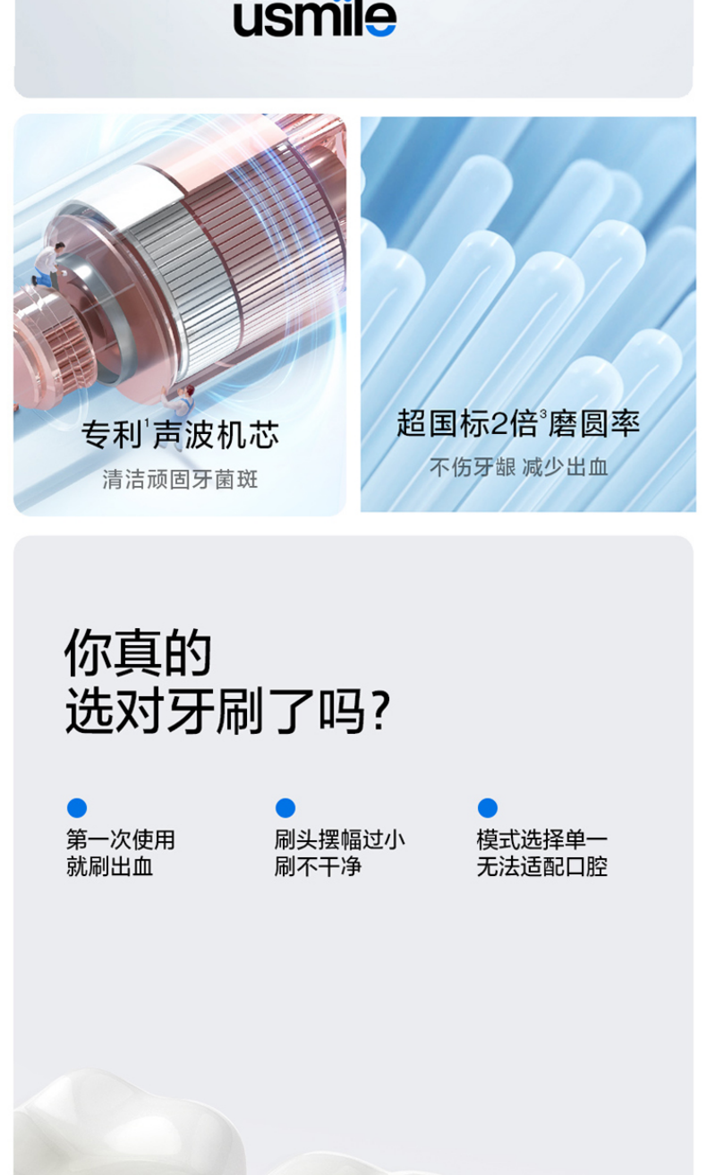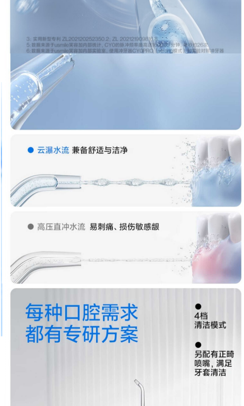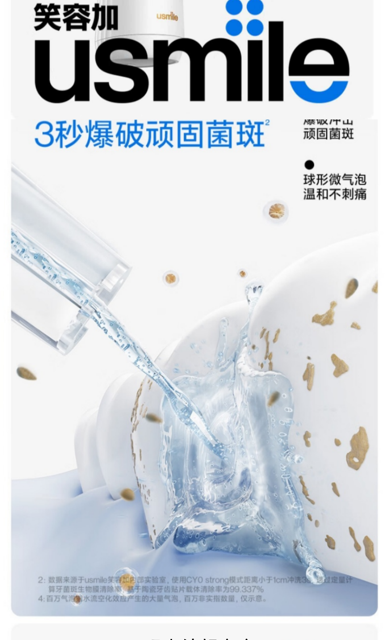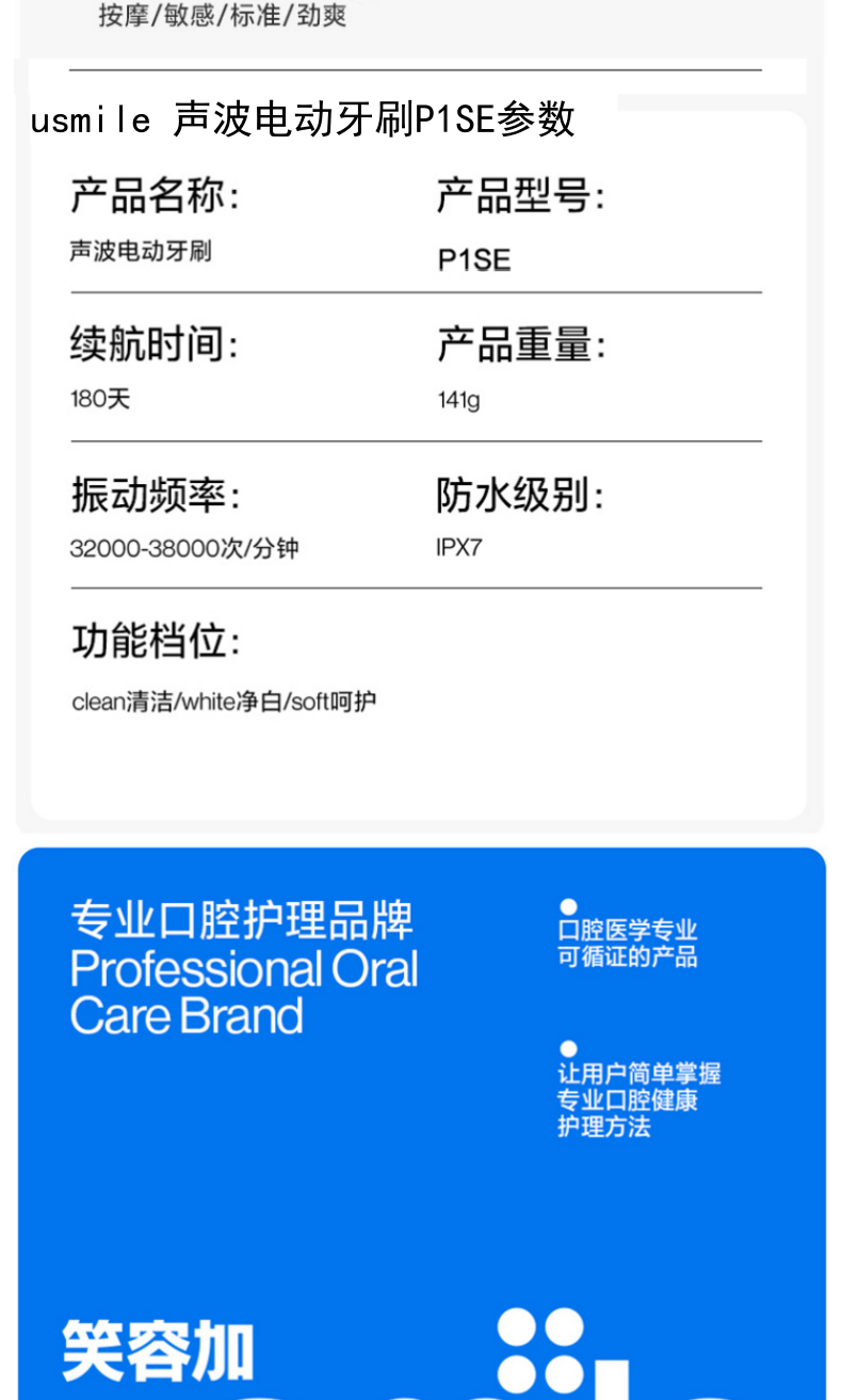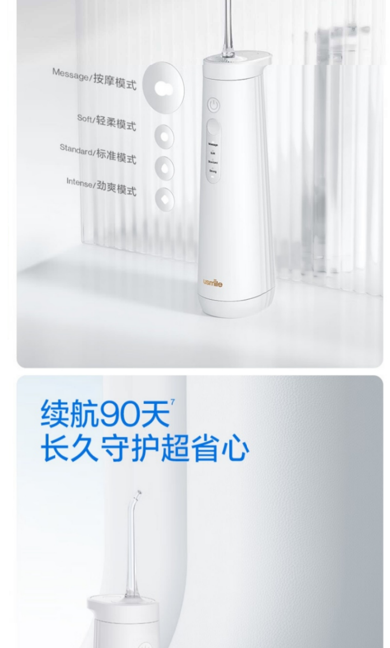 三大洁齿模式:清洁Clean/美白White/呵护;IPX7级防水,全机身可水洗;usmile 口腔护理专家全网销量第一品牌