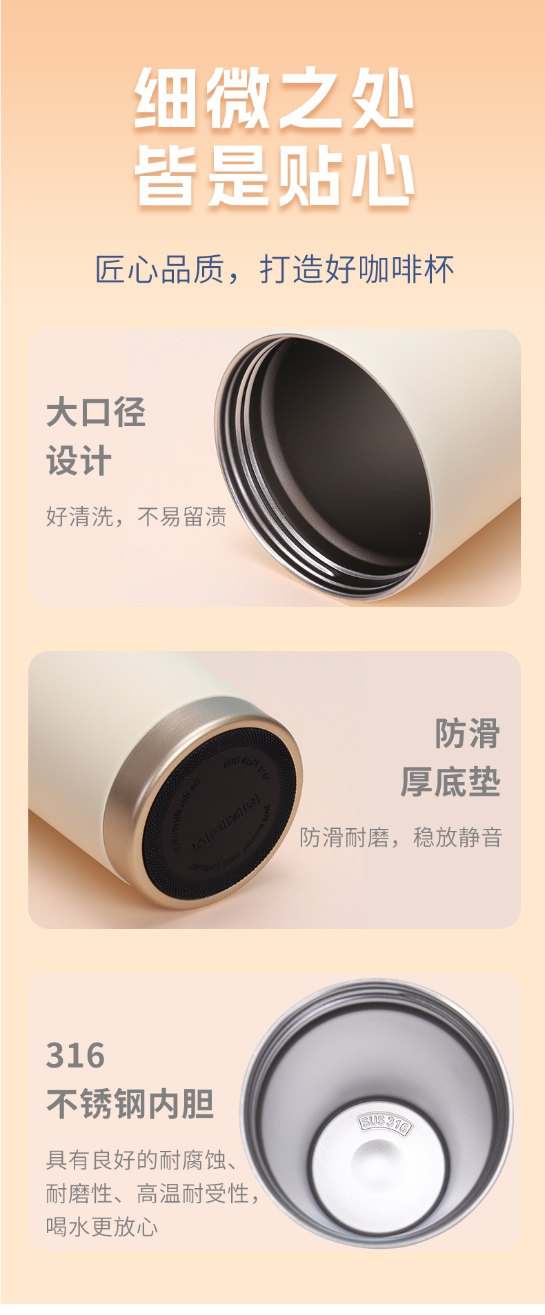 316无缝内胆;杯盖食品级PP;吸管食品级硅胶