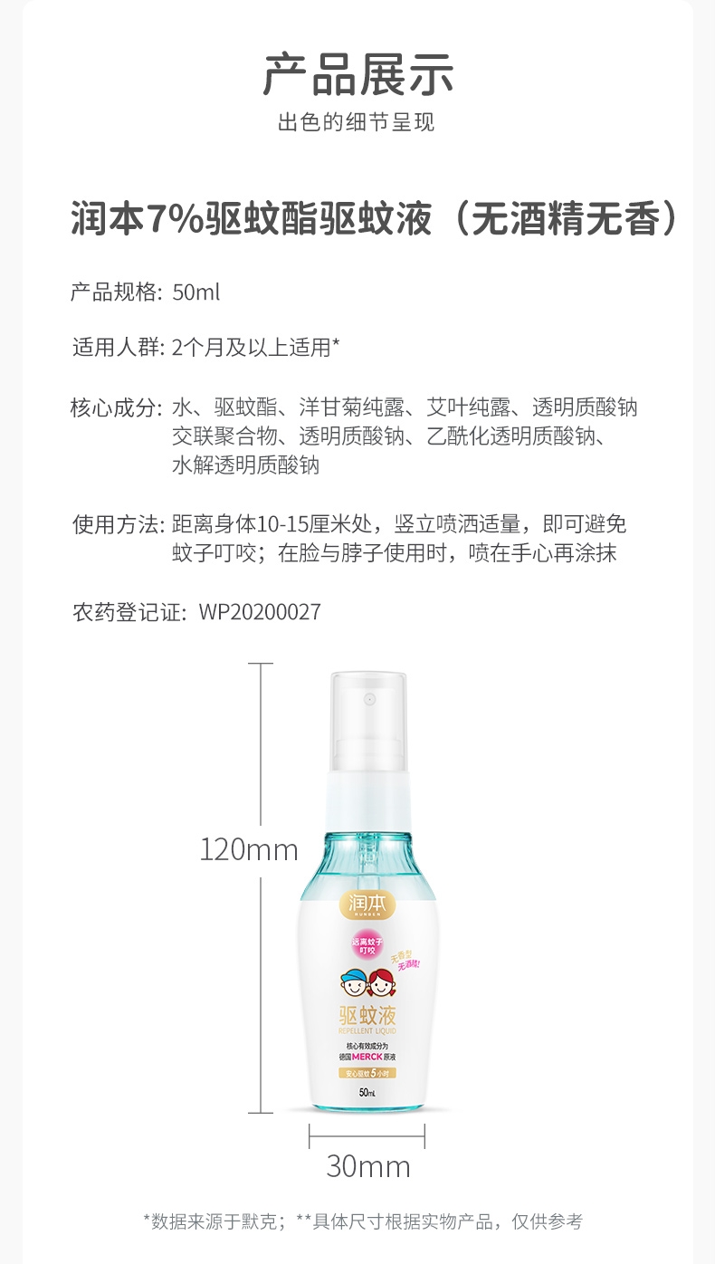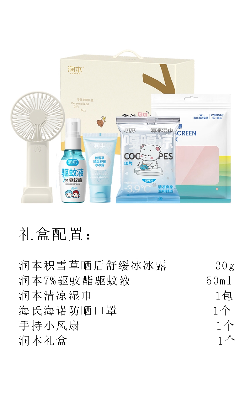配置清单:润本积雪草晒后舒缓冰冰露 30g 润本7%驱蚊酯驱蚊液 50ml 润本清凉湿巾 10片 海氏海诺防晒口罩 1个 手持小风扇 1个 润本礼盒 1个
