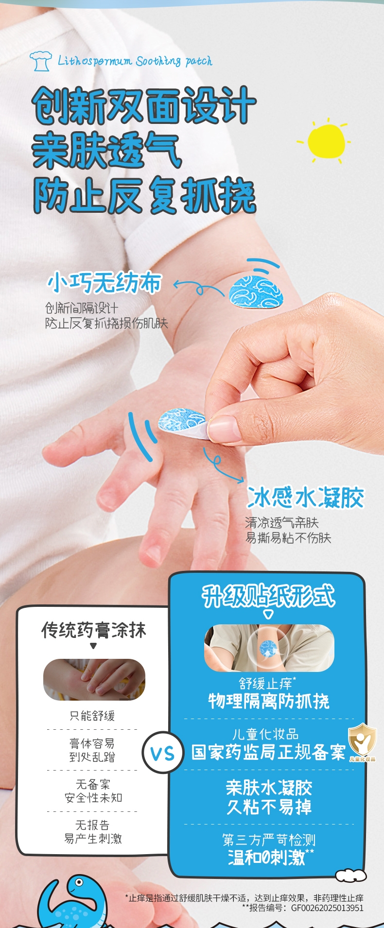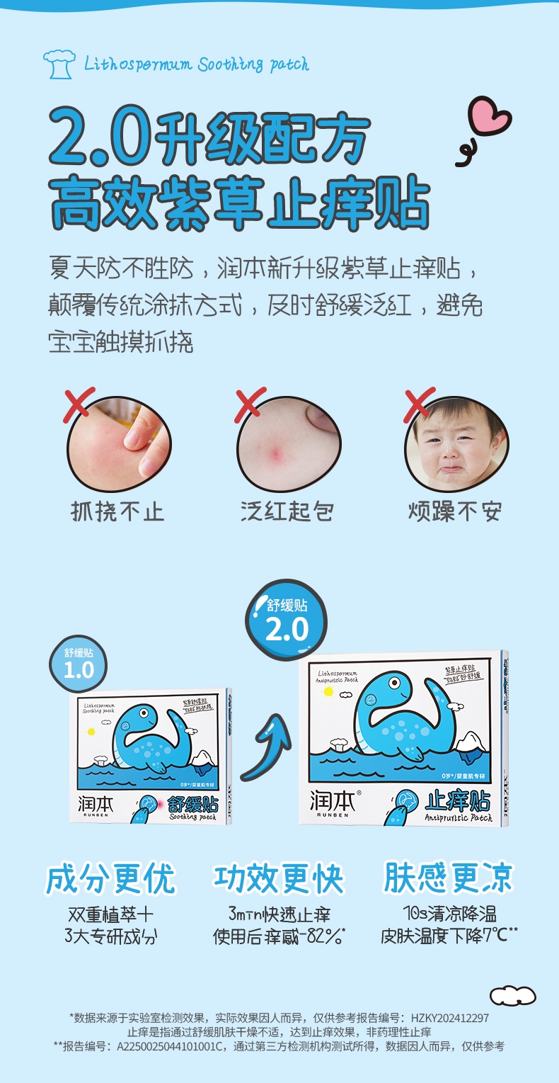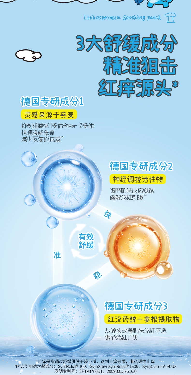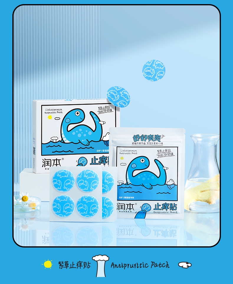 精选天然紫草根萃,搭配多种舒缓因子;有效缓解痒感,舒缓泛红不适;透气水凝胶层搭配可爱无纺布,亲肤透气免抓挠