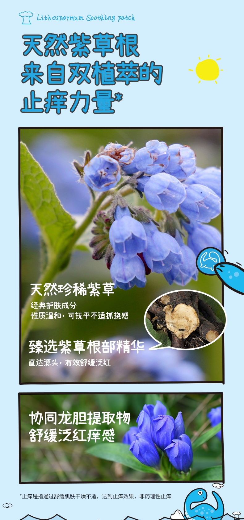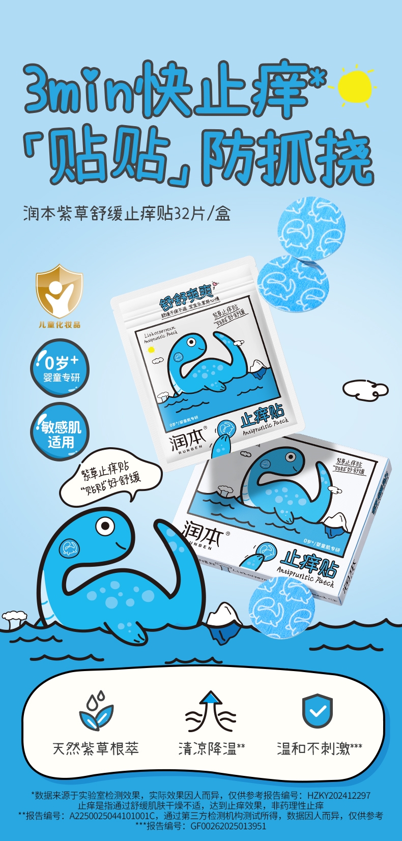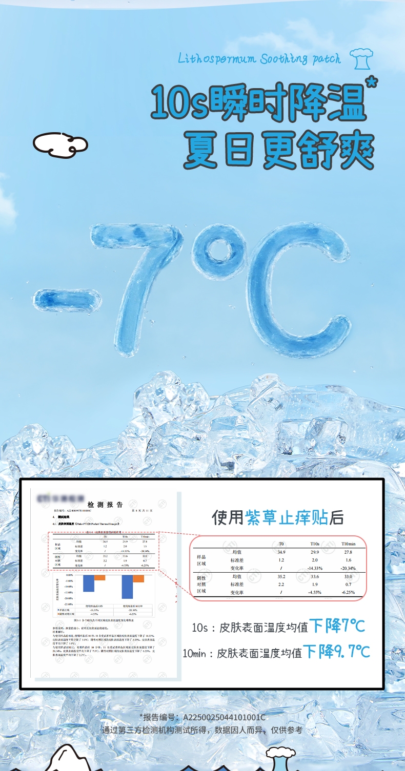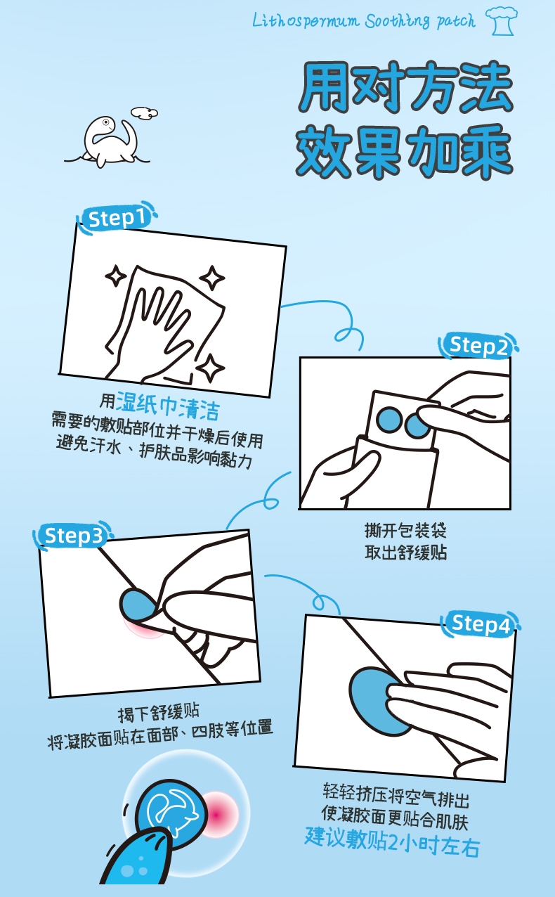 精选天然紫草根萃,搭配多种舒缓因子;有效缓解痒感,舒缓泛红不适;透气水凝胶层搭配可爱无纺布,亲肤透气免抓挠