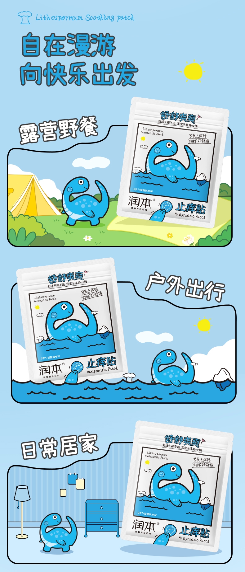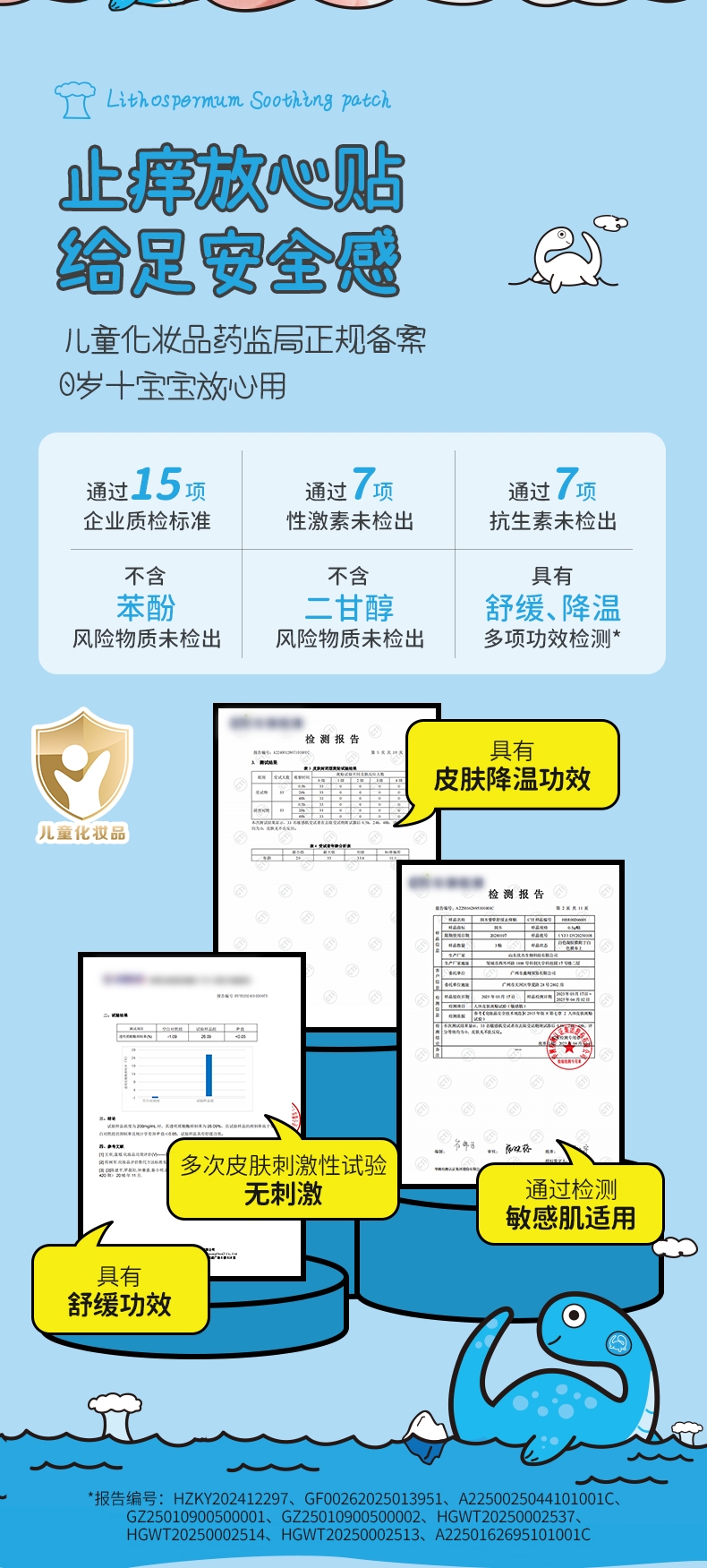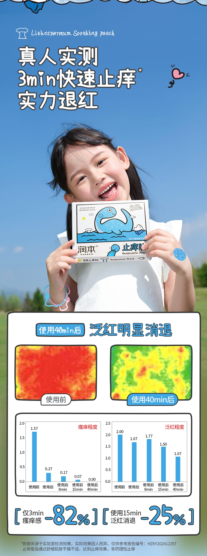 精选天然紫草根萃,搭配多种舒缓因子;有效缓解痒感,舒缓泛红不适;透气水凝胶层搭配可爱无纺布,亲肤透气免抓挠