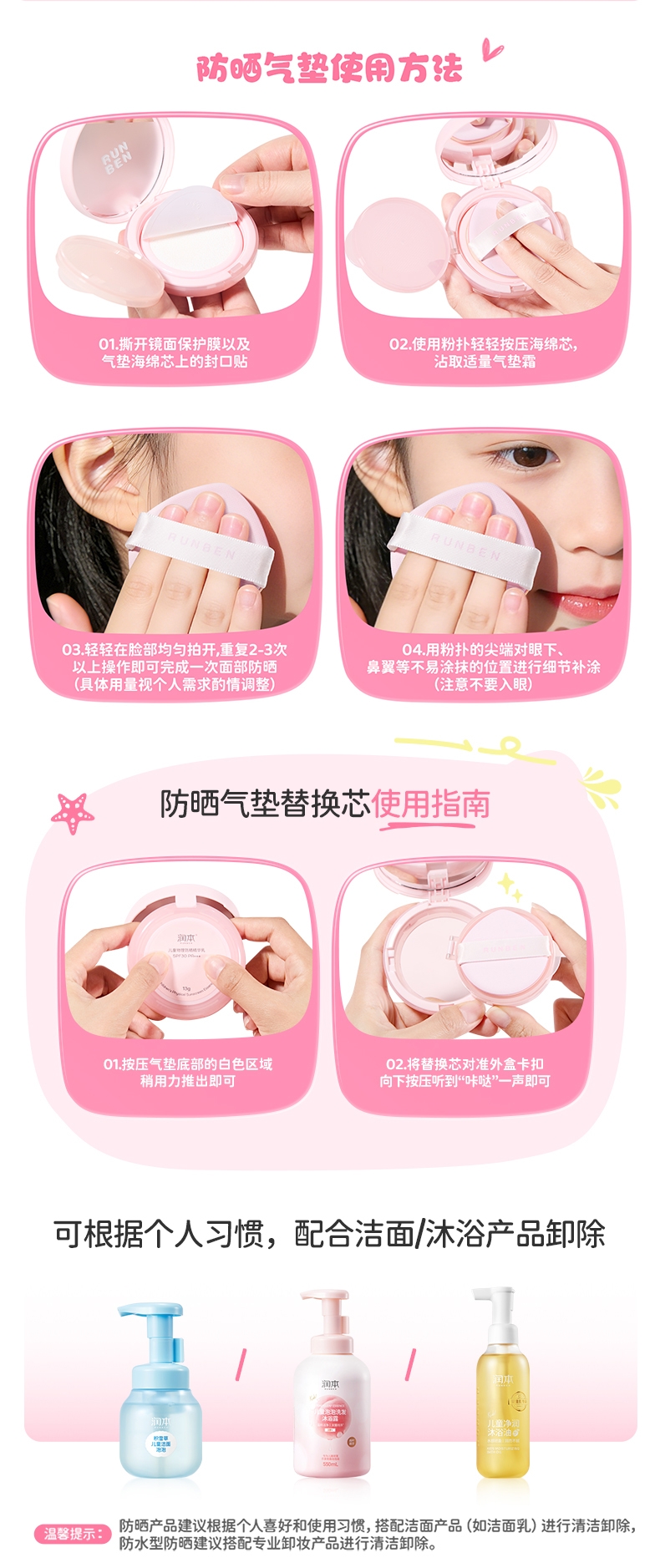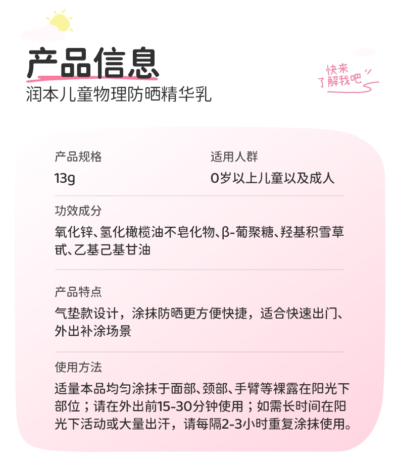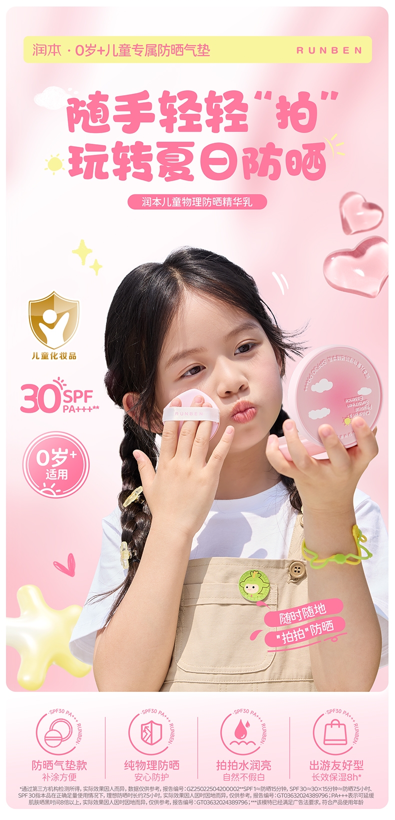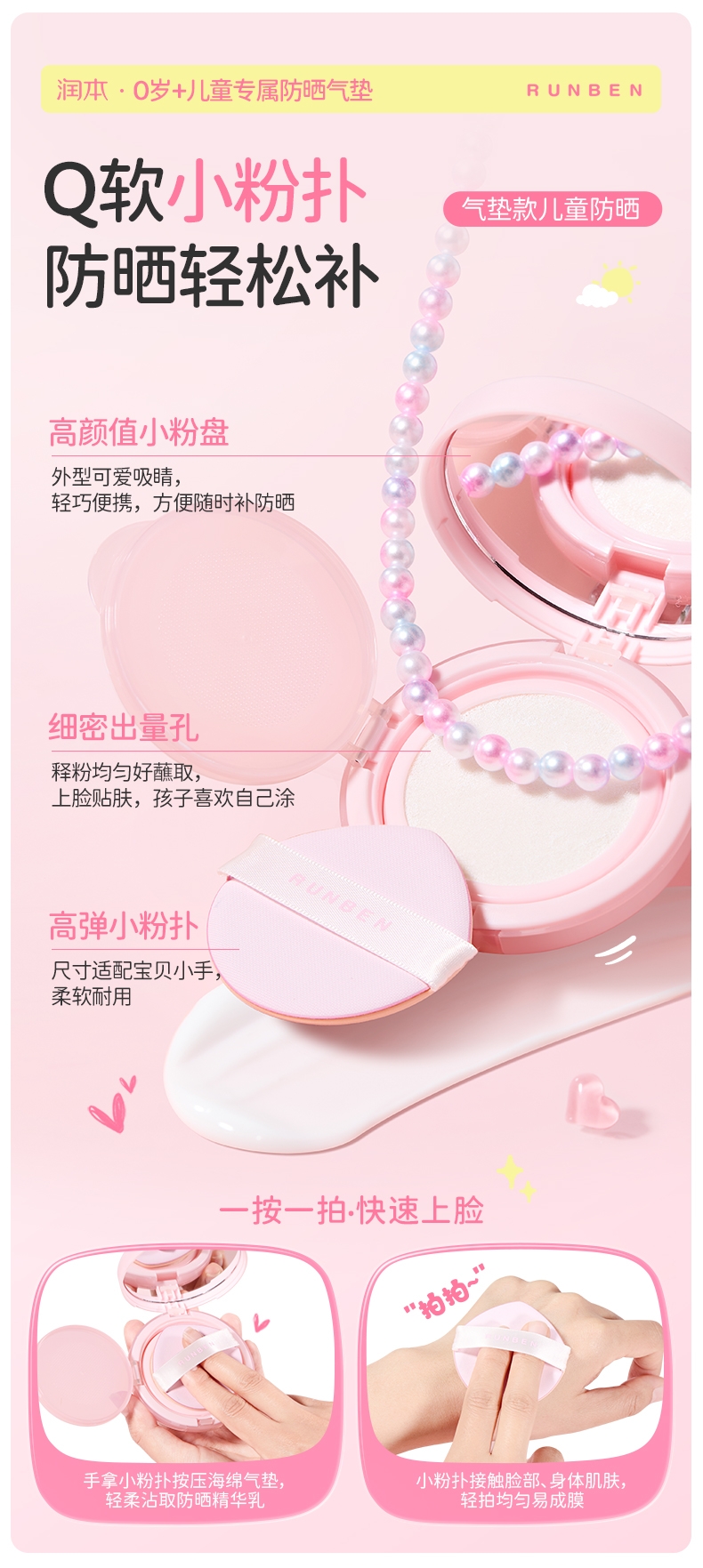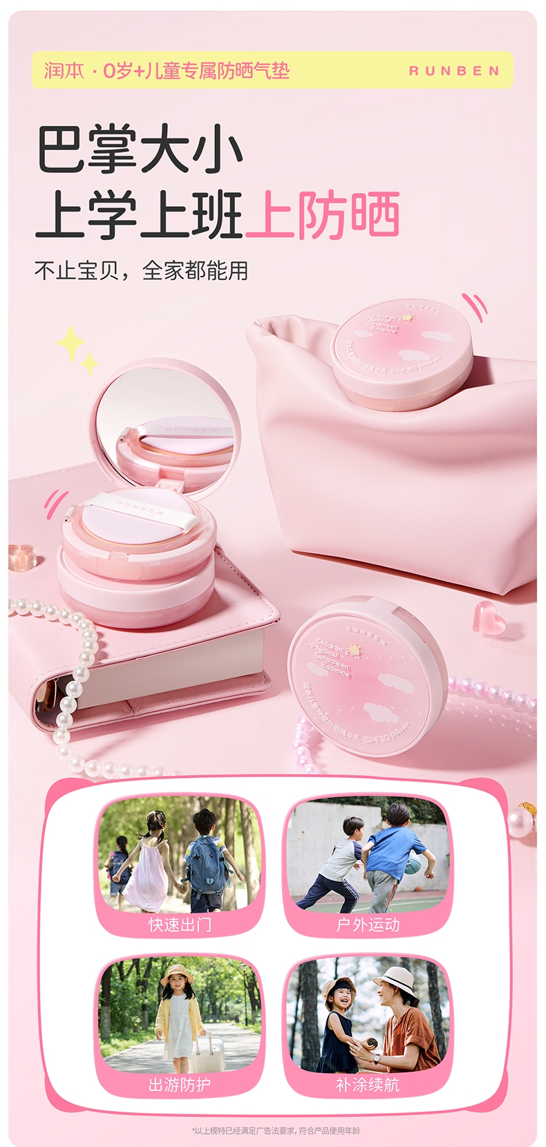 0岁以上儿童以及成人;气垫款设计,涂抹防晒更方便快捷;适合快速出门、外出补涂场景
