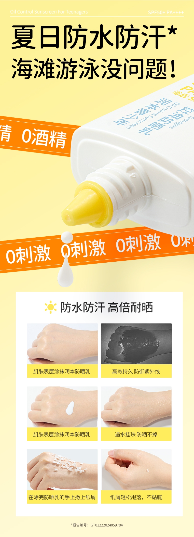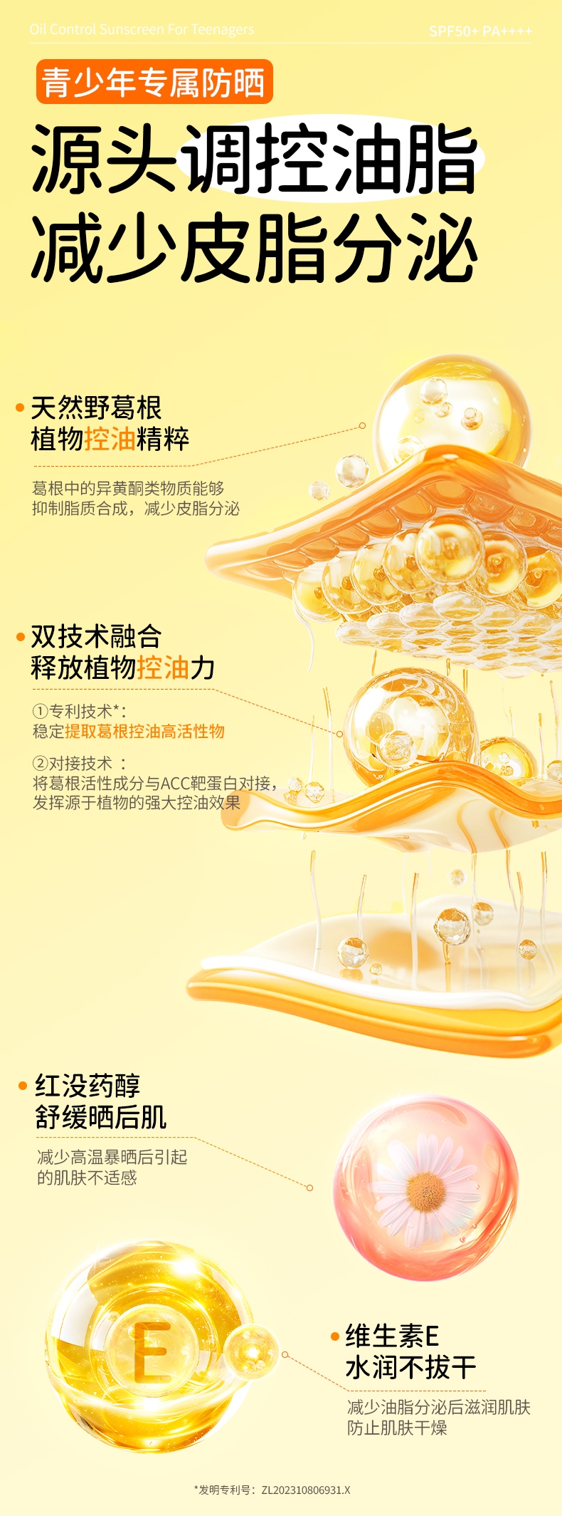 葛根植物精粹、红没药醇、维生素 E;防水防汗,轻薄不黏腻,油敏肌放心用;适合人群:3岁以上适用