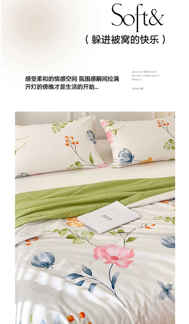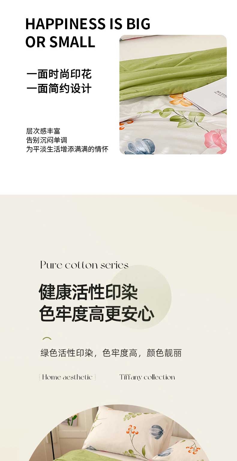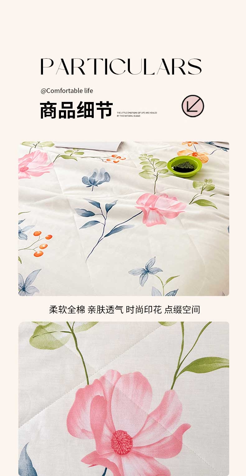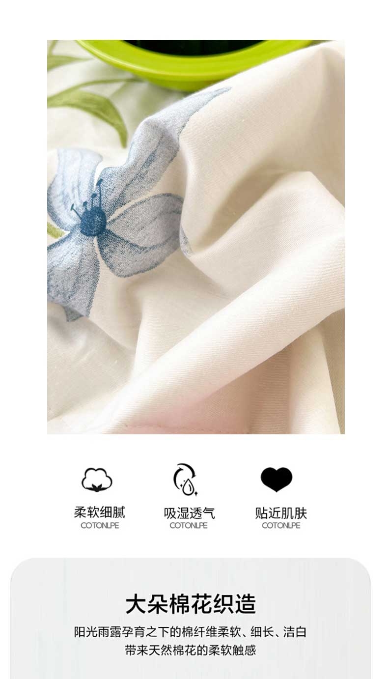 全棉印花面料,活性印花工艺;花型清晰饱满,整张羽丝棉蓬松柔软不压身;亲肤透气不闷热,易洗涤好打理