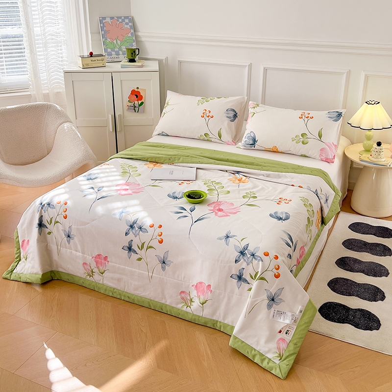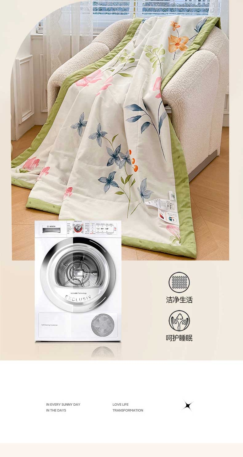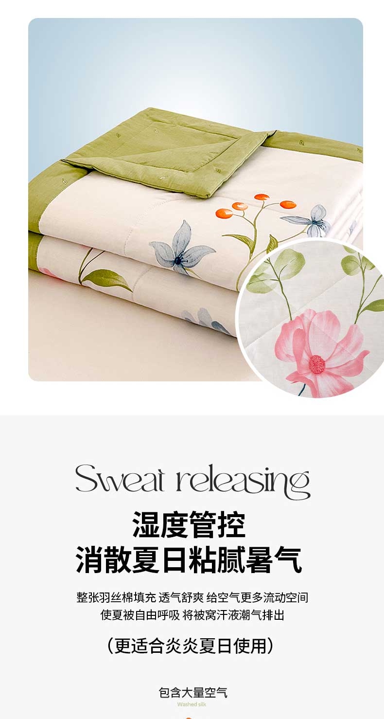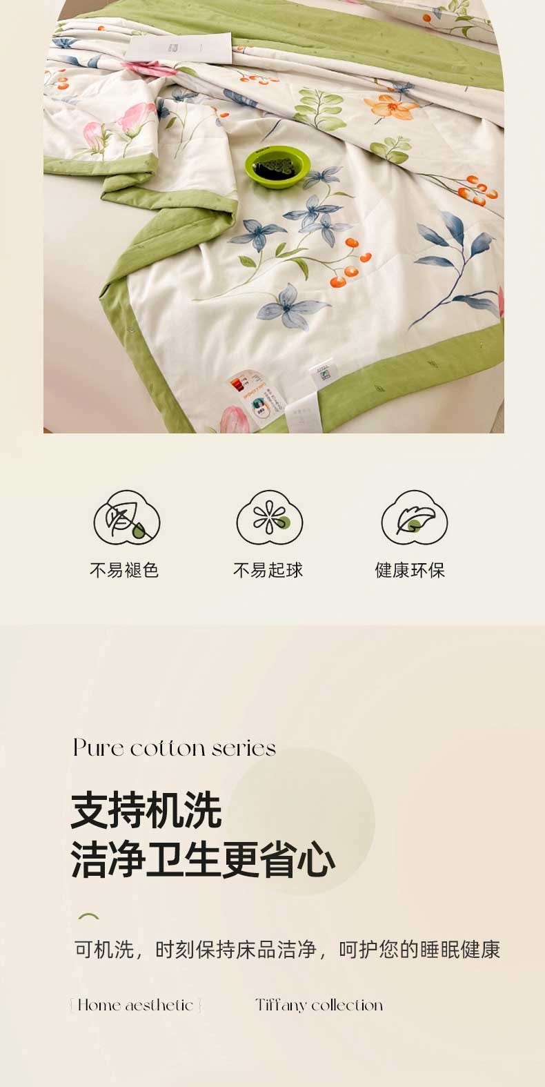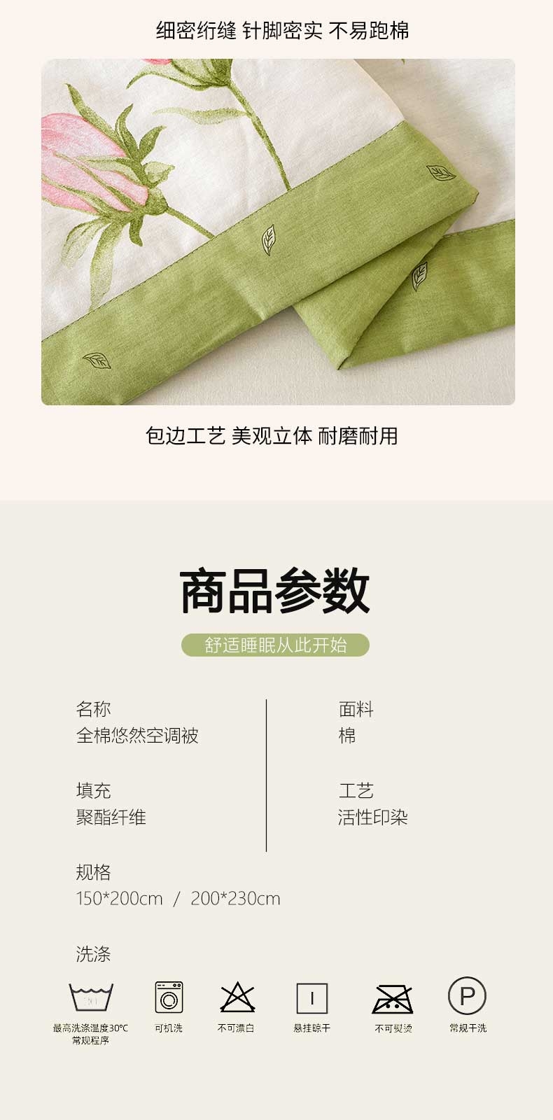 全棉印花面料,活性印花工艺;花型清晰饱满,整张羽丝棉蓬松柔软不压身;亲肤透气不闷热,易洗涤好打理