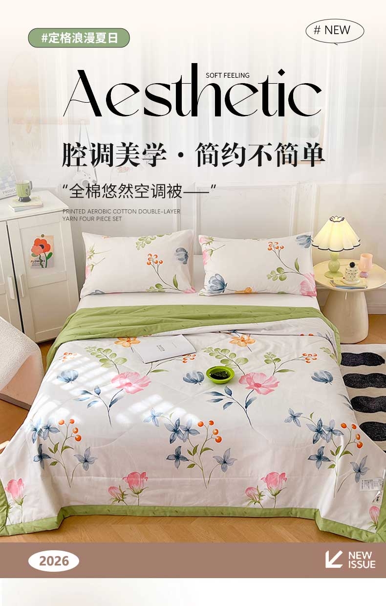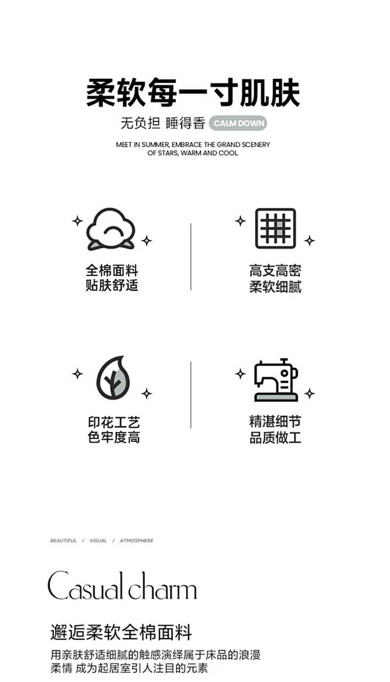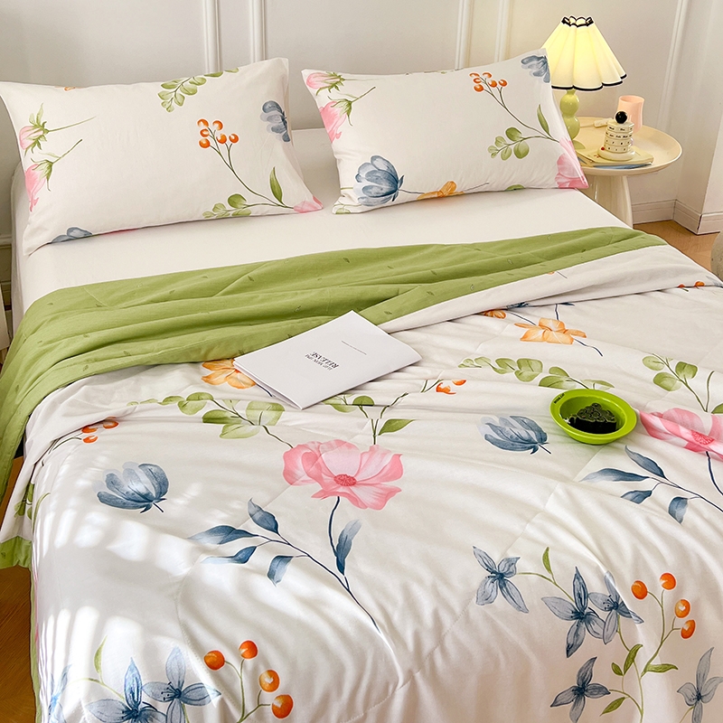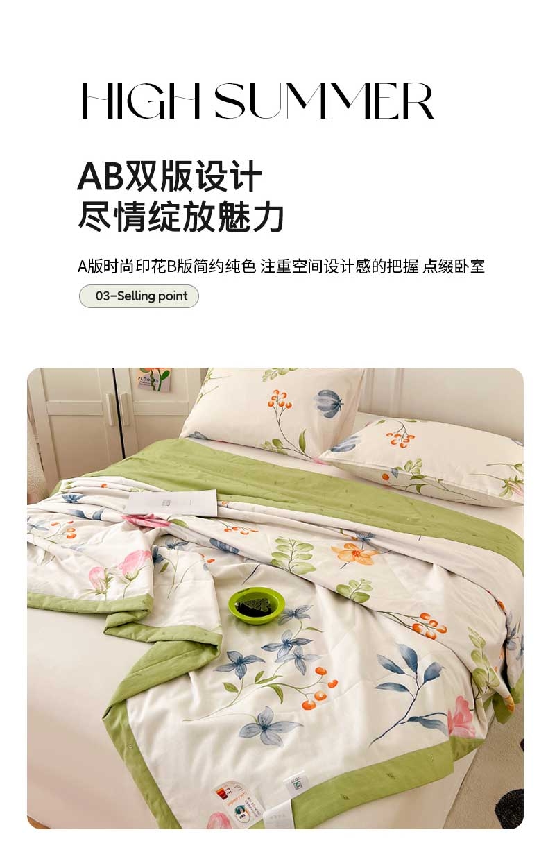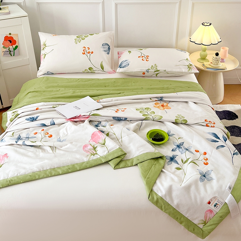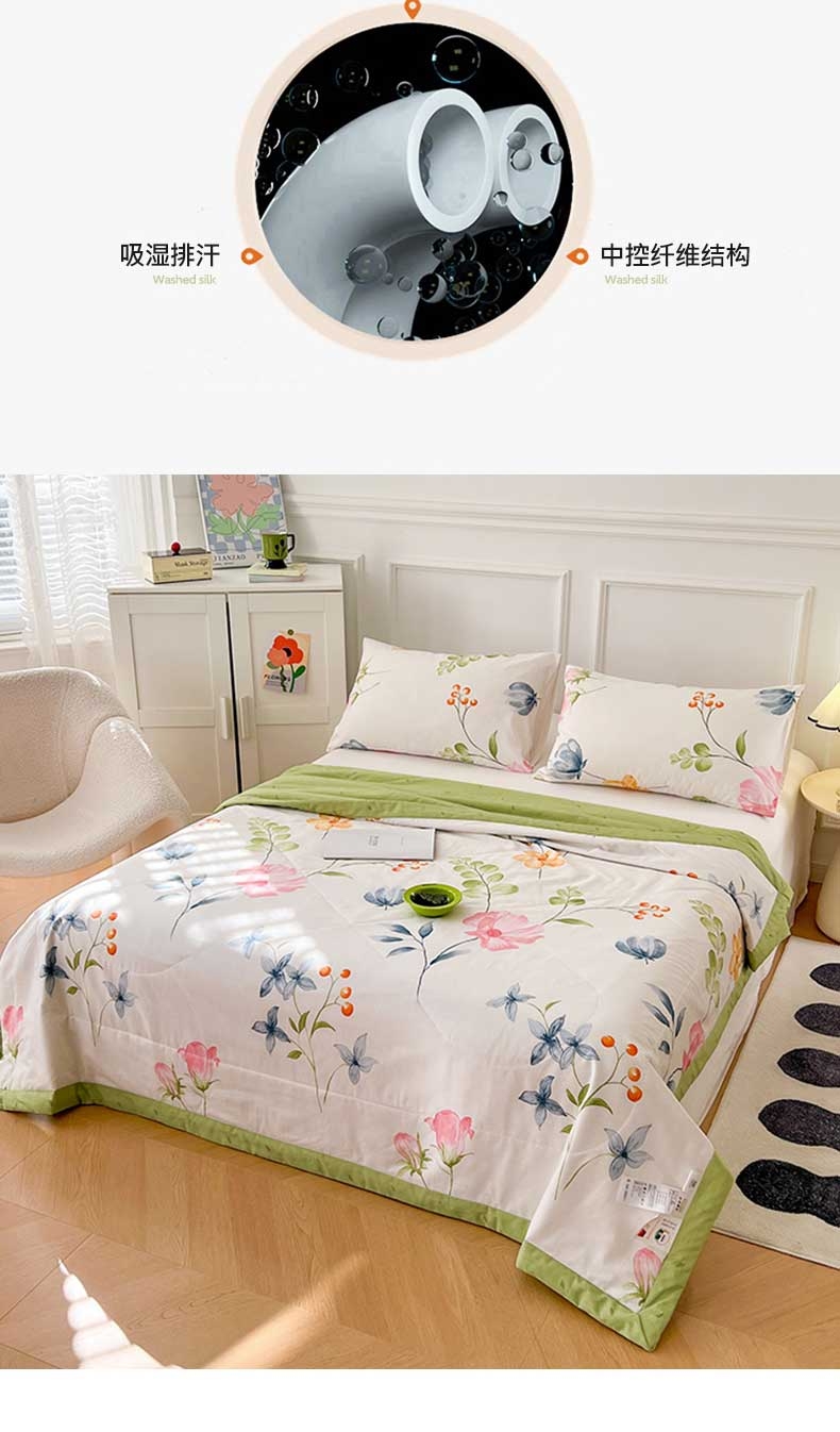 全棉印花面料,活性印花工艺;花型清晰饱满,整张羽丝棉蓬松柔软不压身;亲肤透气不闷热,易洗涤好打理