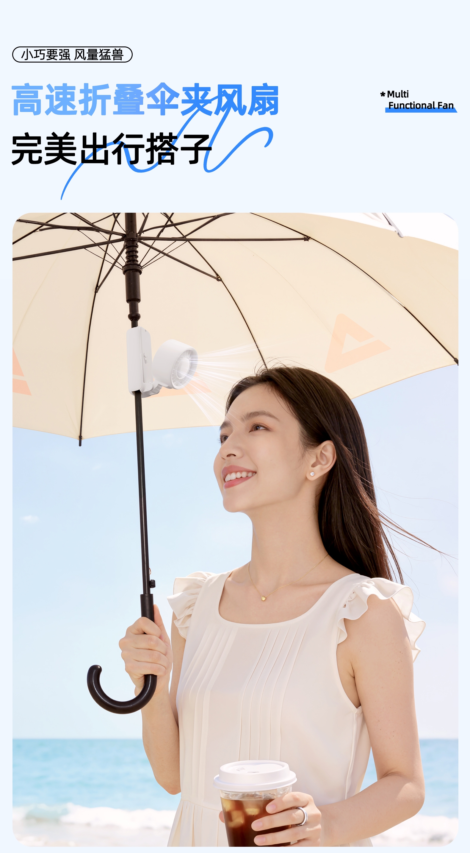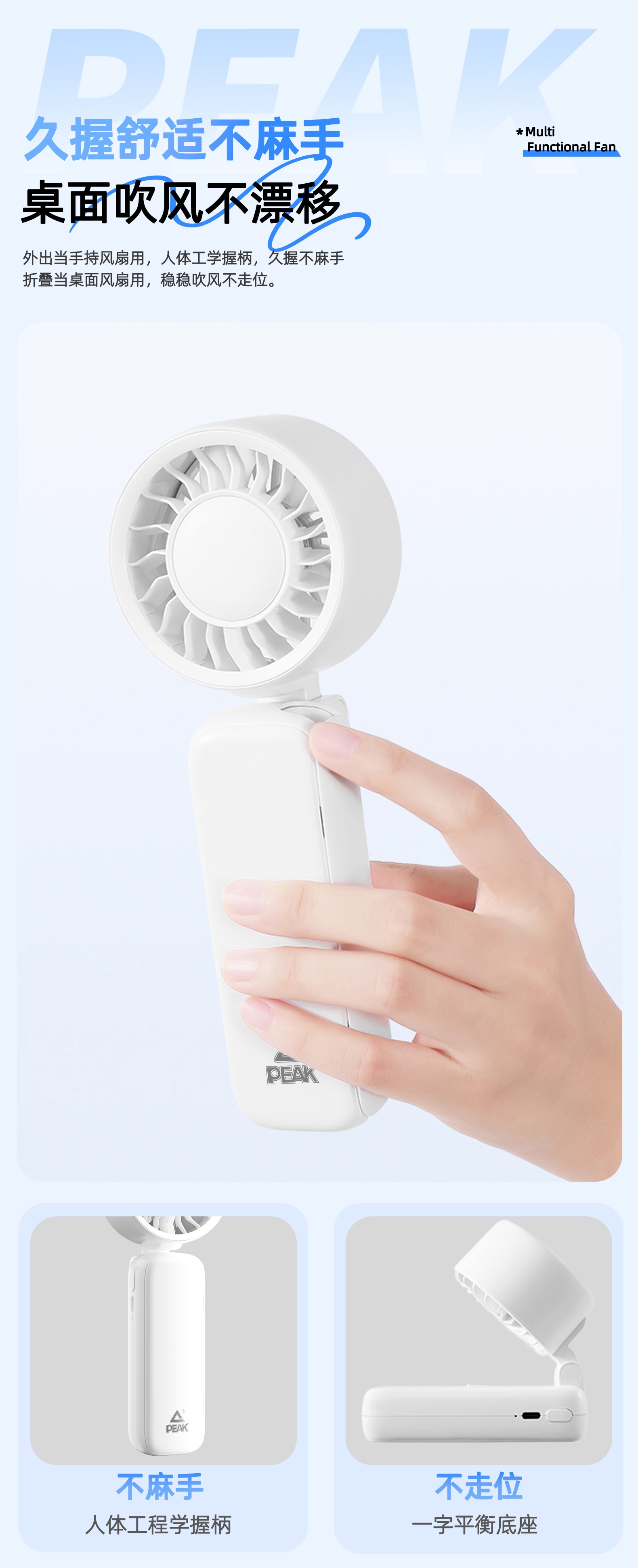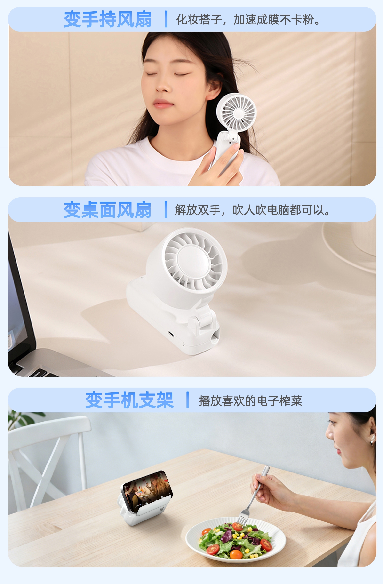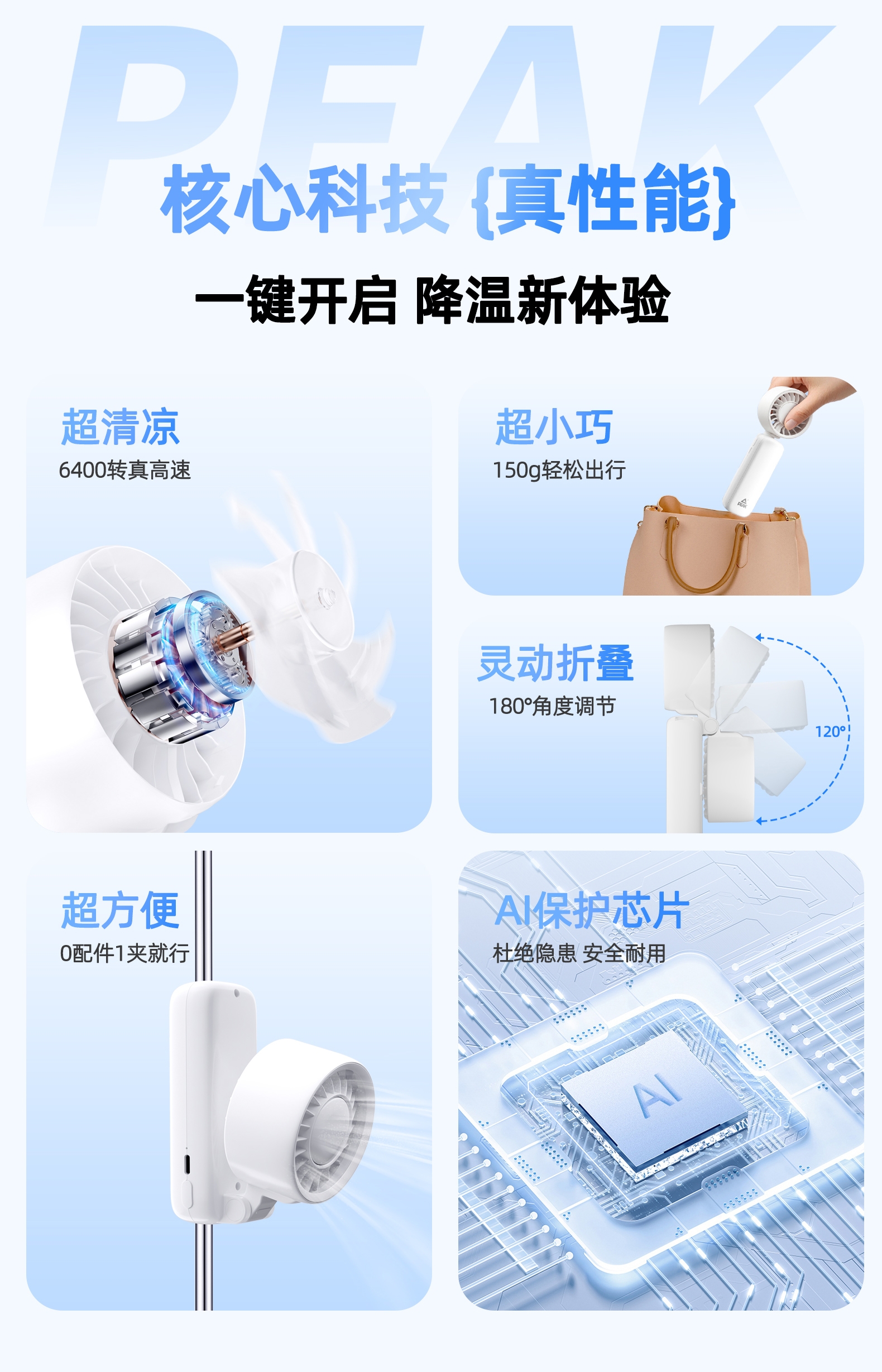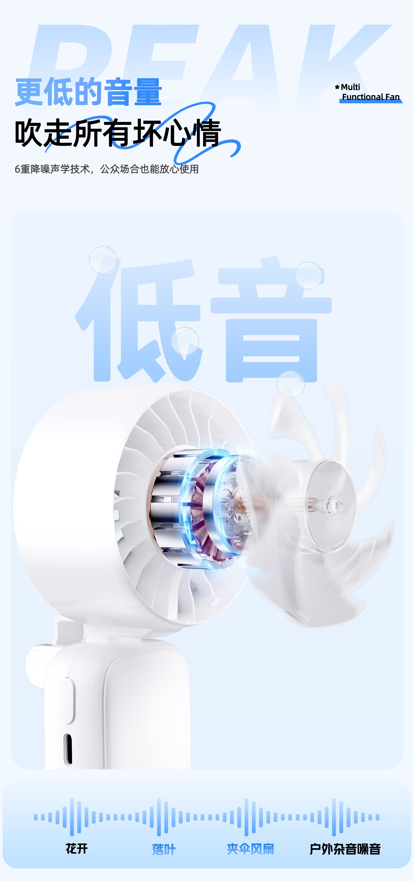 超高速冰爽风 灵动折叠 180°角度调节;USB接口 多种供电方式 轻松应对各种场景;;更低的音量 吹走所有坏心情