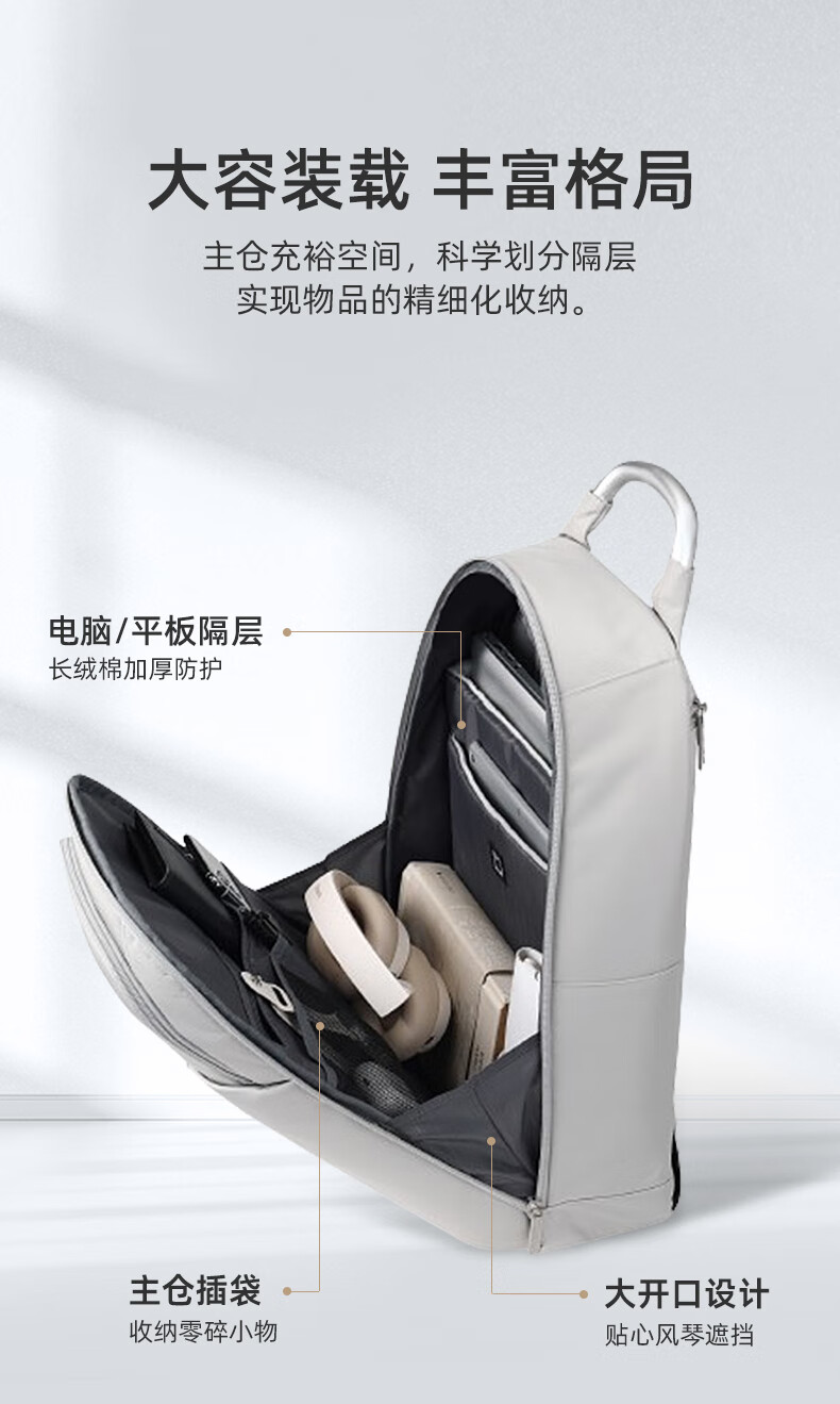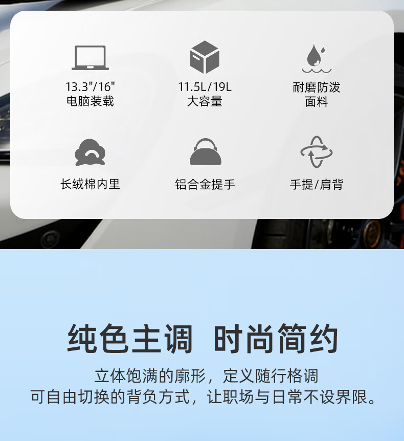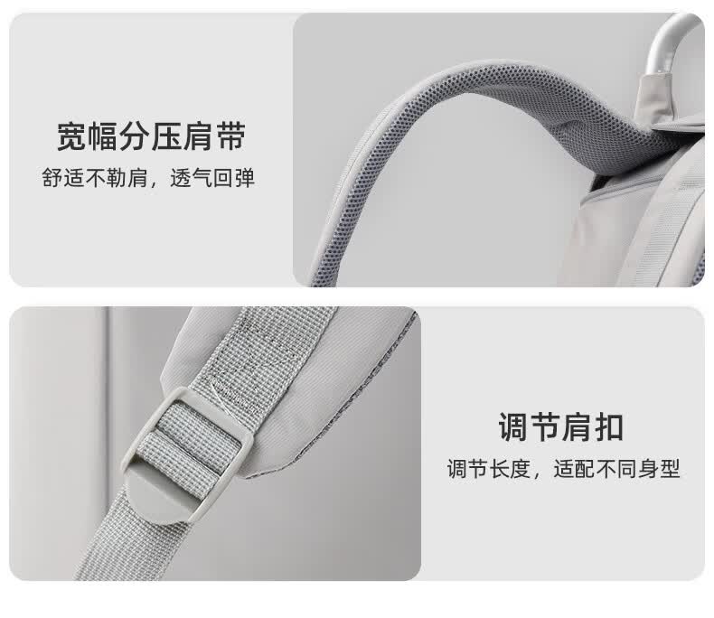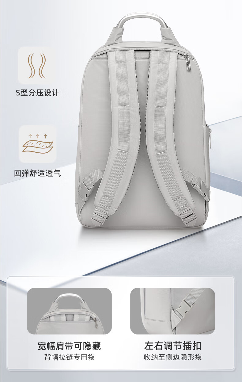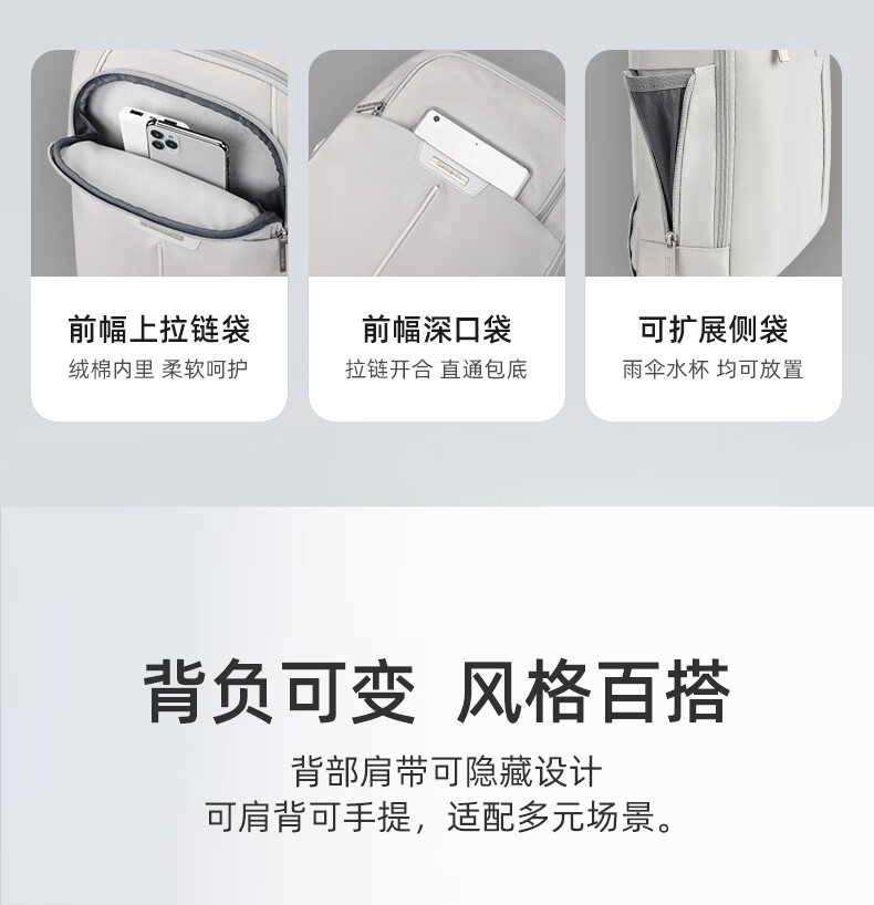 独立13.3英寸电脑仓,魔术贴固定,更好保护电脑;背部肩带可隐藏设计,可双肩,可手提;;顺滑触感,防泼耐磨;