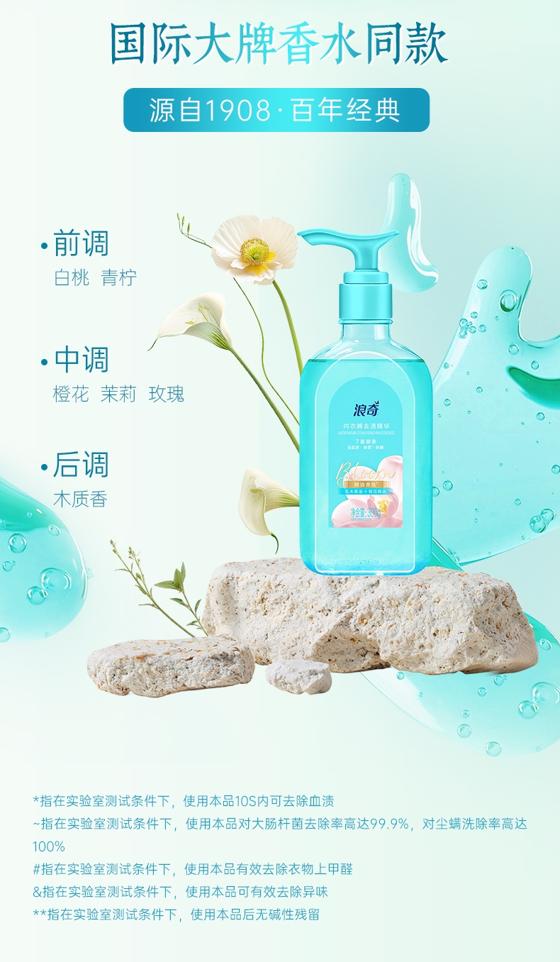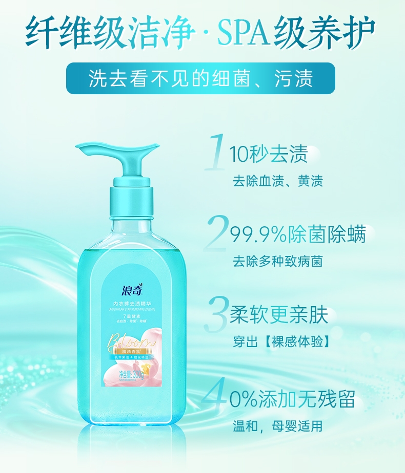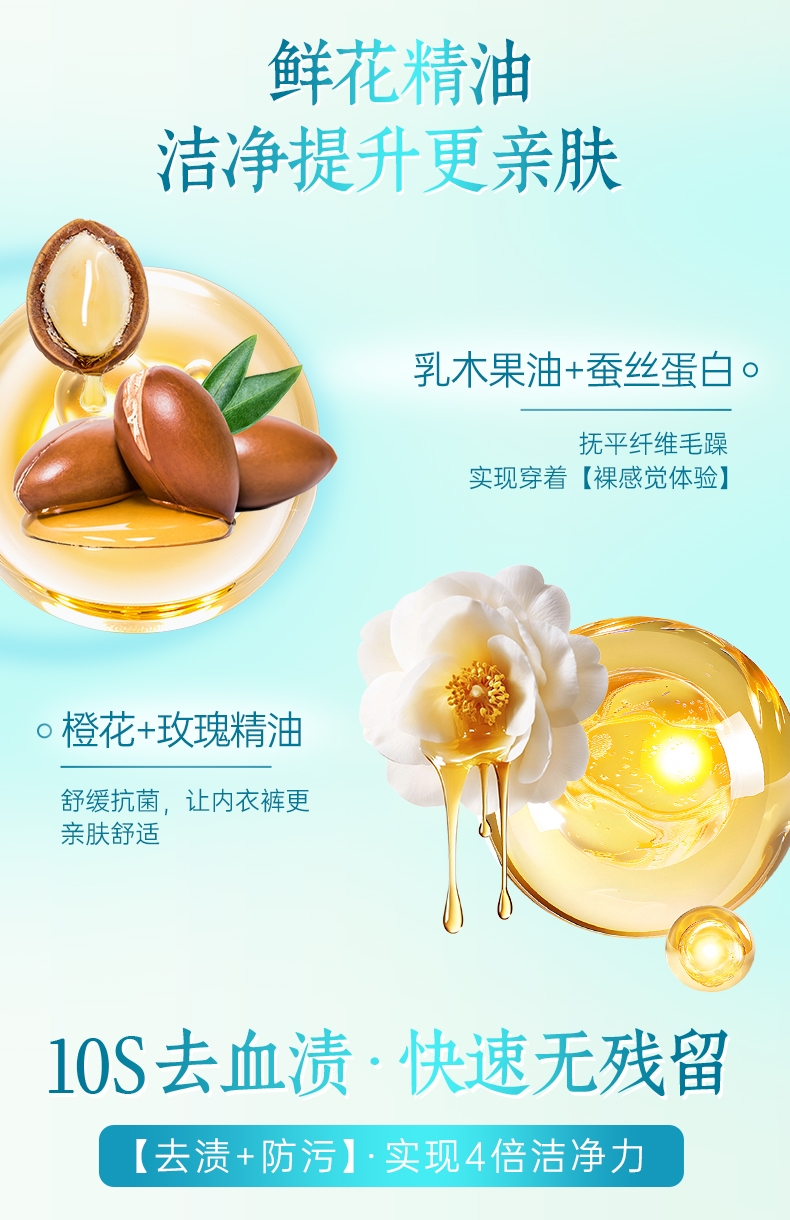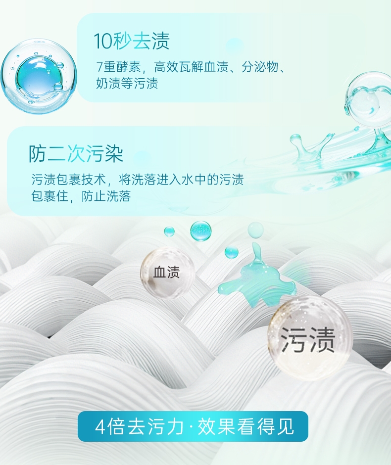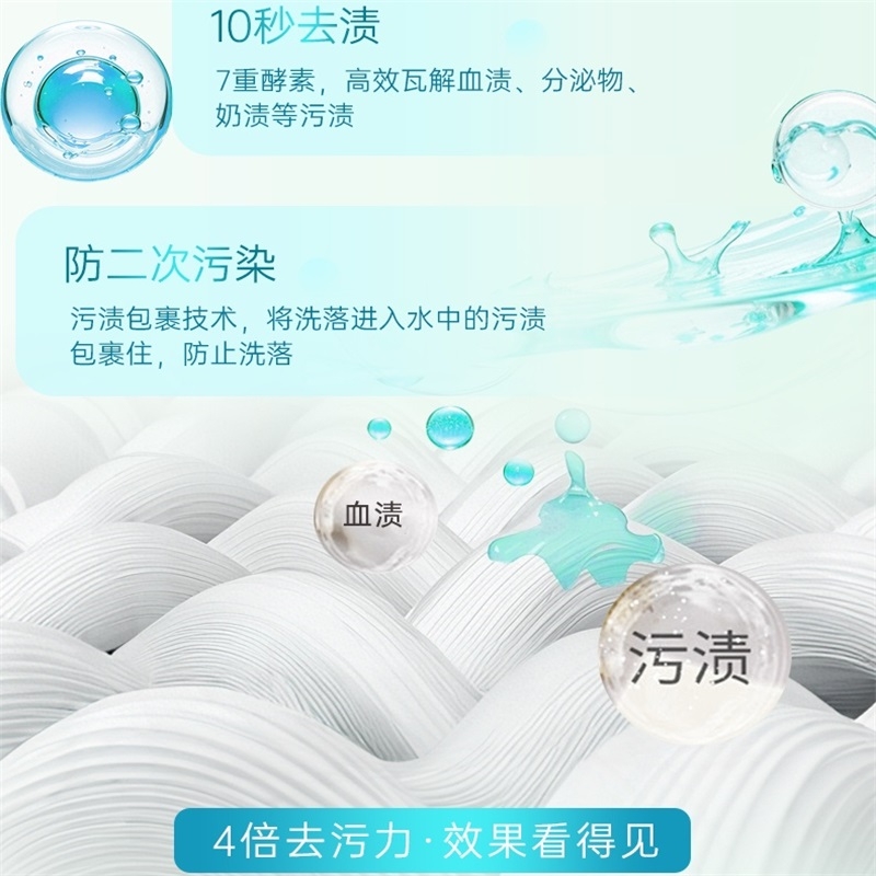 双重洁净技术,10秒去血渍;高浓洁净因子与7重进口活性酶,爆发超强去渍力;精油香氛,SPA级舒缓呵护,现实【裸感】愉悦体验
