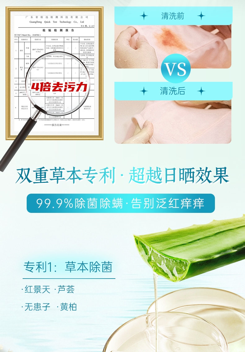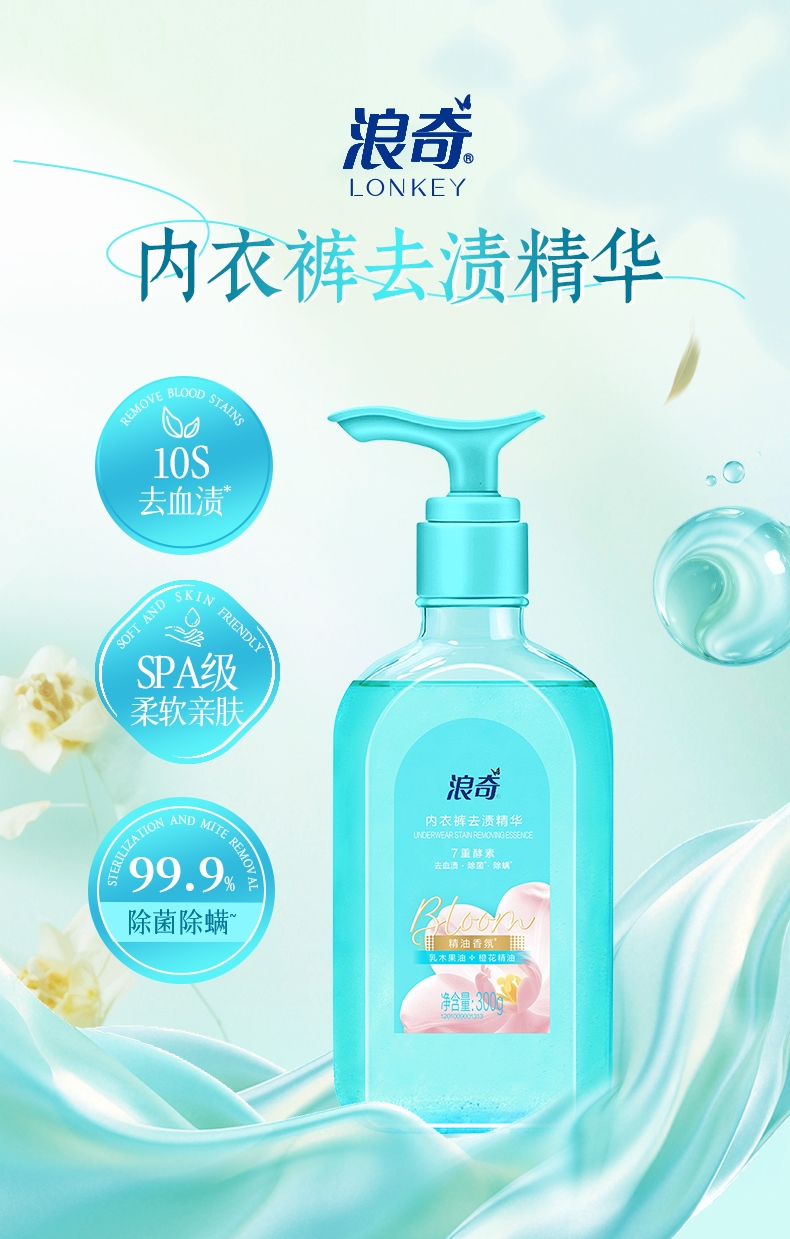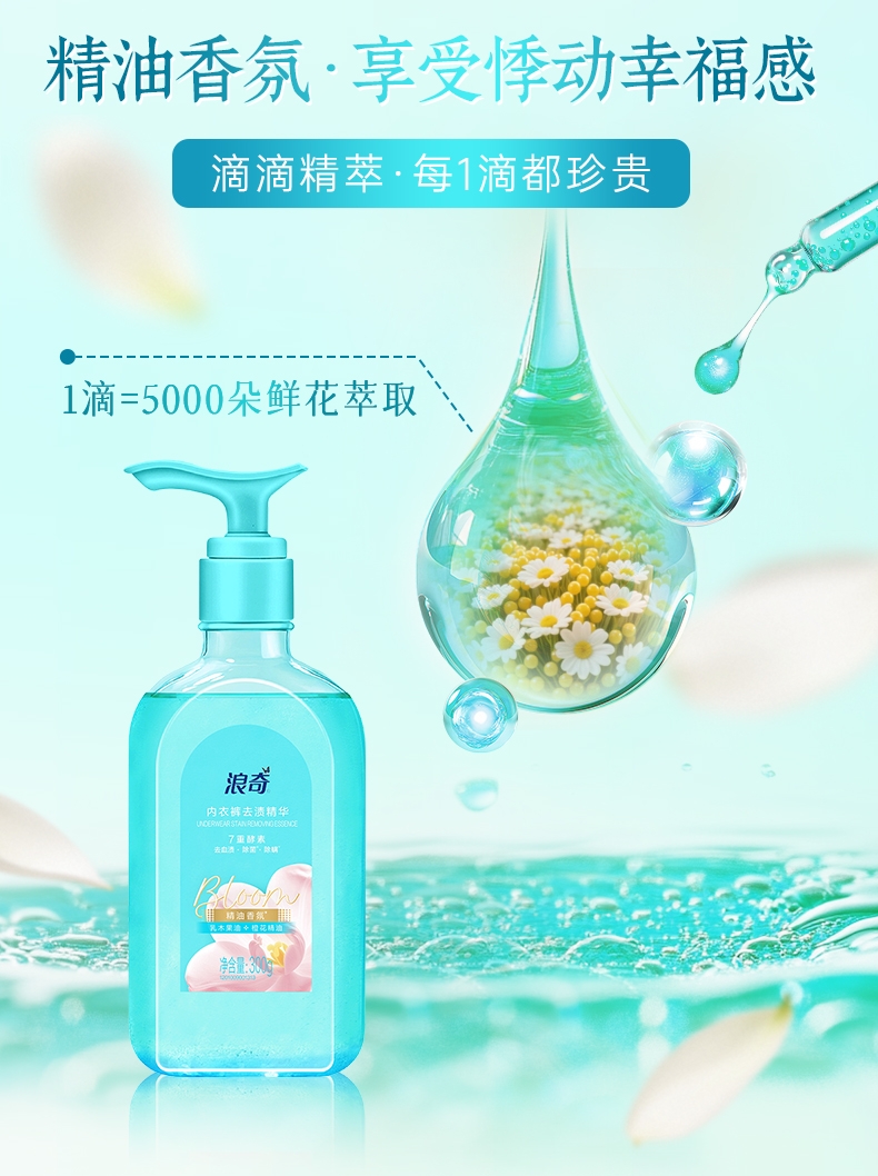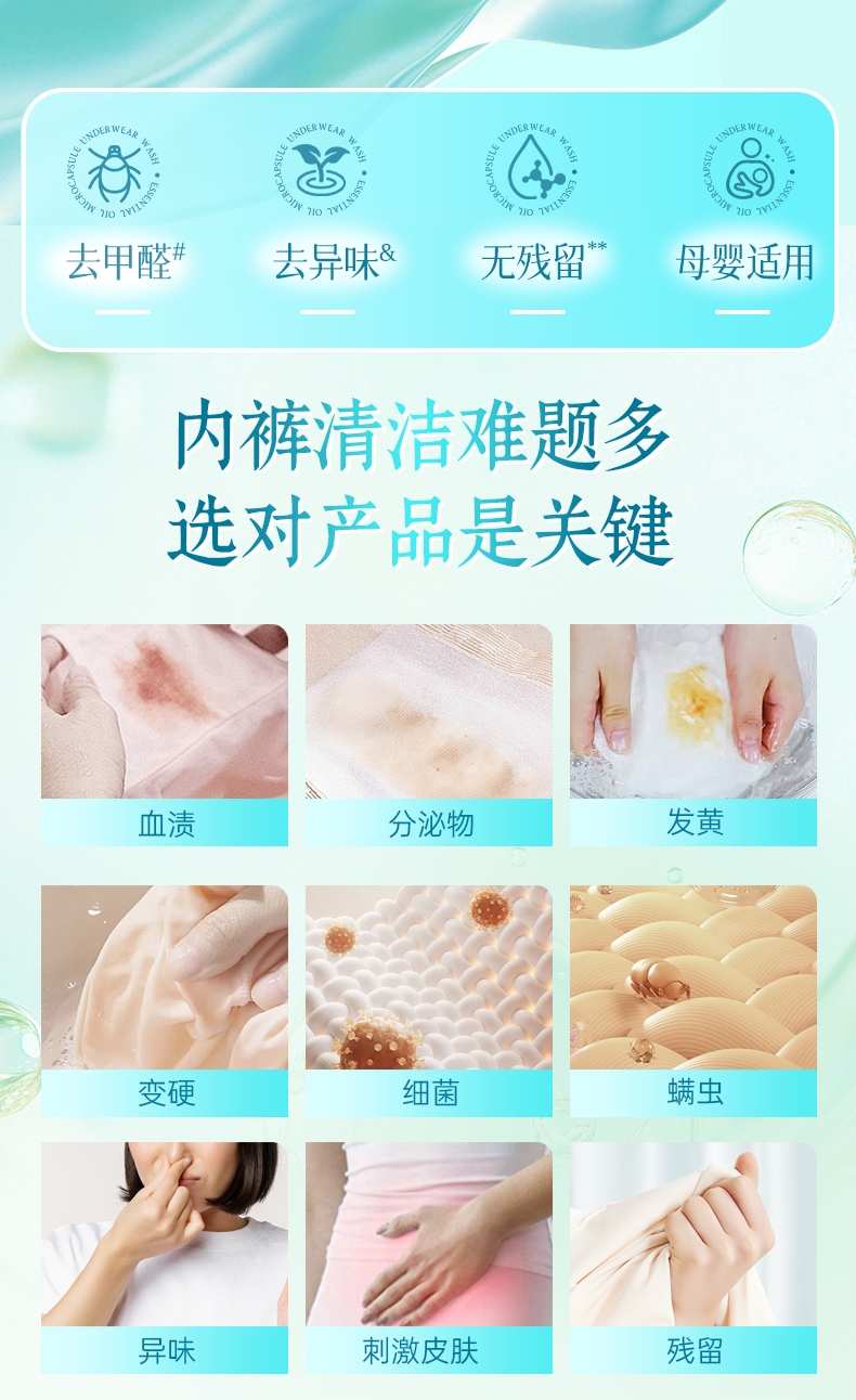双重洁净技术,10秒去血渍;高浓洁净因子与7重进口活性酶,爆发超强去渍力;精油香氛,SPA级舒缓呵护,现实【裸感】愉悦体验