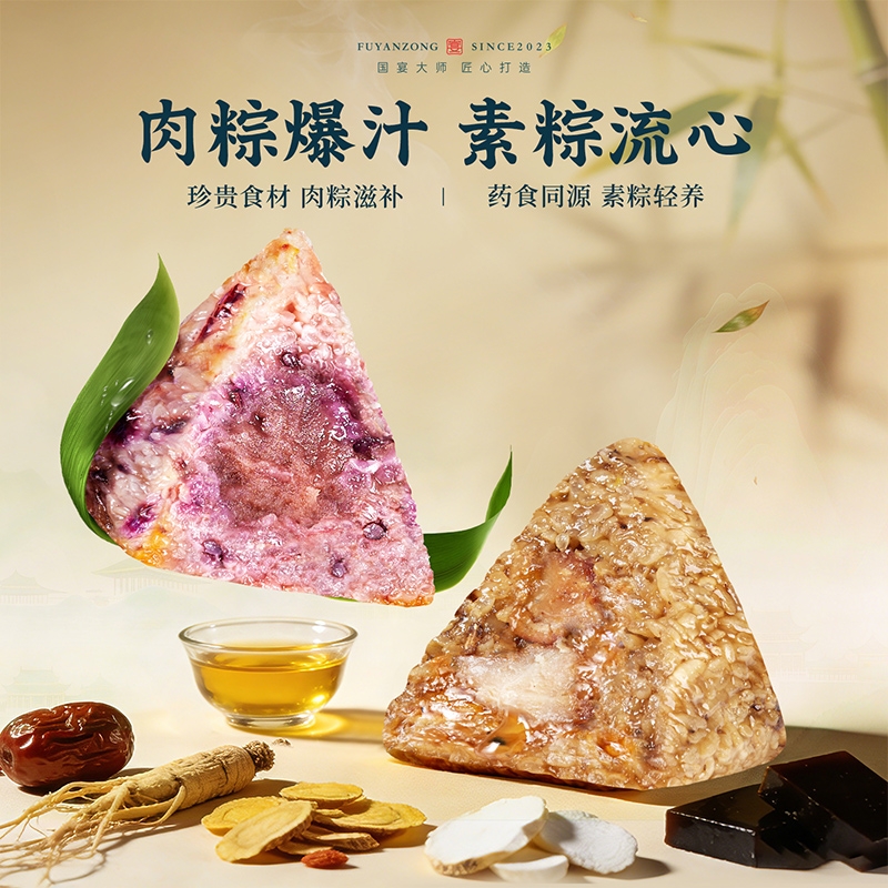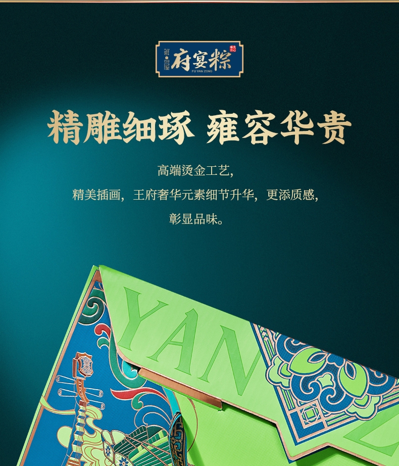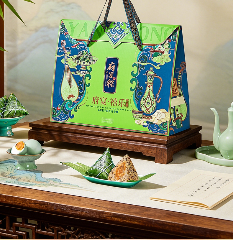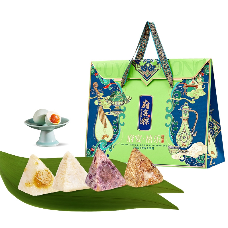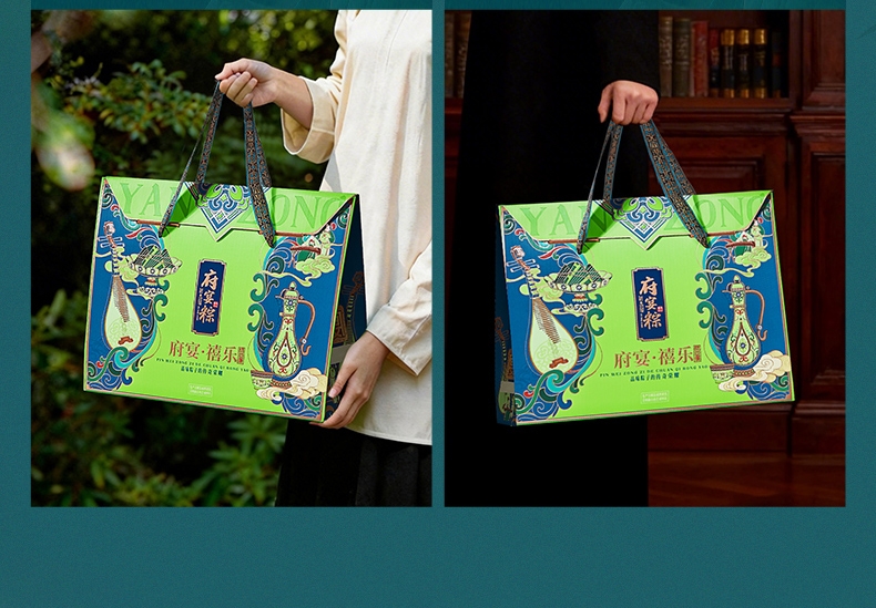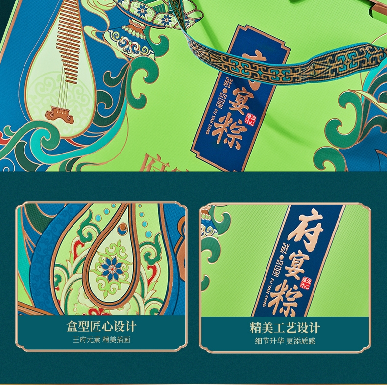 异形提盒设计,造型独特;盒上描绘华庭欢宴,举杯交错,满载喜乐安康;内含四粽四味,1爆汁肉粽3素粽,搭配两枚海鸭蛋
