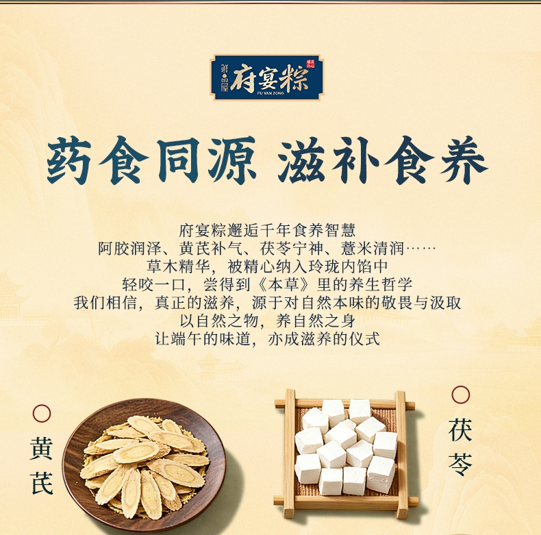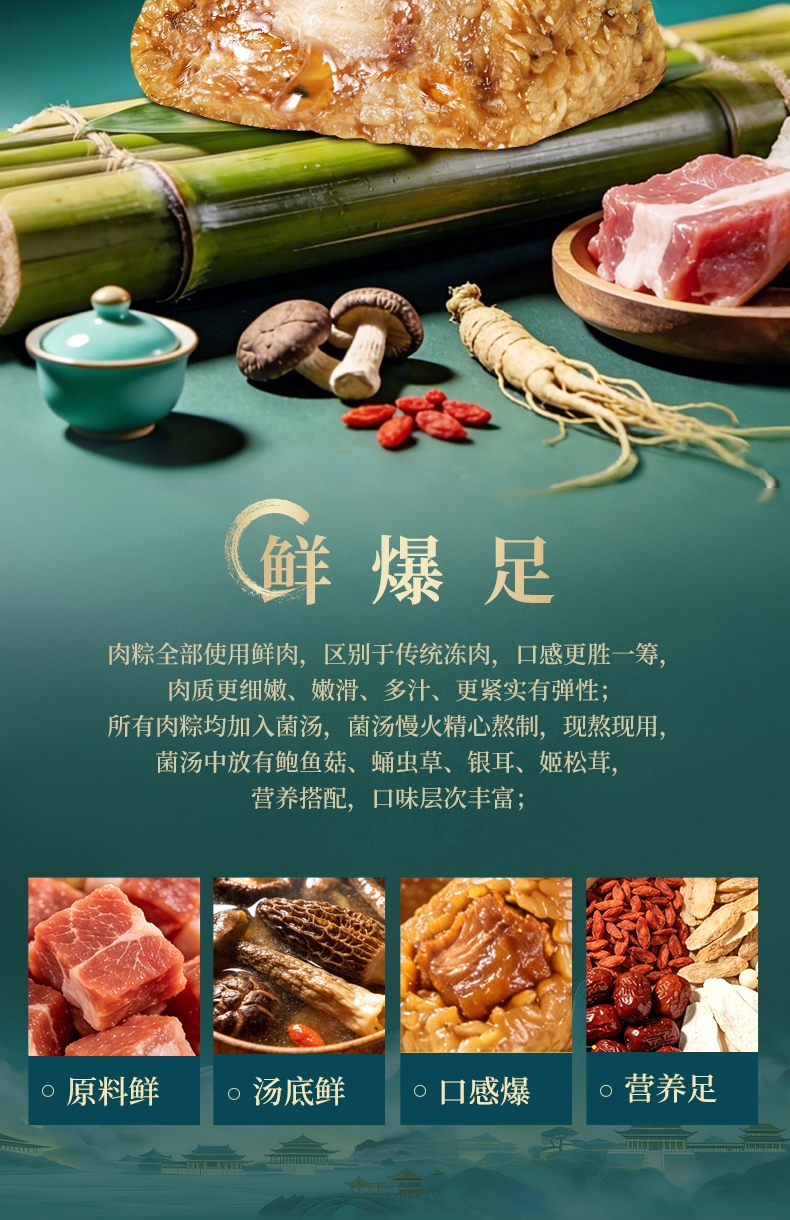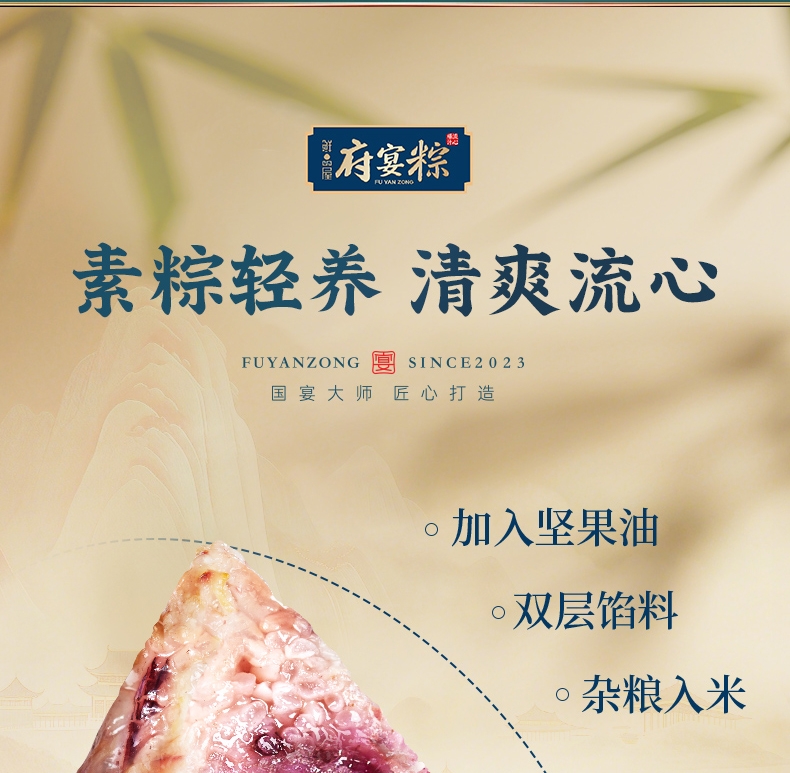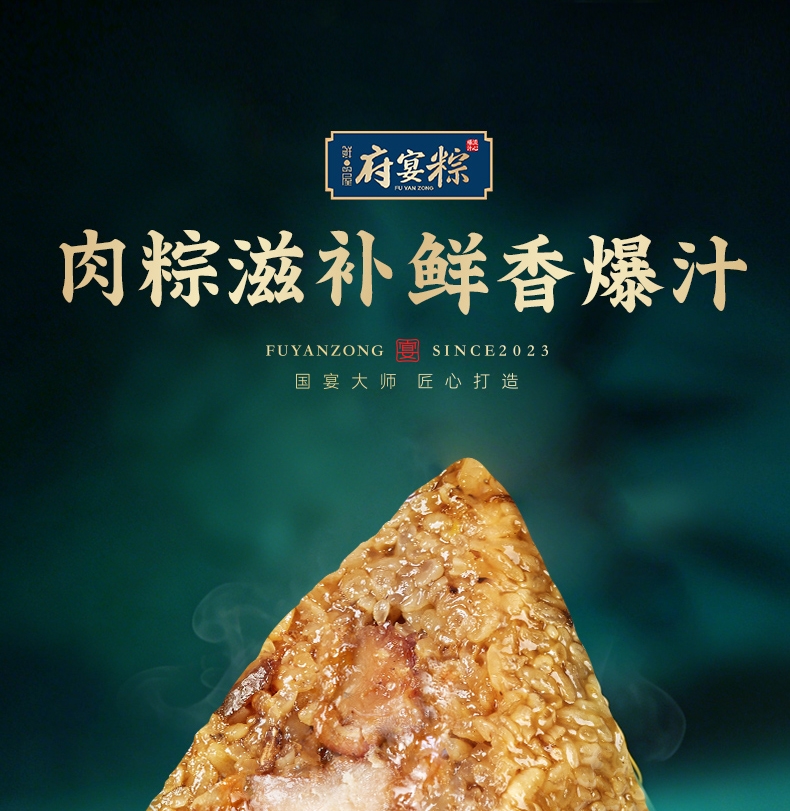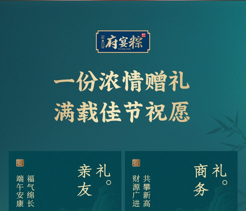 异形提盒设计,造型独特;盒上描绘华庭欢宴,举杯交错,满载喜乐安康;内含四粽四味,1爆汁肉粽3素粽,搭配两枚海鸭蛋