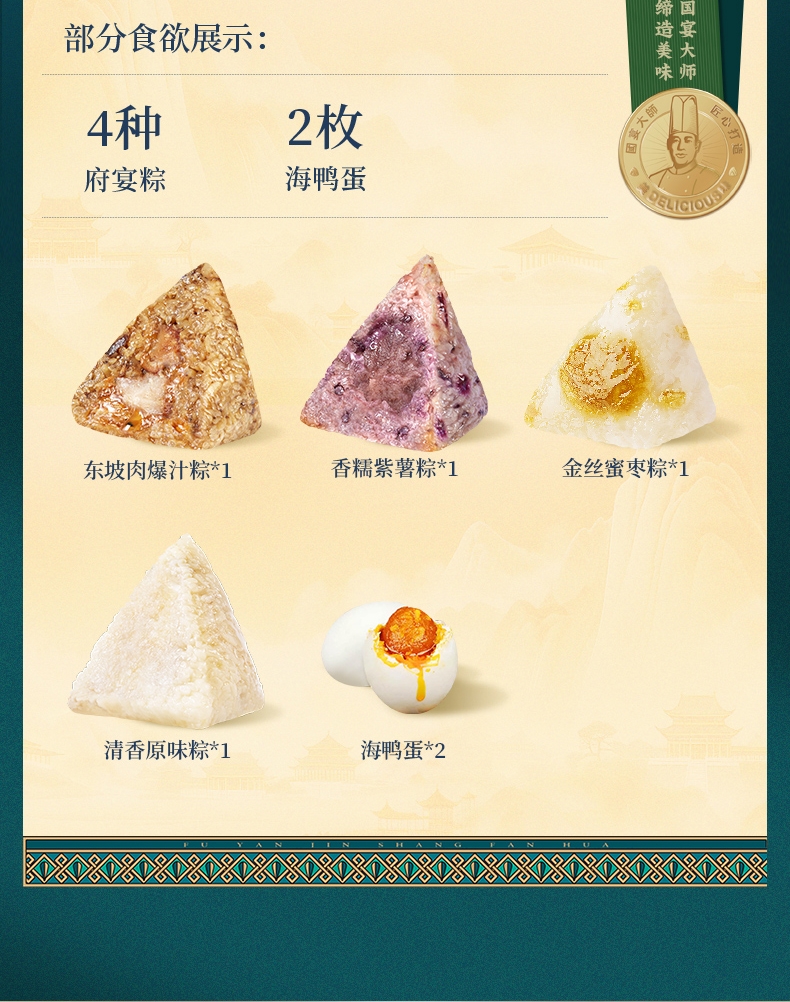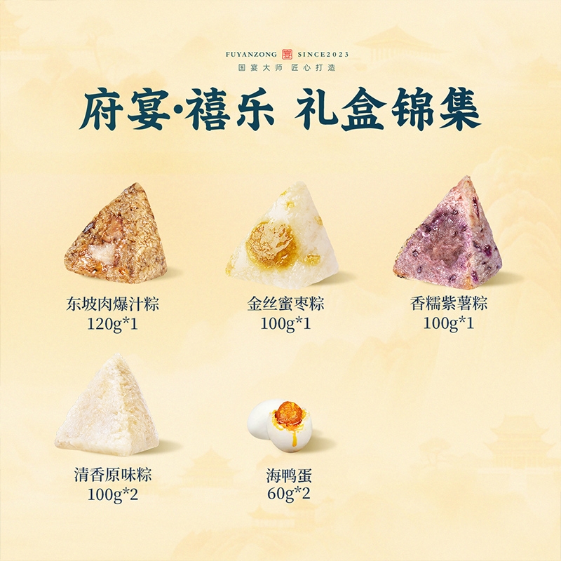 配置清单:1、鲜品屋-120g东坡肉爆汁粽*1 2、鲜品屋-100g香糯紫薯粽*1 3、鲜品屋-100g金丝蜜枣粽*1 4、鲜品屋-100g清香原味粽*1 5、鲜品屋-60g海鸭蛋*2