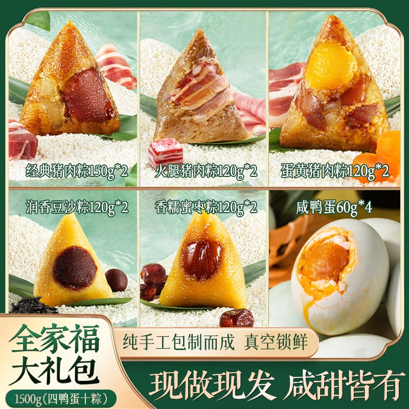 内配:经典猪肉粽150g*2 蛋黄猪肉粽120g*2 火腿猪肉粽120g*2 润香豆沙粽120g*2 香糯蜜枣粽120g*2 60g*4咸鸭蛋