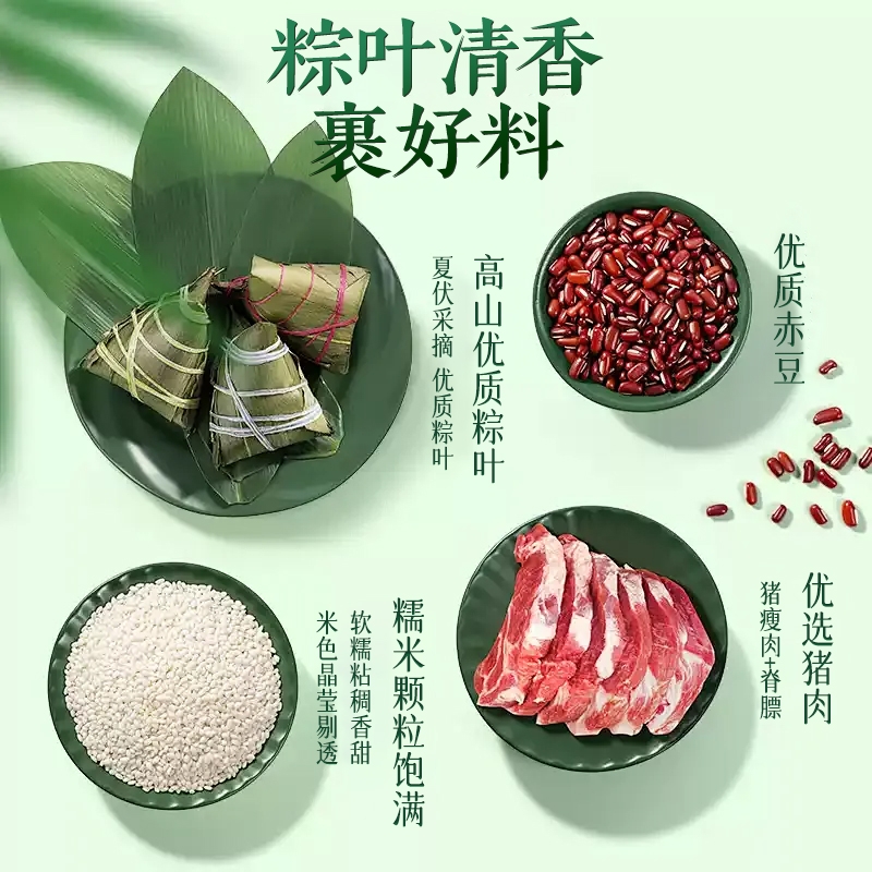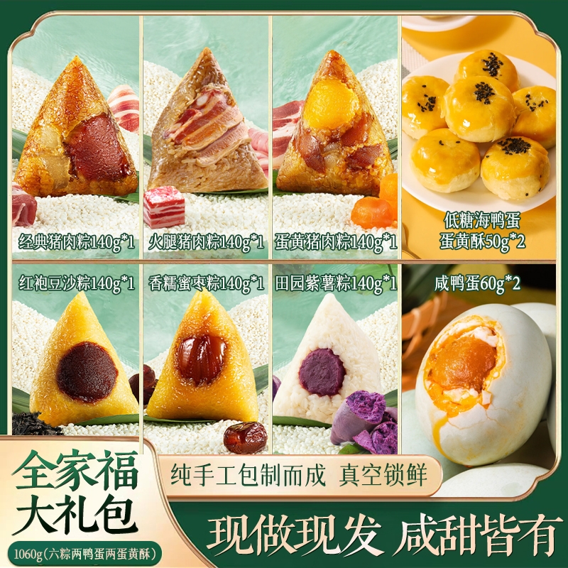 内配:经典鲜肉粽140g*1 蛋黄鲜肉粽140g*1 火腿鲜肉粽140g*1 田园紫薯粽140g*1 红袍豆沙粽140g*1 金丝蜜枣粽140g*1 低糖海鸭蛋蛋黄酥50g*2 60g*2咸鸭蛋