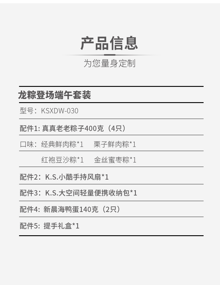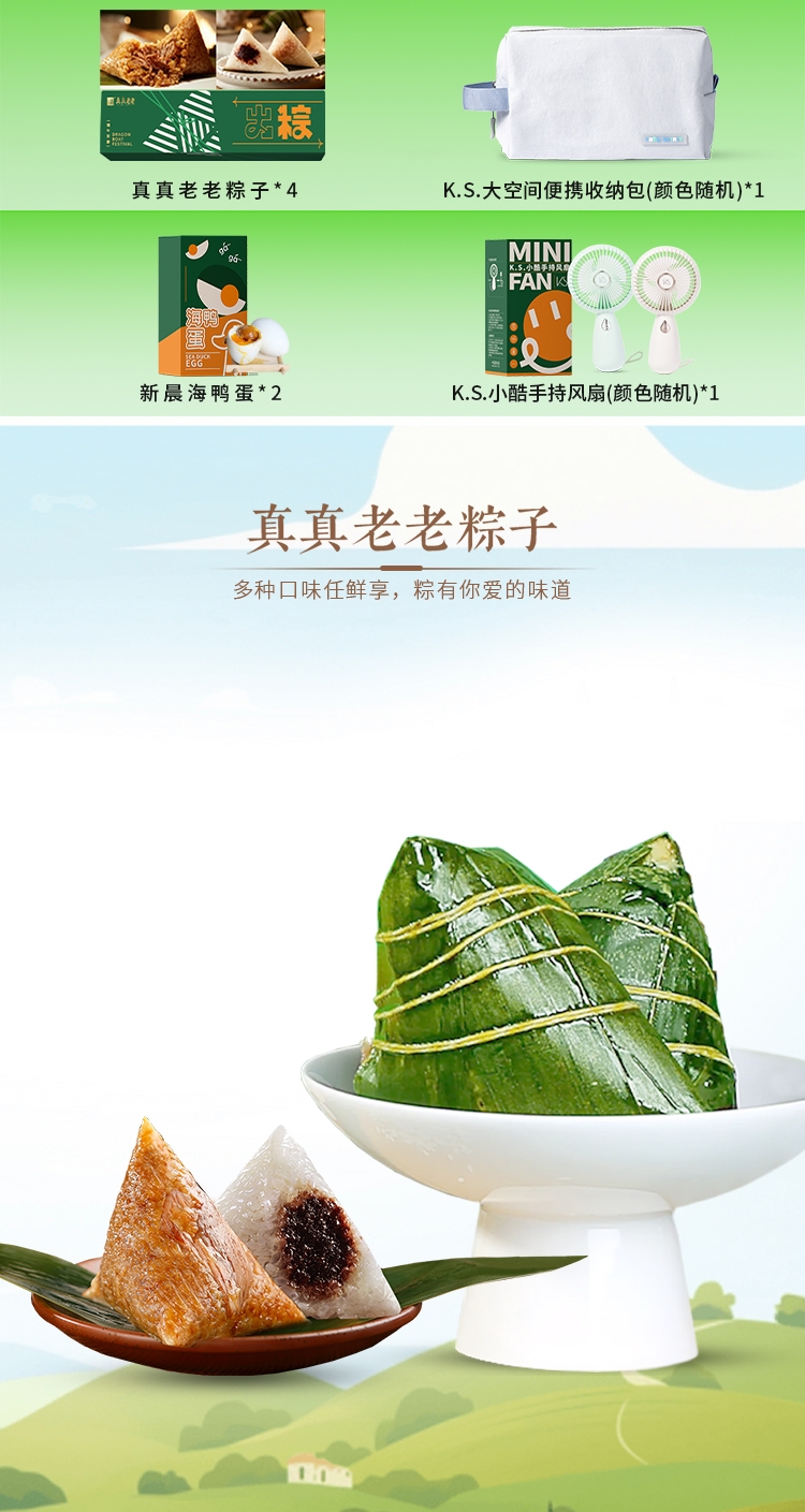 配置清单:1. 真真老老粽子400克(4只) 2. 新晨海鸭蛋 140克(2只) 3. K.S.大容量收纳包*1 4. K.S.小酷手持风扇*1 5. 提手礼盒*1 真真老老粽子口味(单只100g): 经典鲜肉粽*1 栗子鲜肉粽*1 红袍豆沙粽*1 金丝蜜枣粽*1