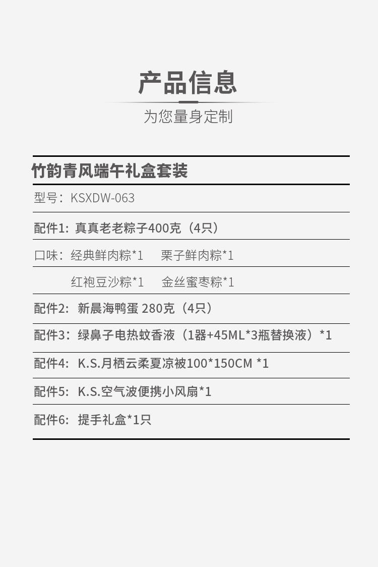 配置清单:1. 真真老老粽子400克(4只)配棉网束口袋 2. 新晨海鸭蛋280克 (4只) 3. 绿鼻子电热蚊香液(1器+45ML*3瓶替换液)*1 4. K.S.月栖云柔夏凉被150*200CM *1 5. K.S.空气波便携小风扇*1 6. 提手礼盒*1只 真真老老粽子口味(单只100g): 经典鲜肉粽*1 栗子鲜肉粽*1 红袍豆沙粽*1 金丝蜜枣粽*1