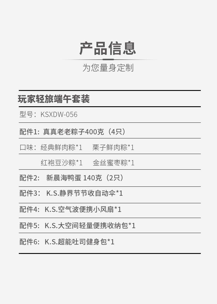 配置清单:1. 真真老老粽子400克(4只)配棉网束口袋 2. 新晨海鸭蛋 140克(2只) 3. K.S.静界节节收自动伞*1 4. K.S.空气波便携小风扇*1 5. K.S.大空间轻量便携收纳包*1 6. K.S.超能吐司健身包 *1 真真老老粽子口味(单只100g): 经典鲜肉粽*1 栗子鲜肉粽*1 红袍豆沙粽*1 金丝蜜枣粽*1