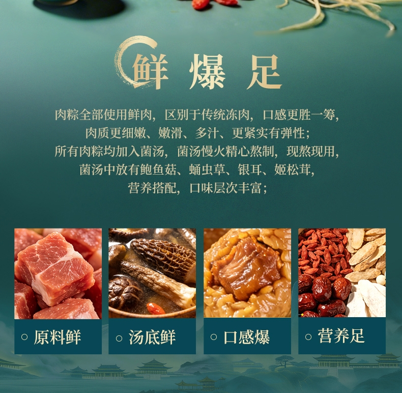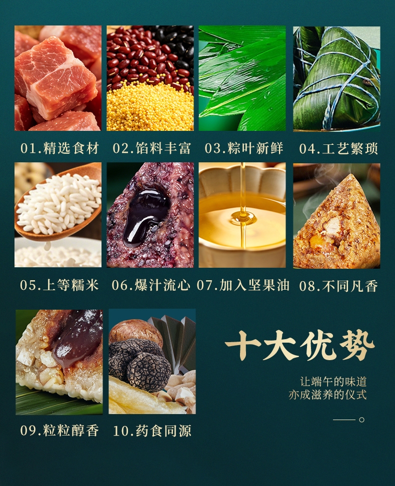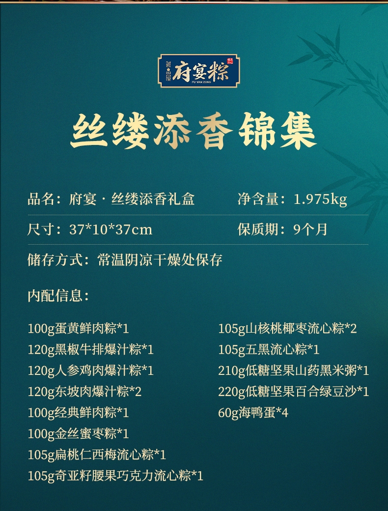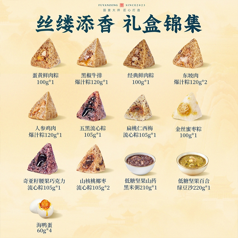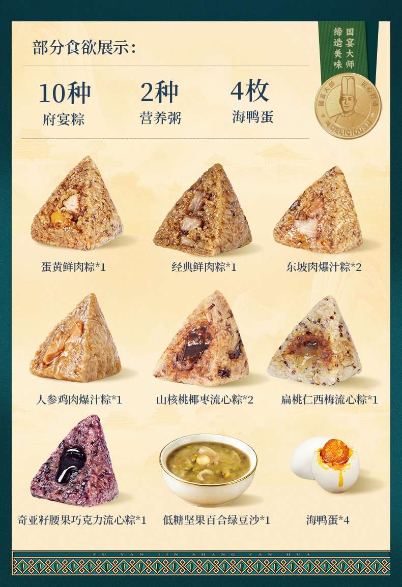 配置清单:1、鲜品屋-100g蛋黄鲜肉粽*1 2、鲜品屋-120g黑椒牛排爆汁粽*1 3、鲜品屋-120g人参鸡肉爆汁粽*1 4、鲜品屋-120g东坡肉爆汁粽*2 5、鲜品屋-100g经典鲜肉粽*1 6、鲜品屋-100g金丝蜜枣粽*1 7、鲜品屋-105g扁桃仁西梅流心粽*1 8、鲜品屋-105g奇亚籽腰果巧克力流心粽*1 9、鲜品屋-105g山核桃椰枣流心粽*2 10、鲜品屋-105g五黑流心粽*1 11、鲜品屋-210g低糖坚果山药黑米粥*1 12、鲜品屋-220g低糖坚果百合绿豆沙*1 13、鲜品屋-60g海鸭蛋*4