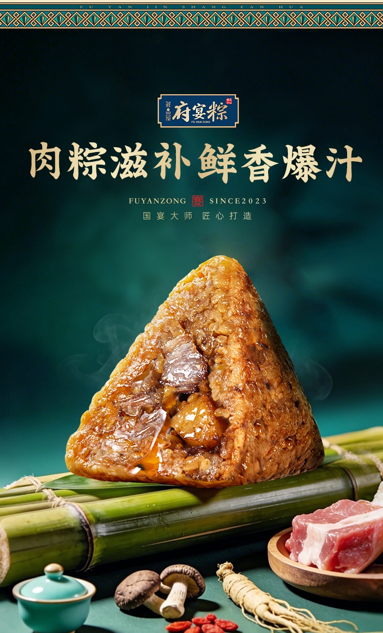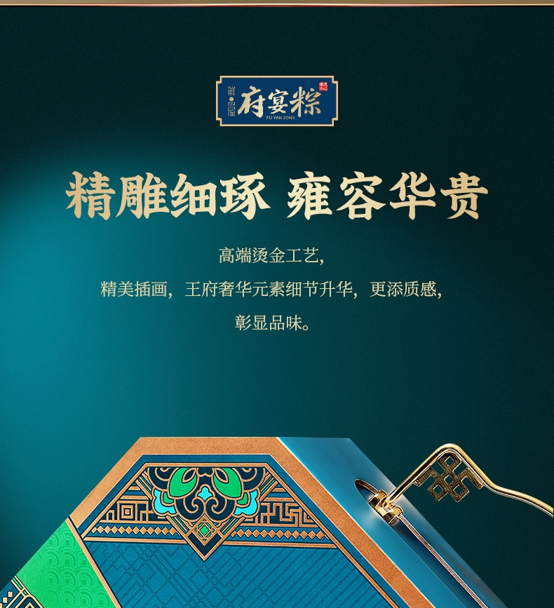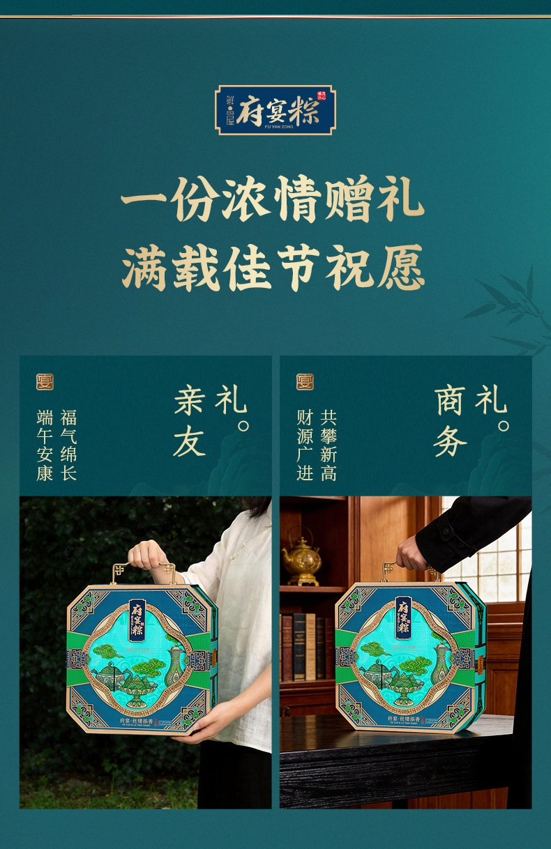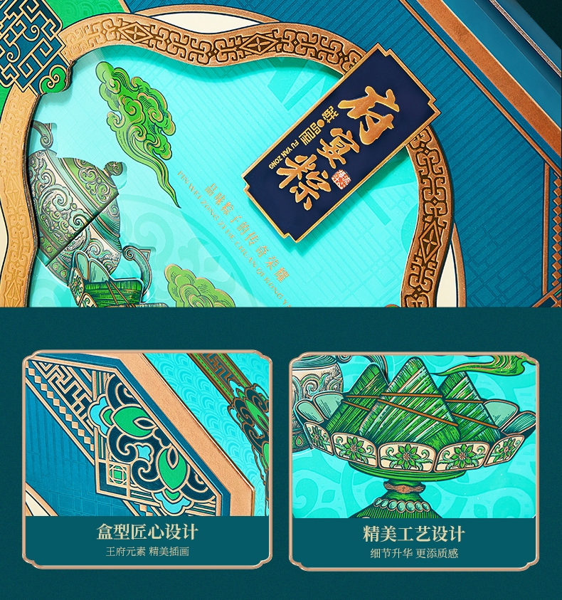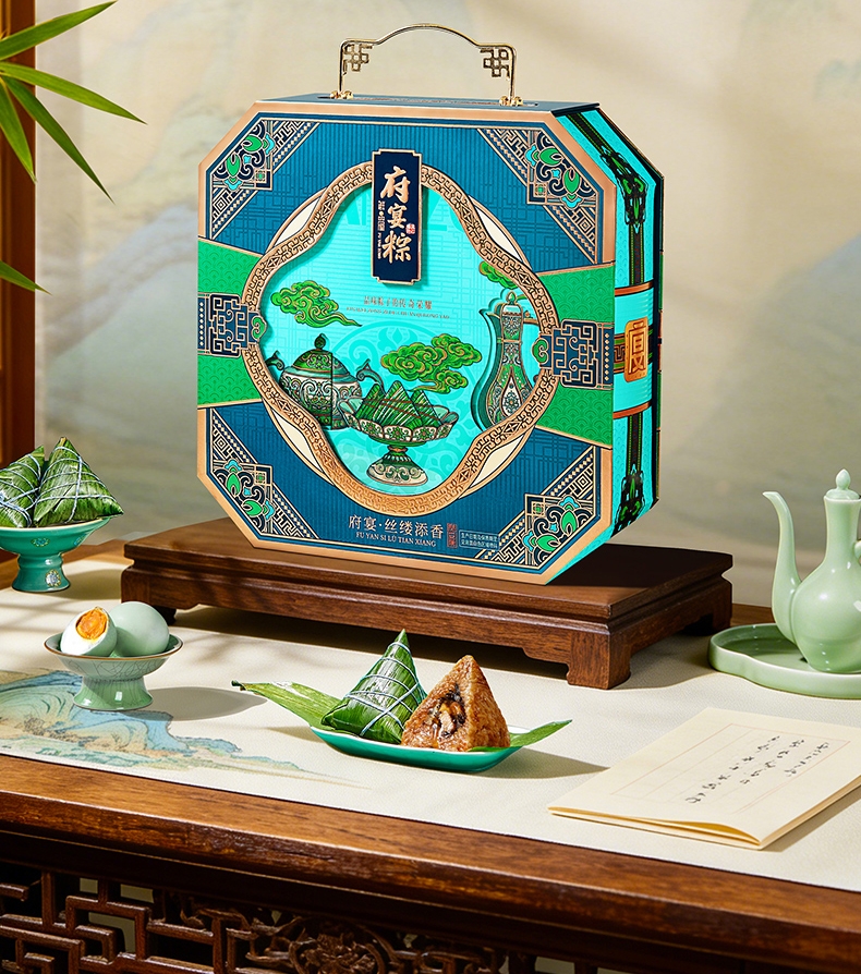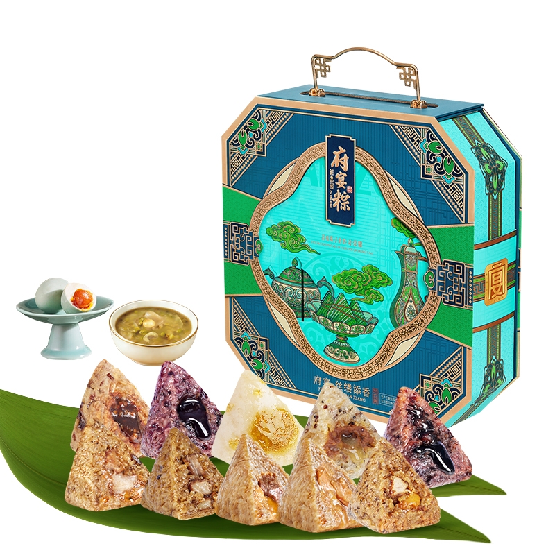 采用八角形礼盒设计,造型独特且大气;寓意“八方来财 ”、“ 四平八稳 ”;内含十二粽十味,六肉六素