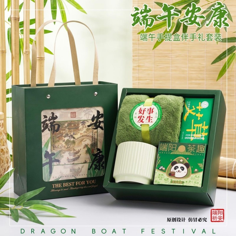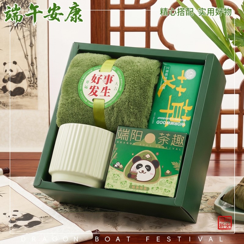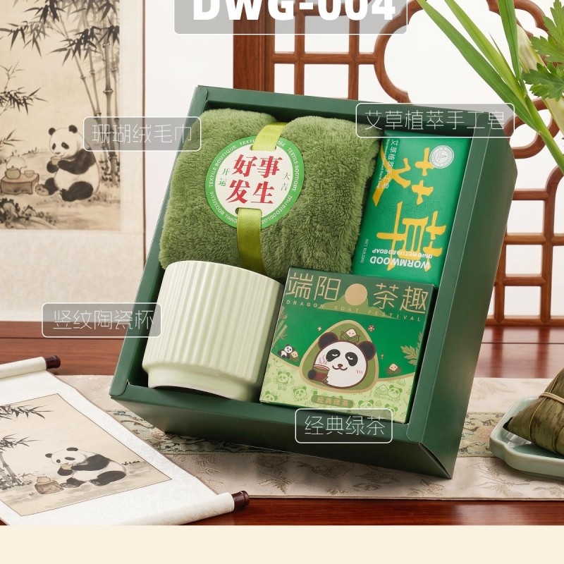 组合:陶瓷主人杯*1、韩方莉艾草植萃皂*1、端午经典绿茶2g*2袋、好事发生毛巾35*74CM