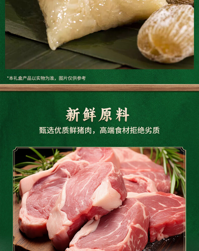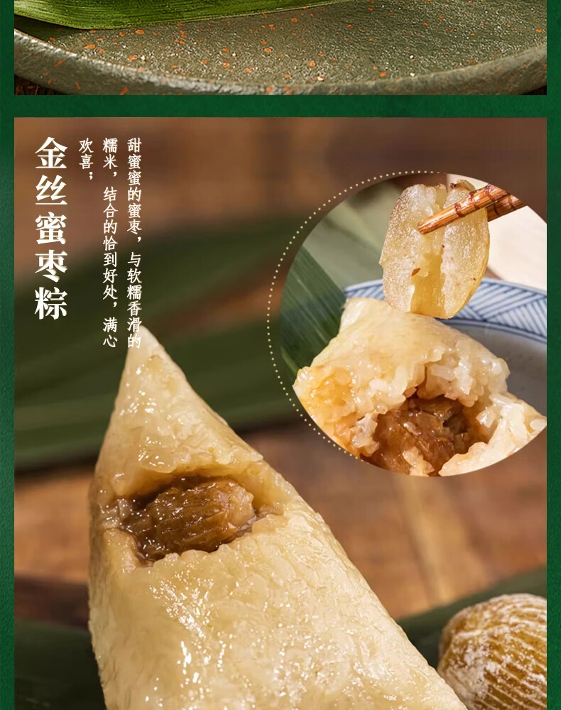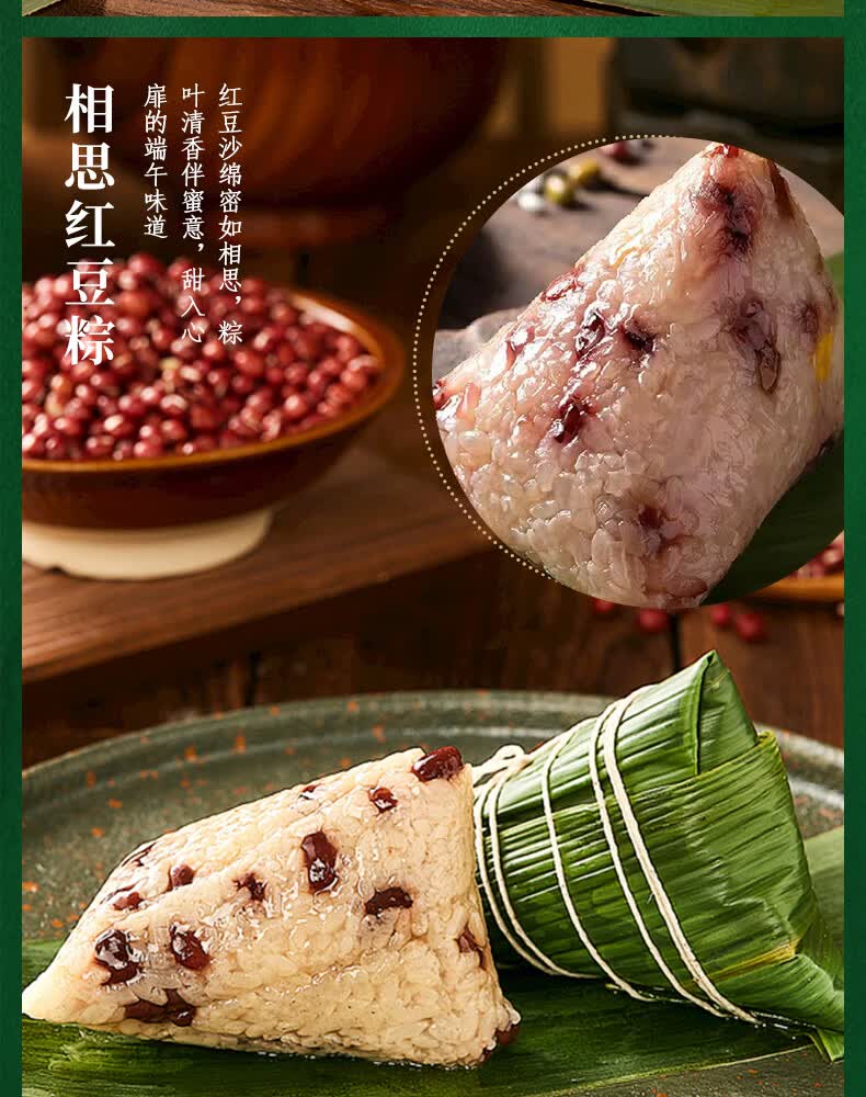 配置清单:经典鲜肉粽100g*2 蛋黄鲜肉粽100g*2 金丝蜜枣粽100g*2 相思红豆粽100g*2