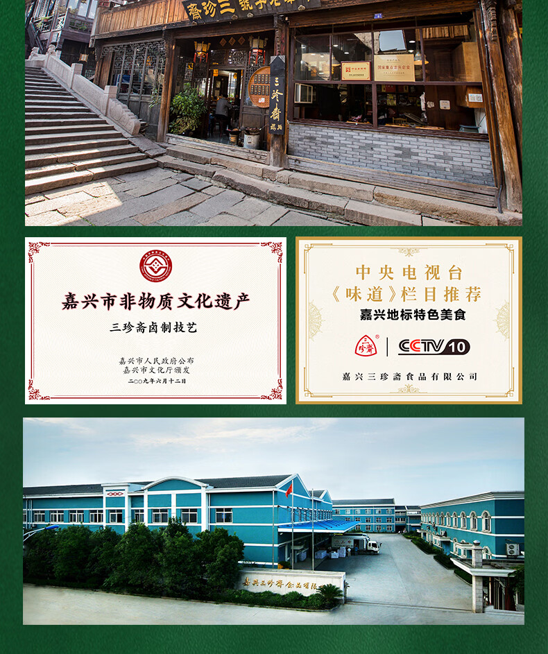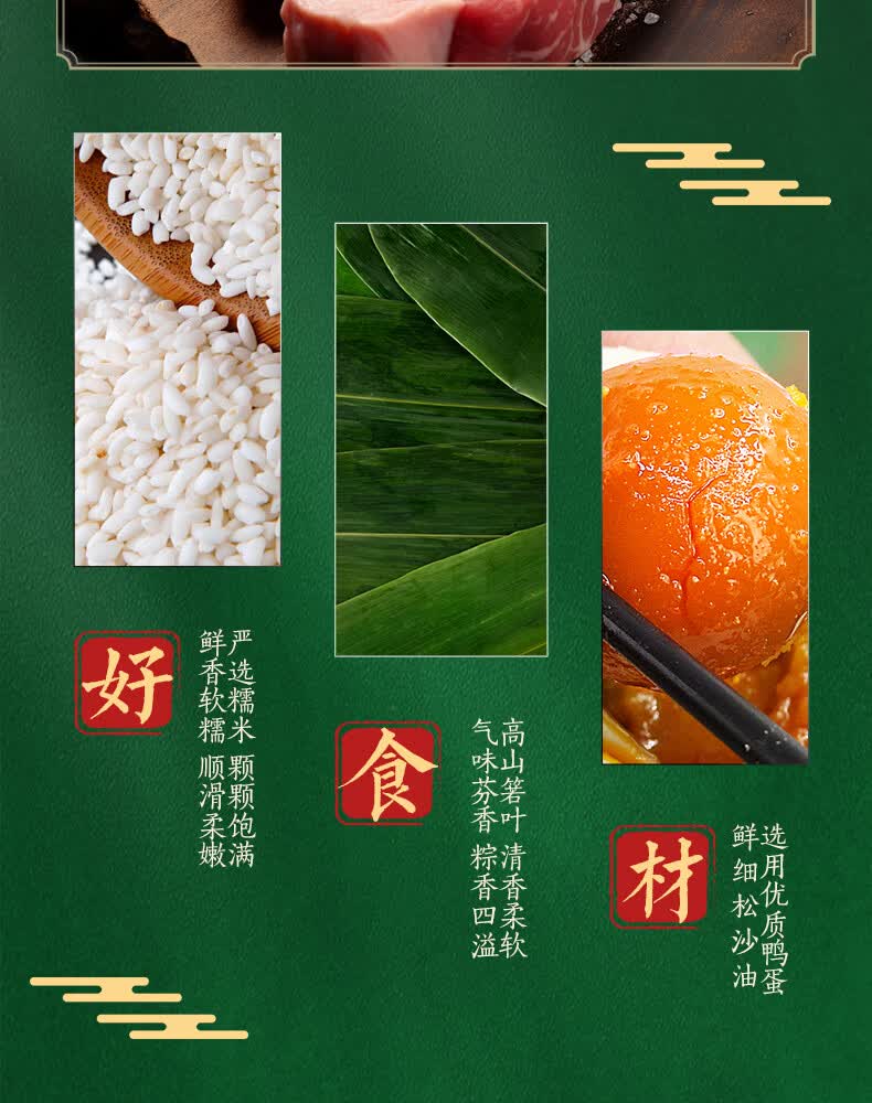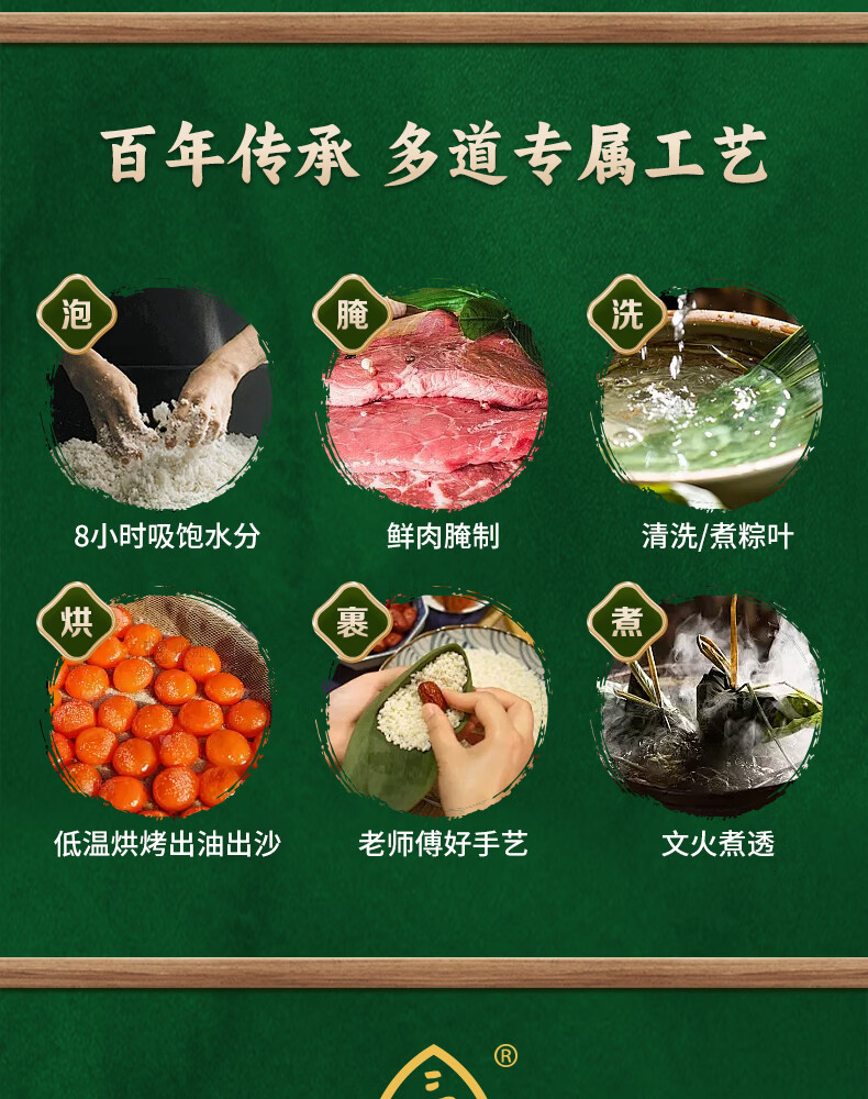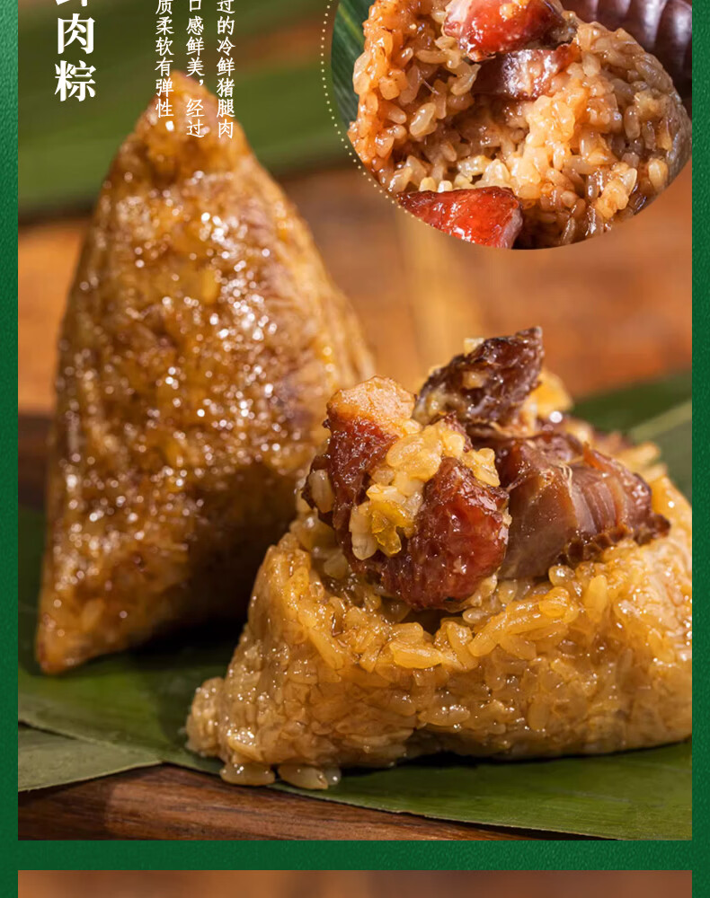 首批中华老字号、山姆认证工厂、嘉兴粽子代表品牌;选用江南当季新糯米、高山鲜粽叶、本地冷鲜猪腿肉;传统裹粽技艺、高温灭菌无添加更健康