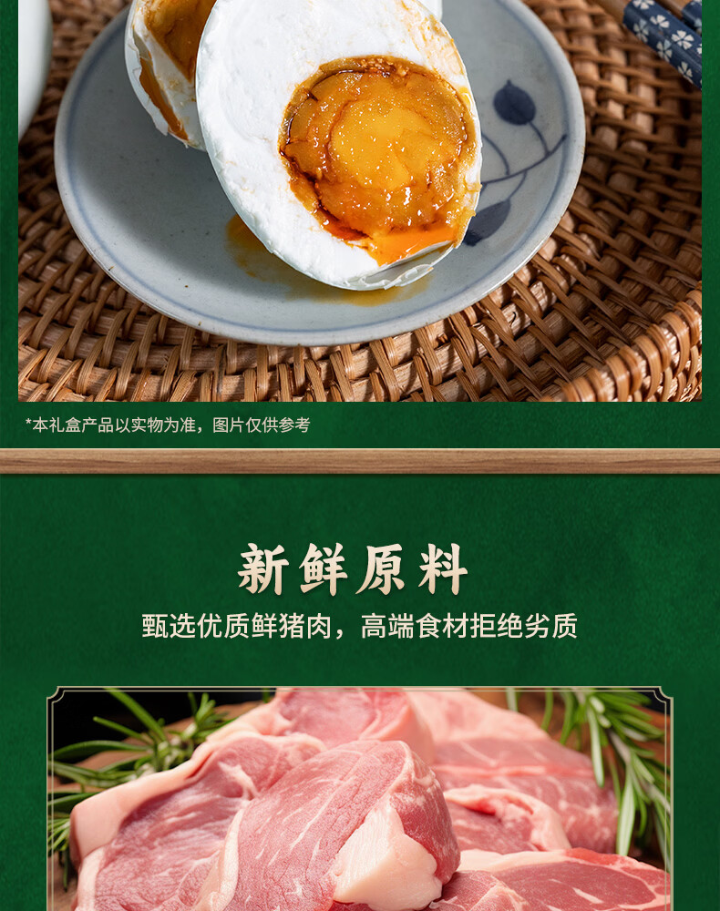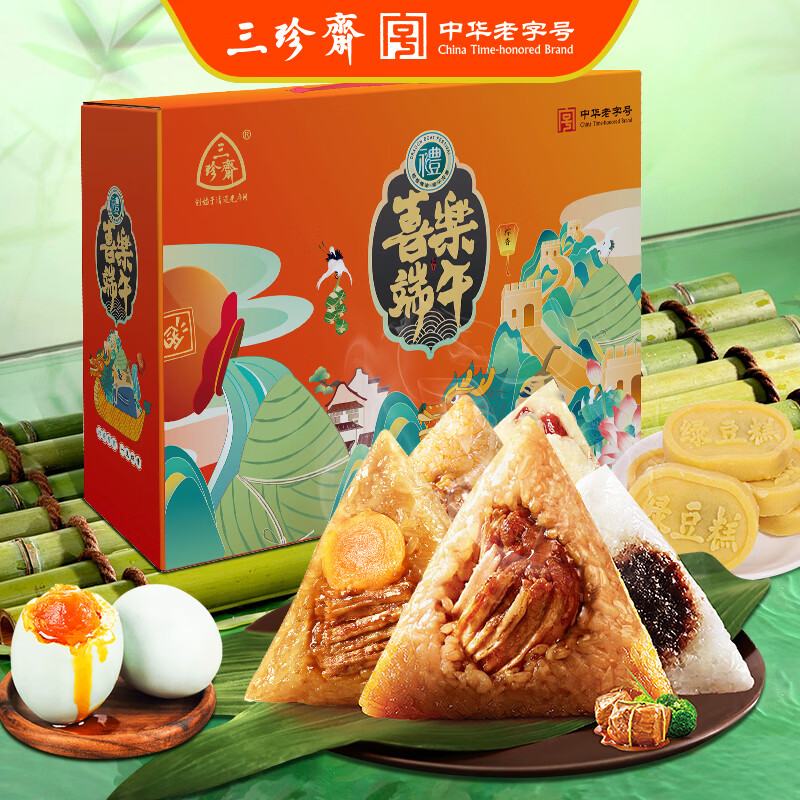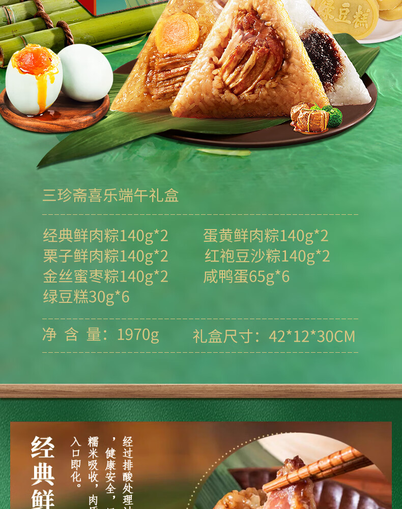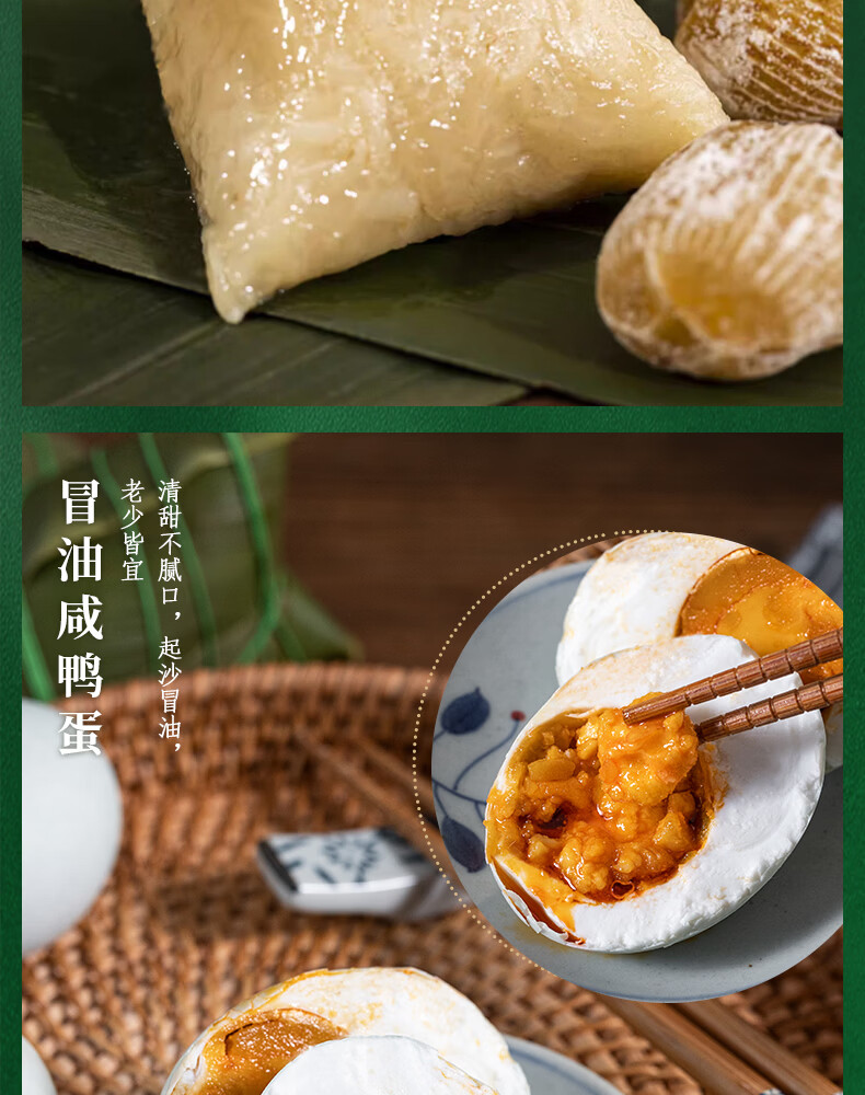 配置清单:经典鲜肉粽140g*2 蛋黄鲜肉粽140g*2 栗子鲜肉粽140g*2 红袍豆沙粽140g*2 金丝蜜枣粽140g*2 咸鸭蛋65g*6 绿豆糕30g*6