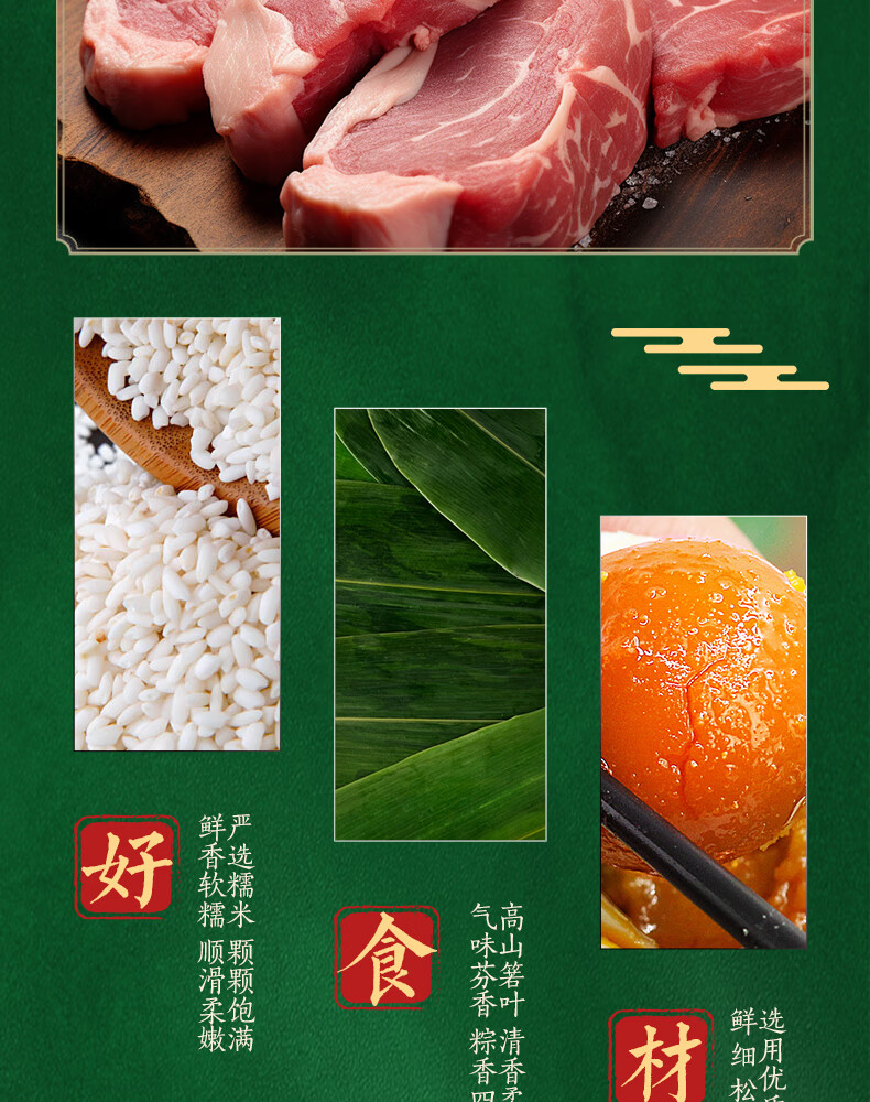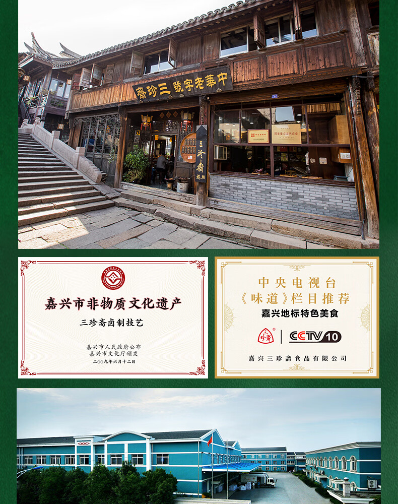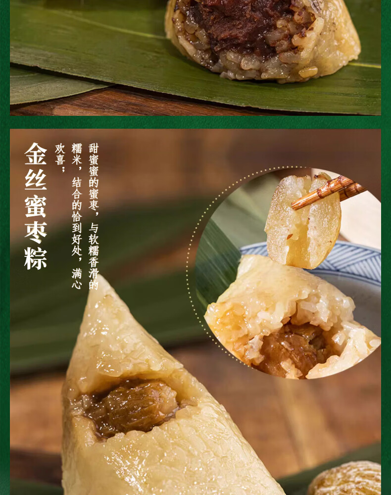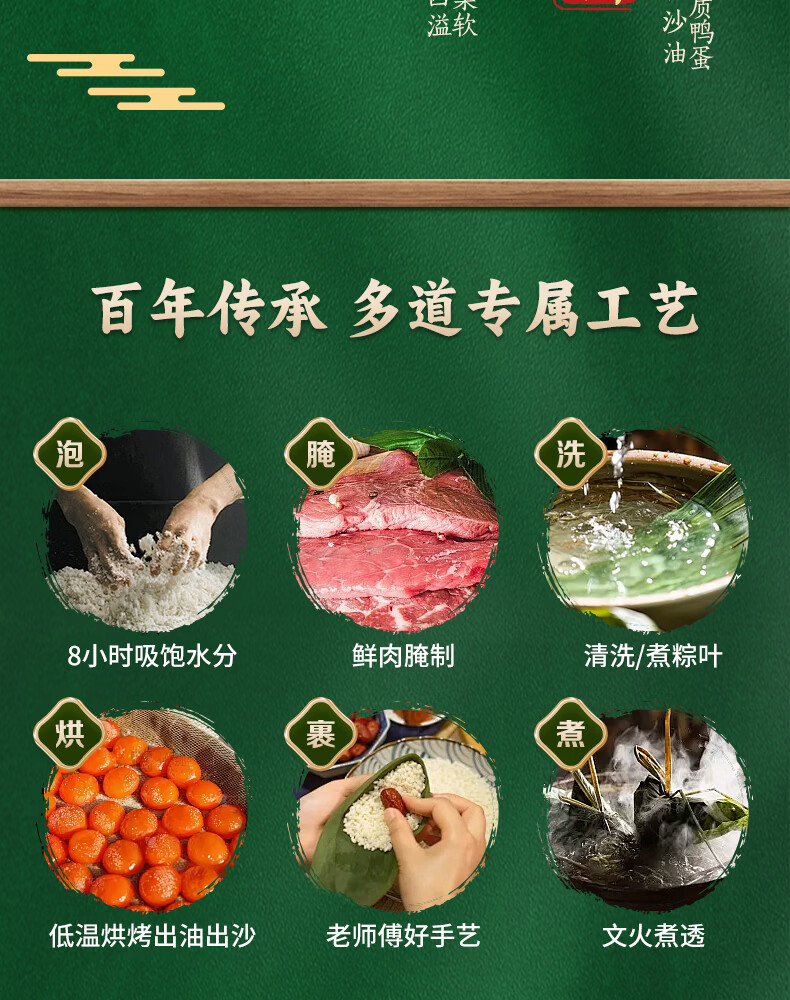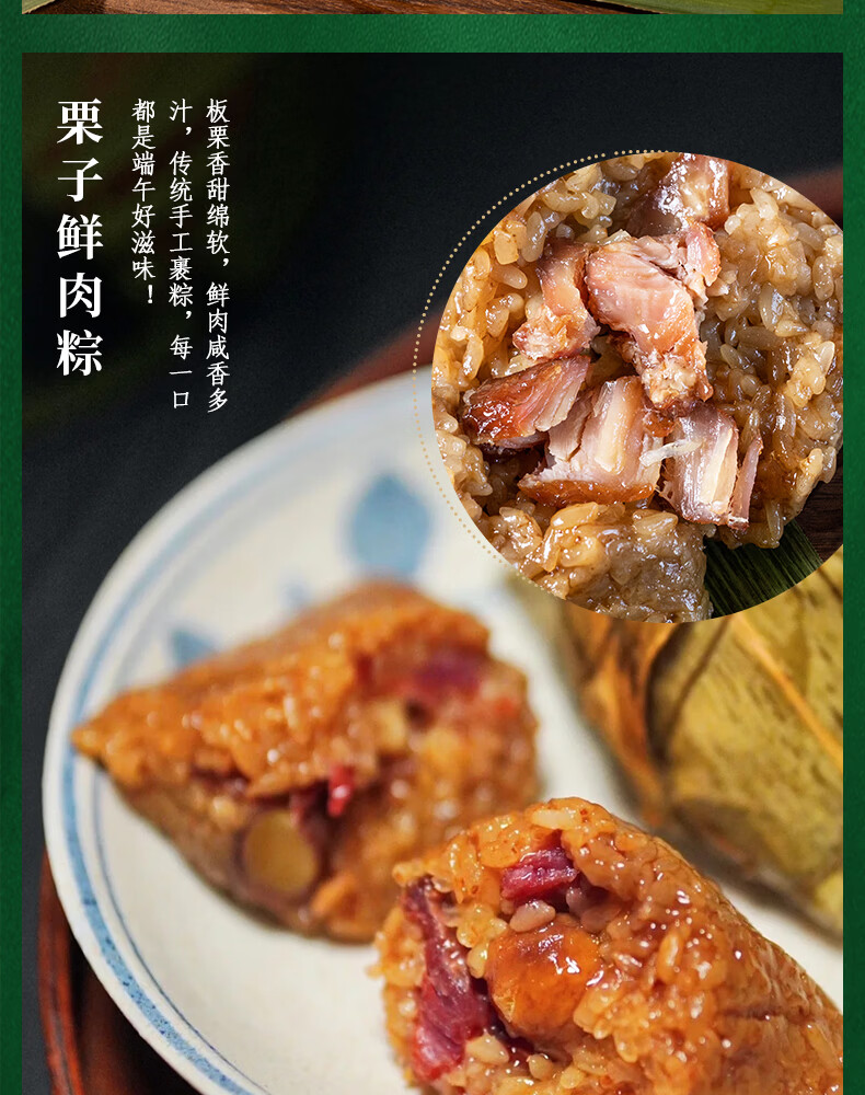 首批中华老字号、山姆认证工厂、嘉兴粽子代表品牌;选用江南当季新糯米、高山鲜粽叶、本地冷鲜猪腿肉;传统裹粽技艺、高温灭菌无添加更健康