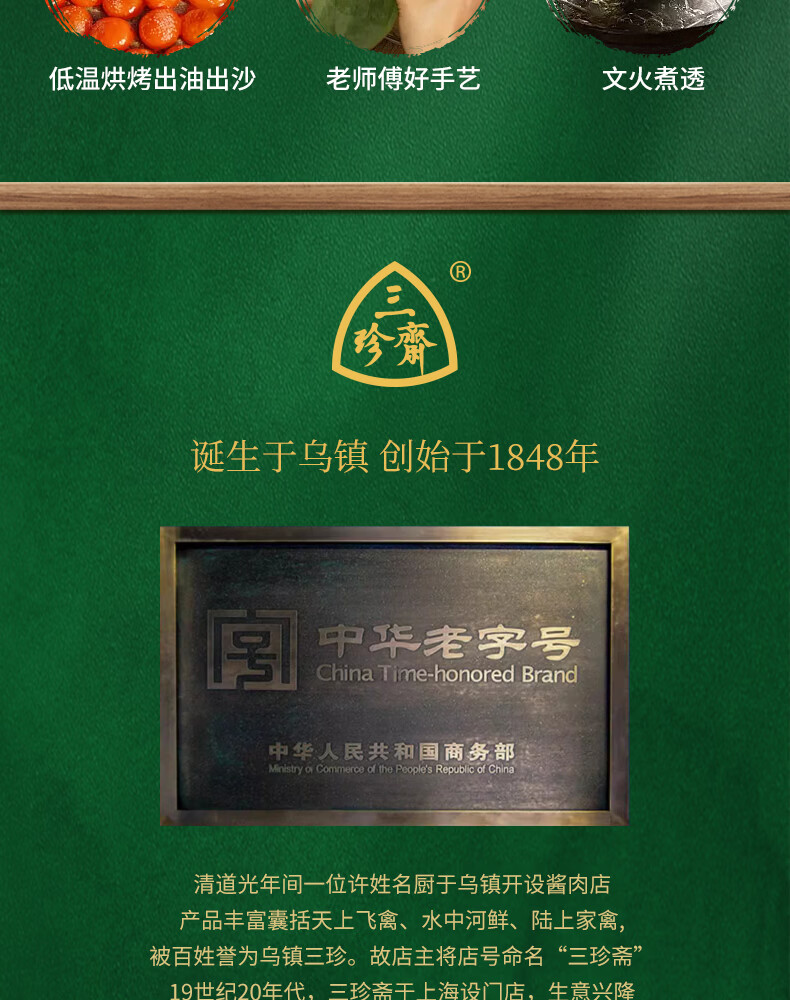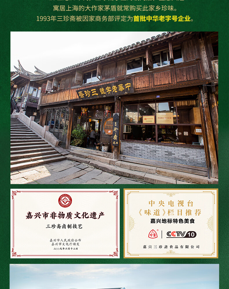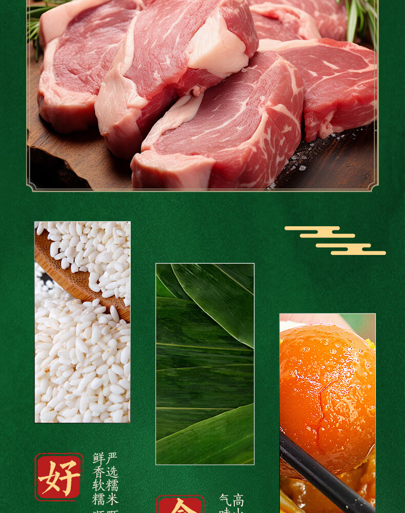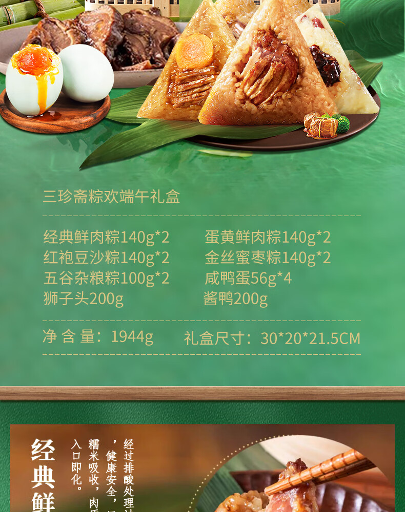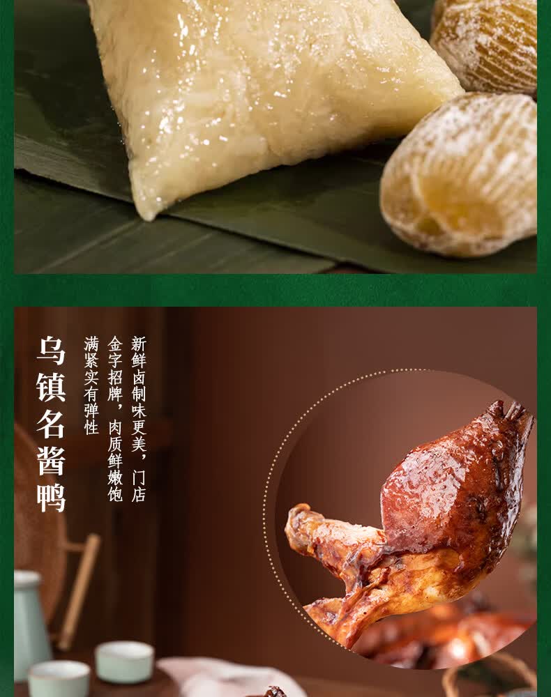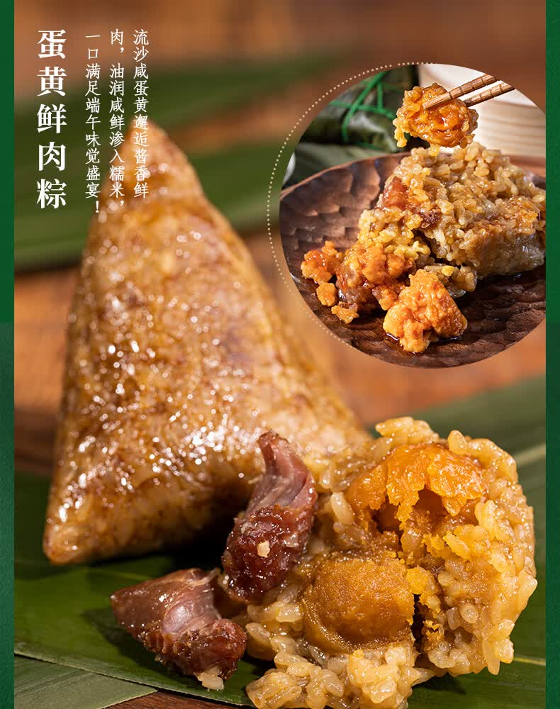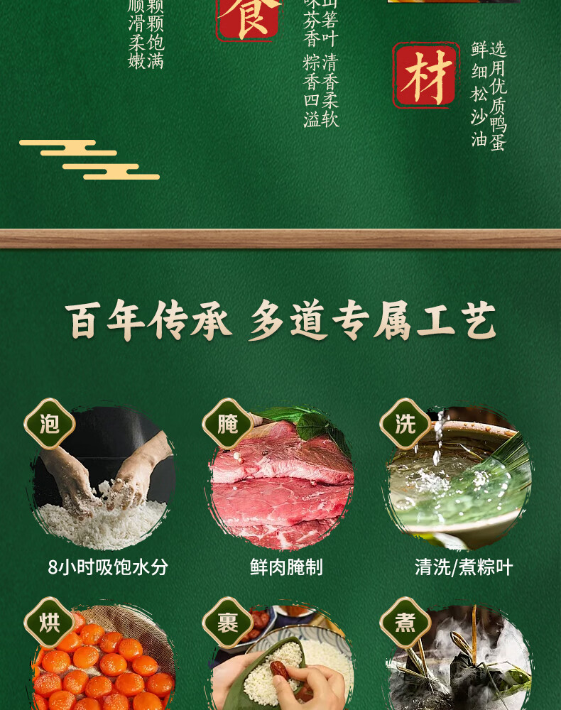 首批中华老字号、山姆认证工厂、嘉兴粽子代表品牌;选用江南当季新糯米、高山鲜粽叶、本地冷鲜猪腿肉;传统裹粽技艺、高温灭菌无添加更健康