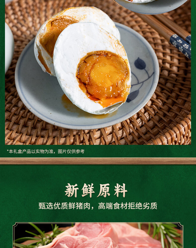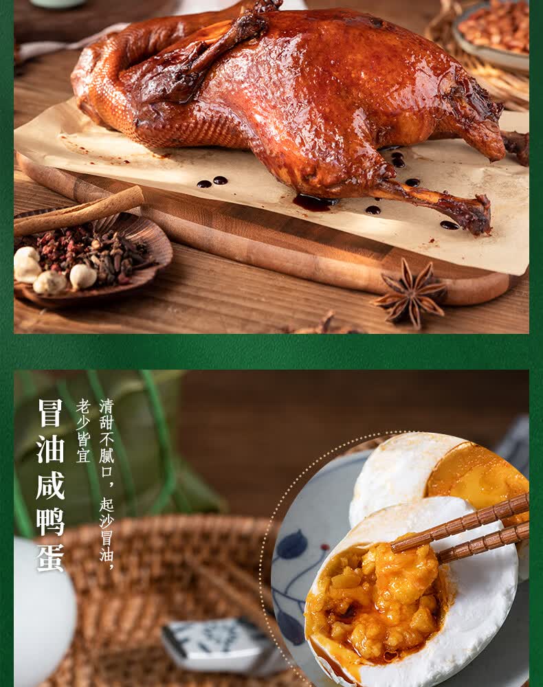 配置清单:经典鲜肉粽140g*2 蛋黄鲜肉粽140g*2 红袍豆沙粽140g*2 金丝蜜枣粽140g*2 五谷杂粮粽100g*2 咸鸭蛋56g*4 酱鸭200g 狮子头200g