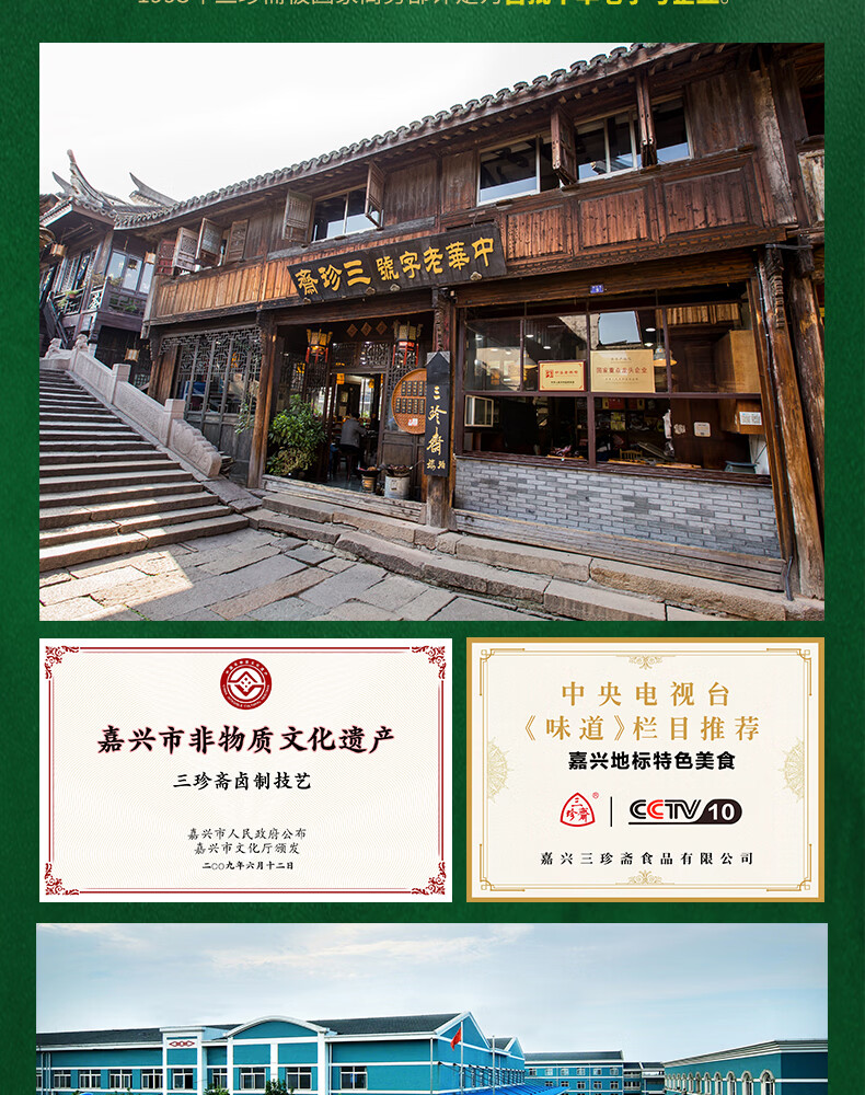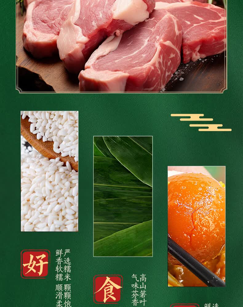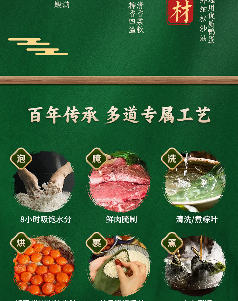 首批中华老字号、山姆认证工厂、嘉兴粽子代表品牌;选用江南当季新糯米、高山鲜粽叶、本地冷鲜猪腿肉;传统裹粽技艺、高温灭菌无添加更健康