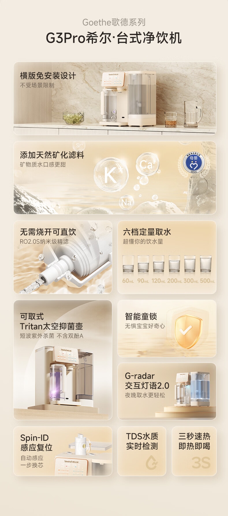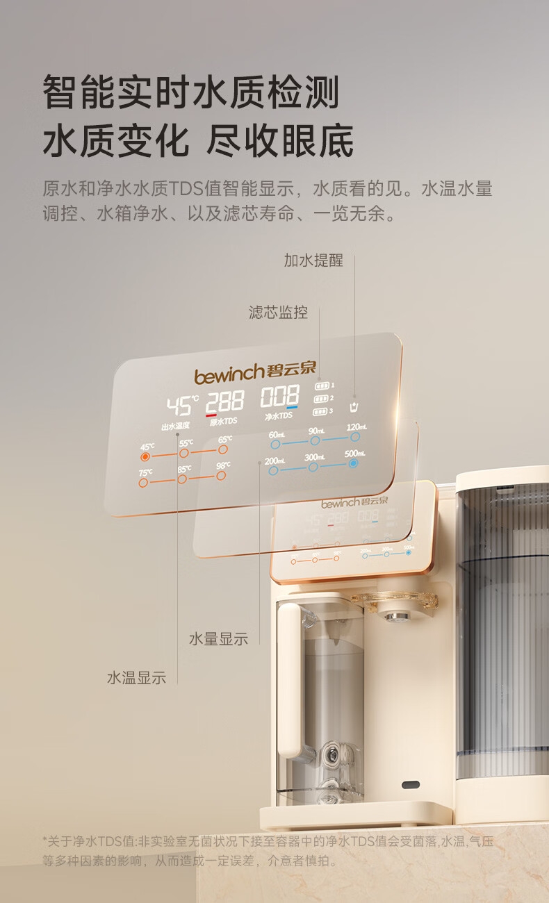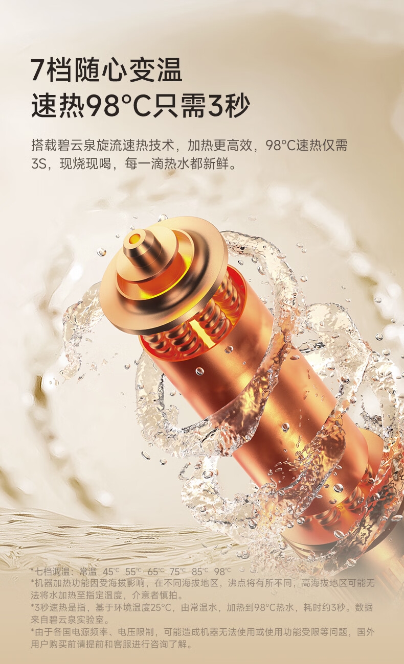 7档变温,速热98度只需3秒 ;智能定制,饮水管家 ;触控设计,净化加热一步到位