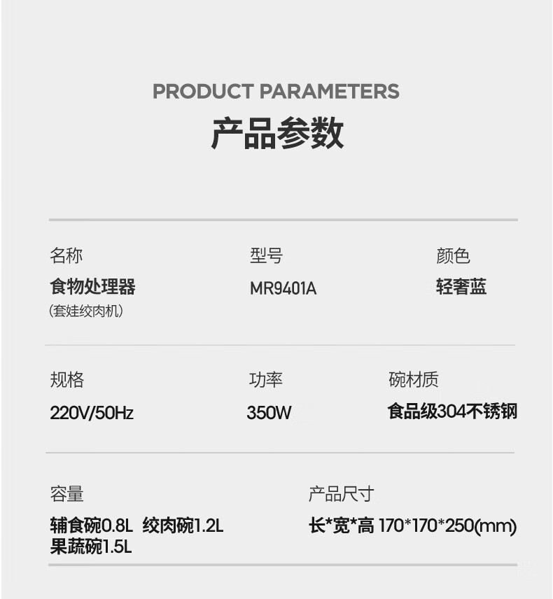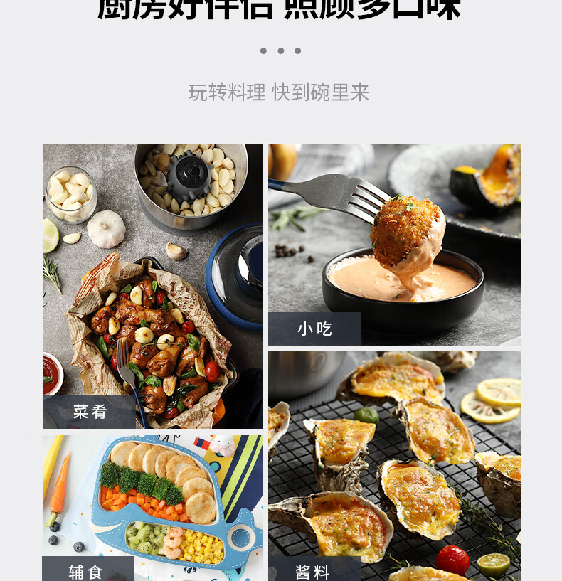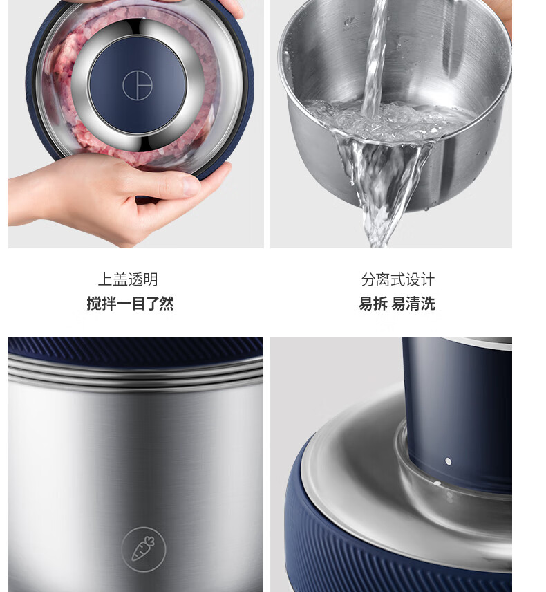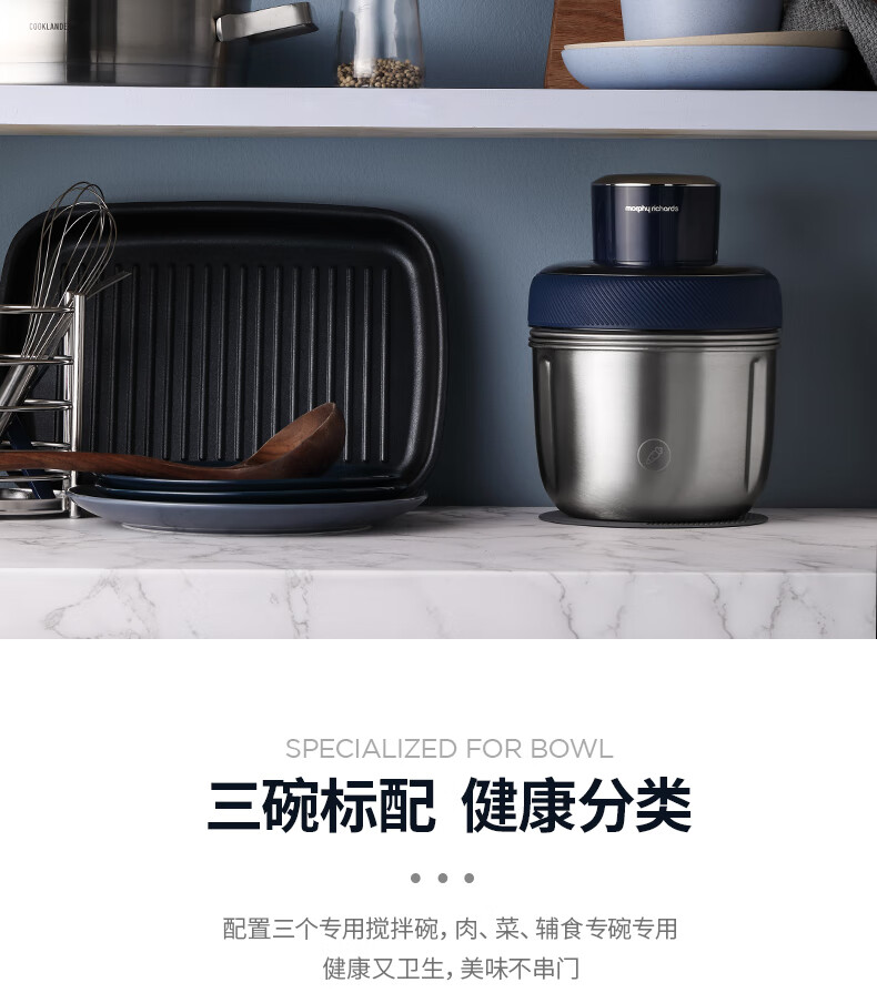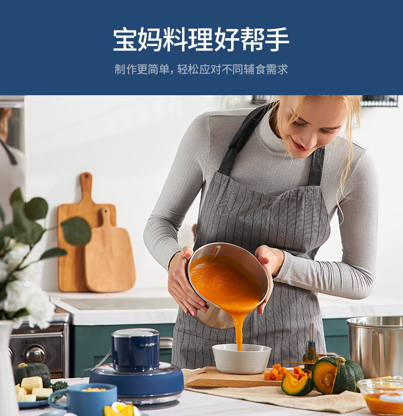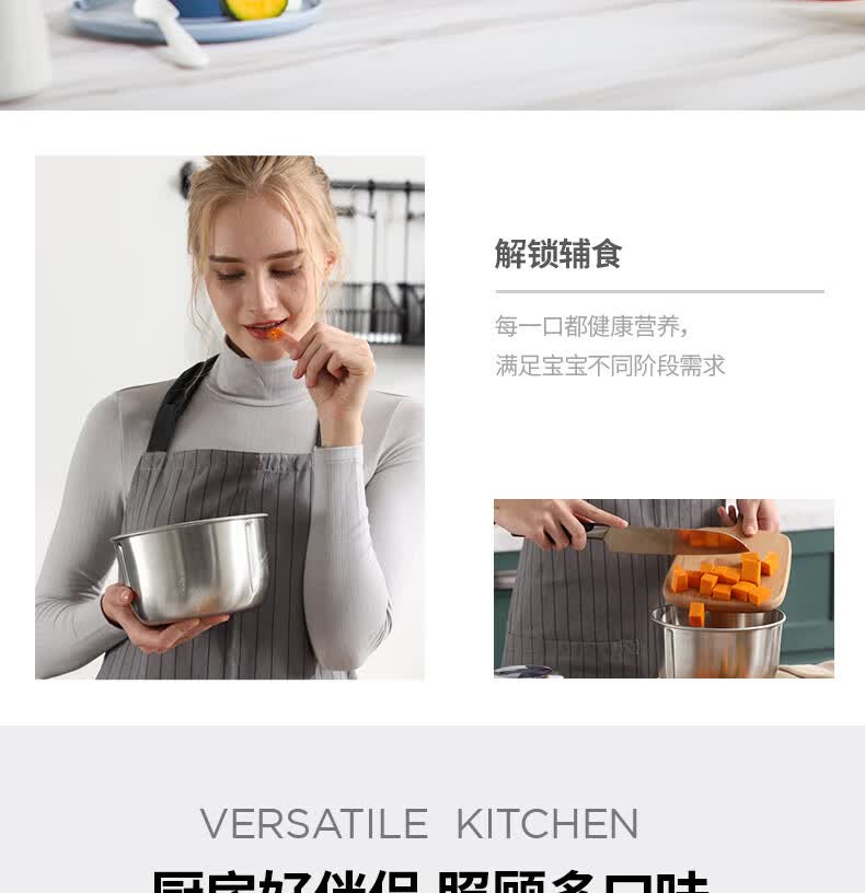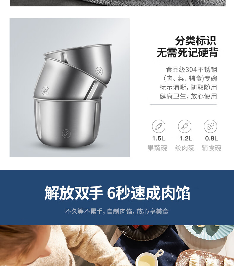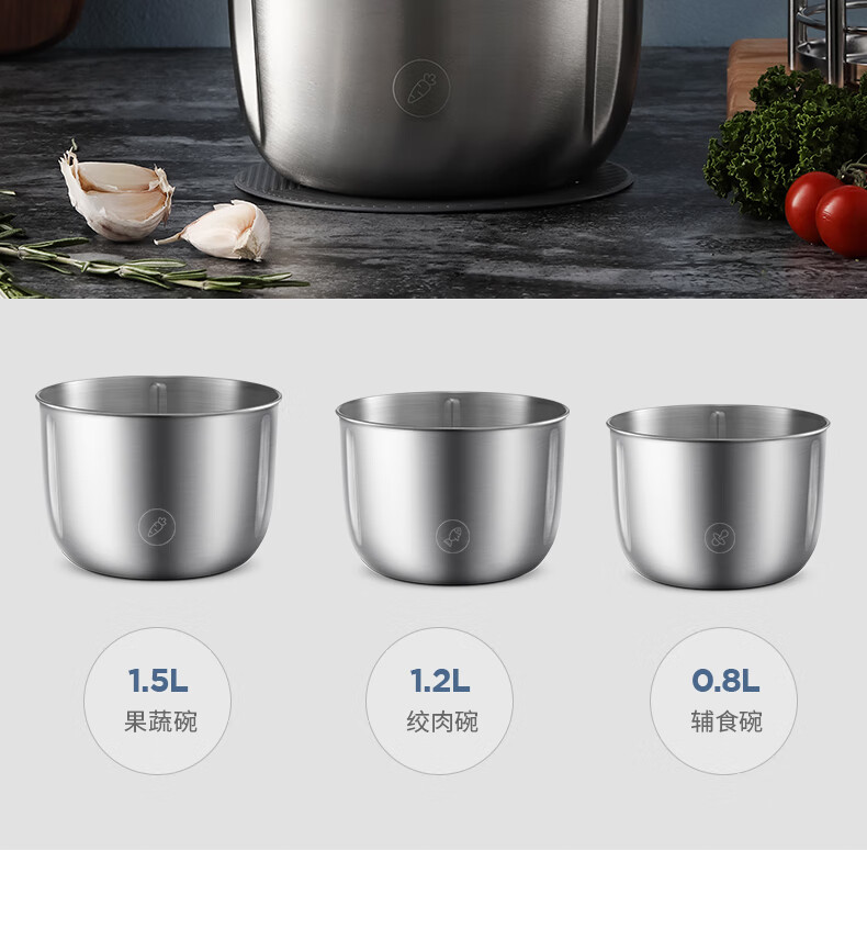 低噪音运行;一键懒人操作;婴儿辅食、蔬菜、肉类专碗专用